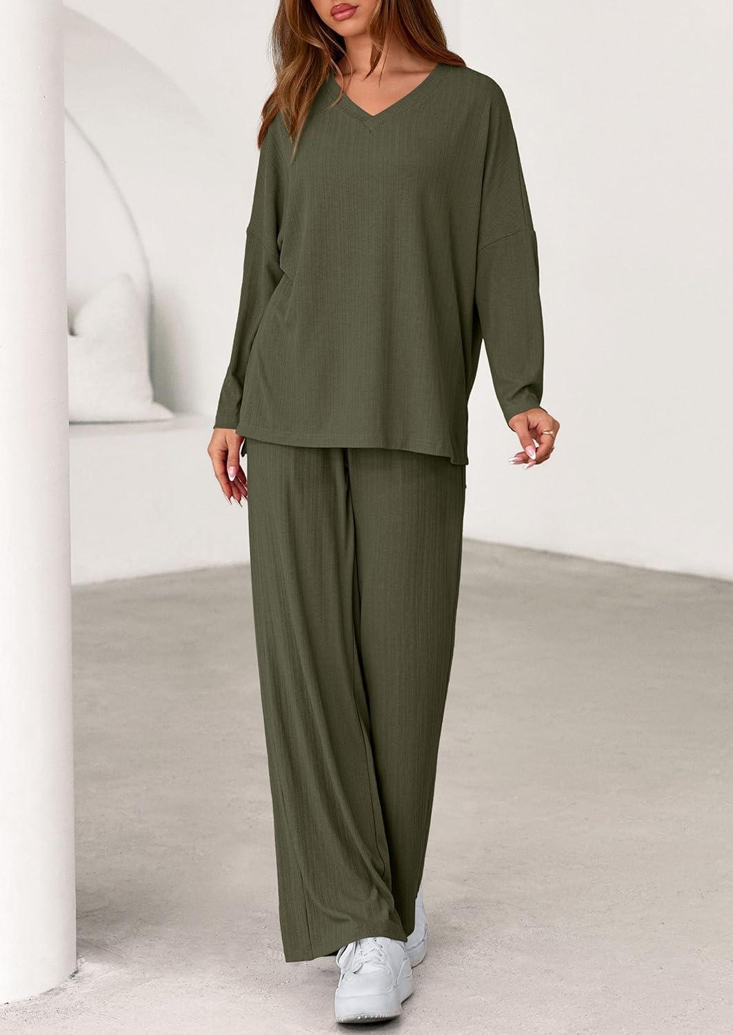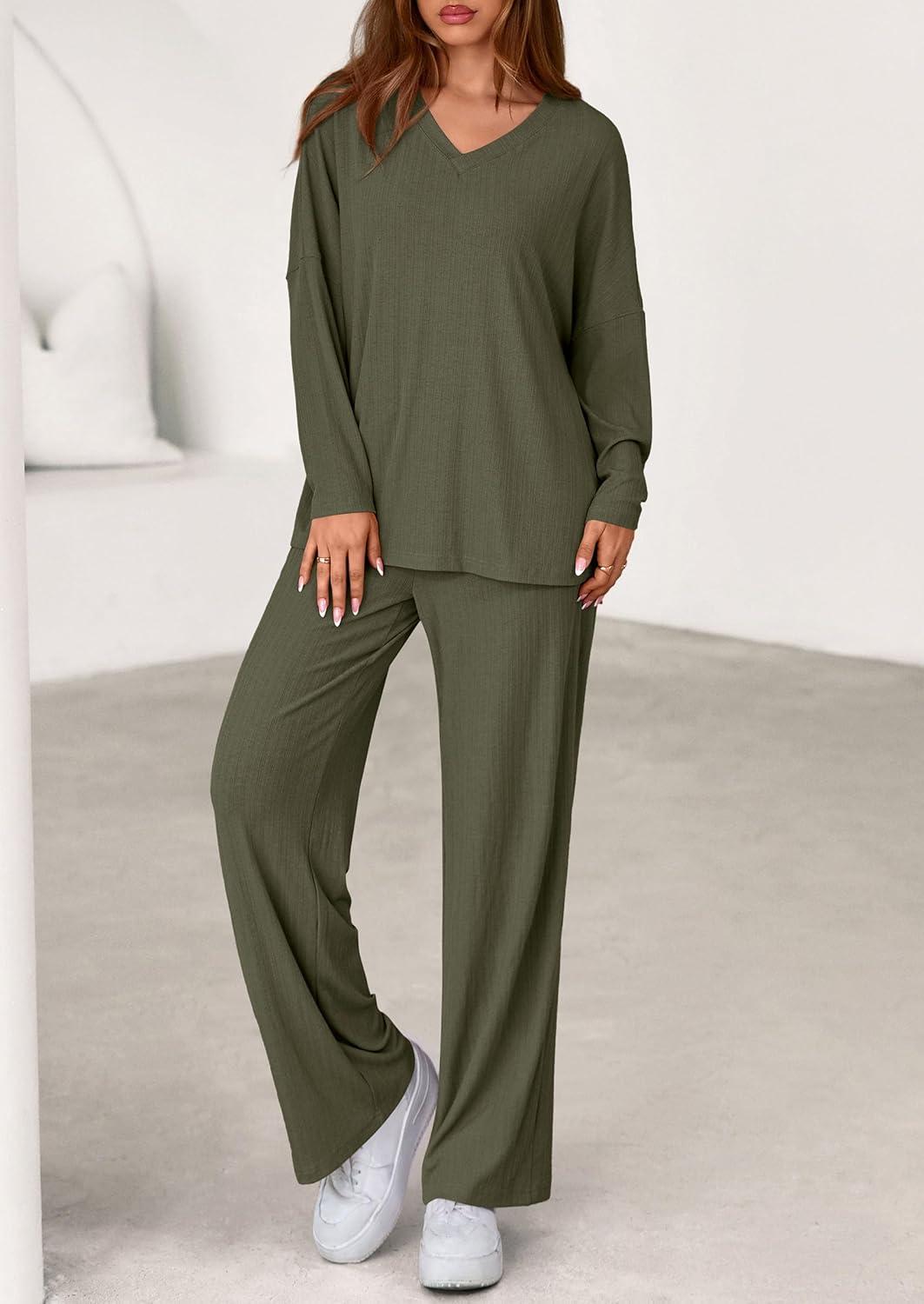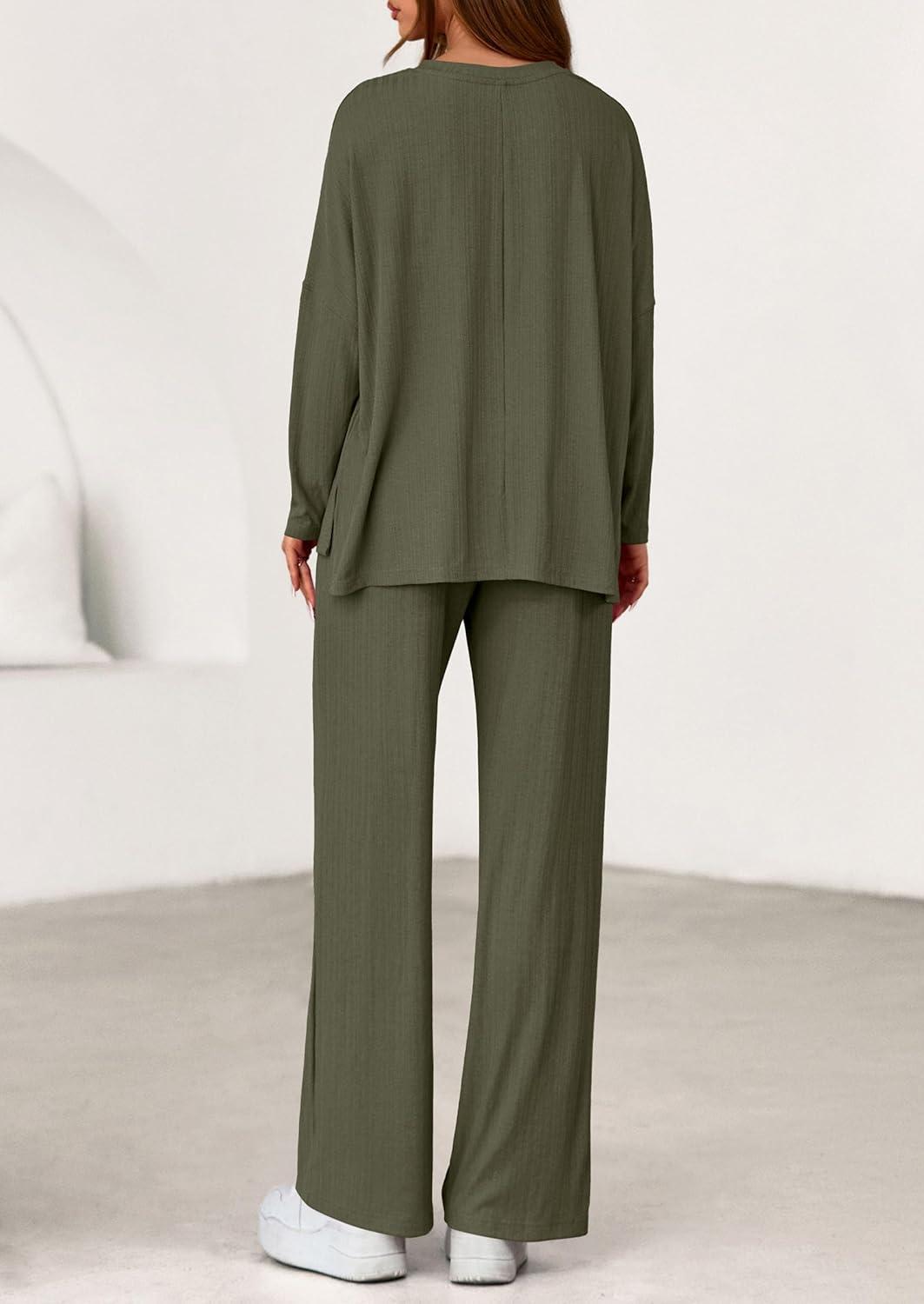 PRETTYGARDEN 2 Piece Lounge Sets for Women Fall Outfits 2025 Casual Loose Long Sleeve Tops Wide Leg Pants Matching Pajama Set(Grey Green)
