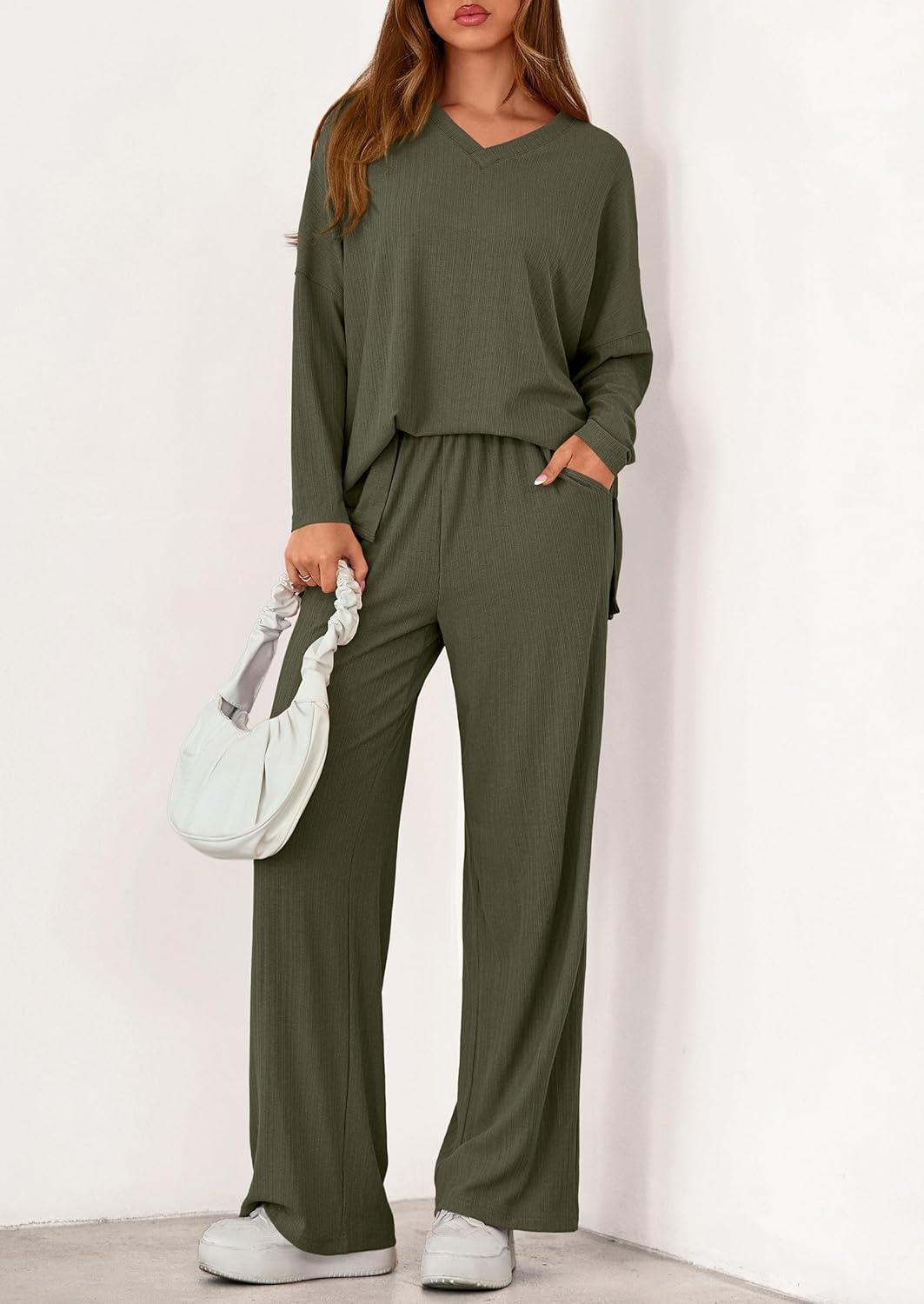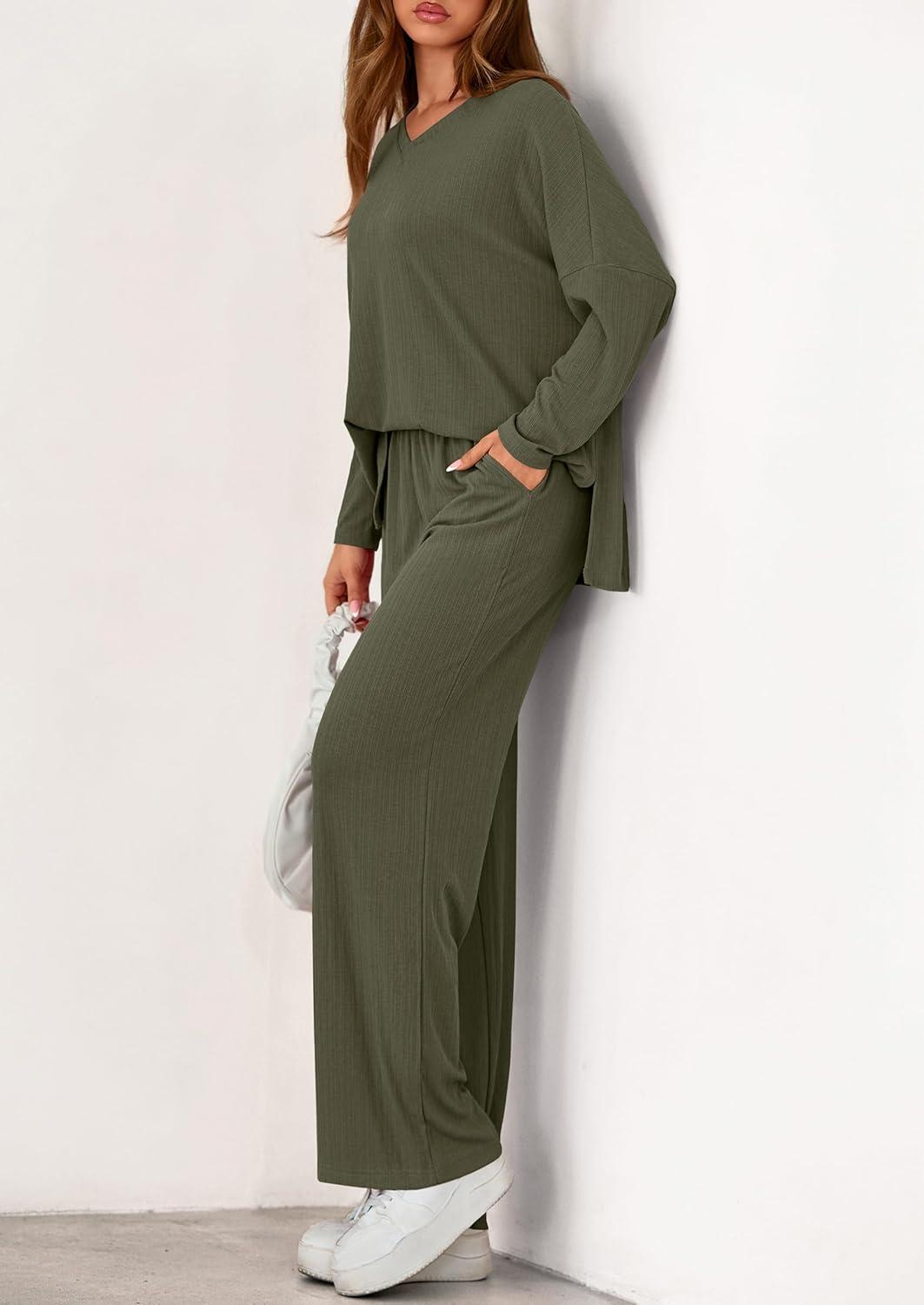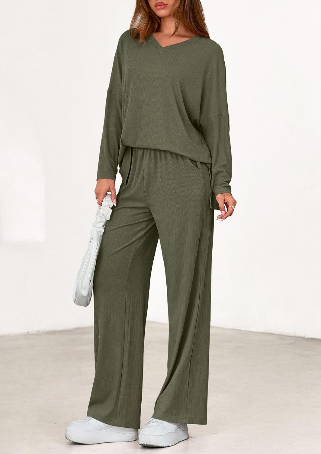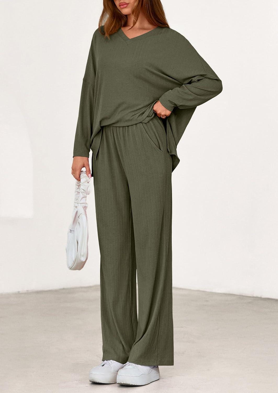 PRETTYGARDEN 2 Piece Lounge Sets for Women Fall Outfits 2025 Casual Loose Long Sleeve Tops Wide Leg Pants Matching Pajama Set(Grey Green)