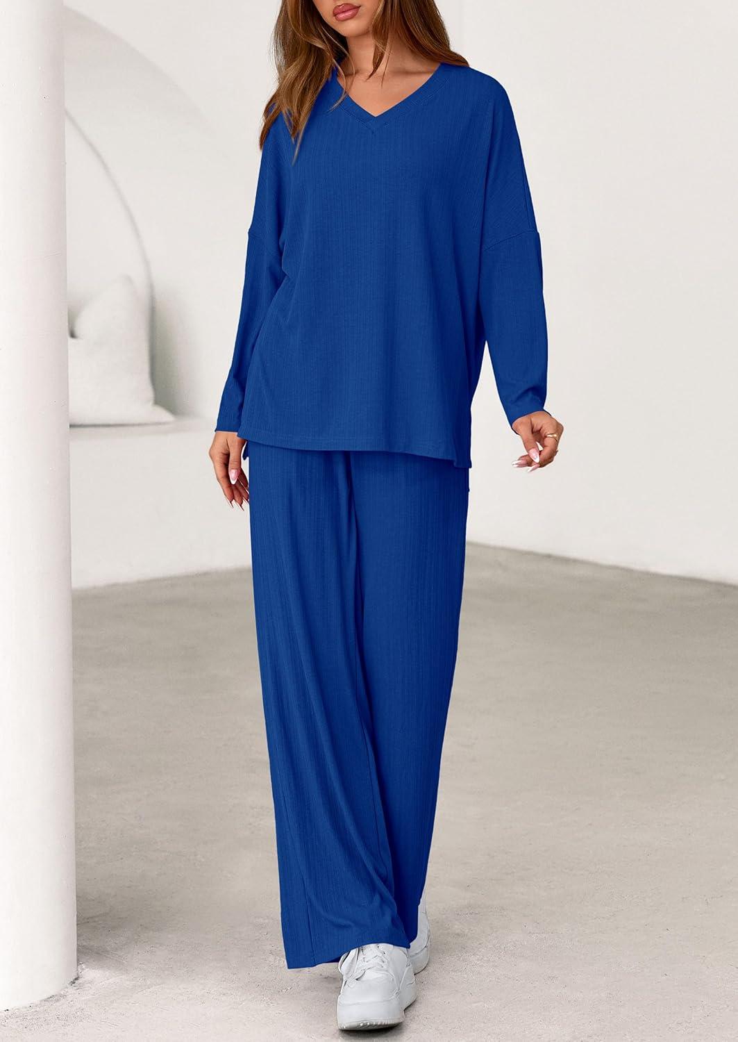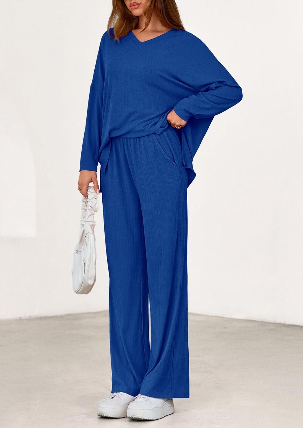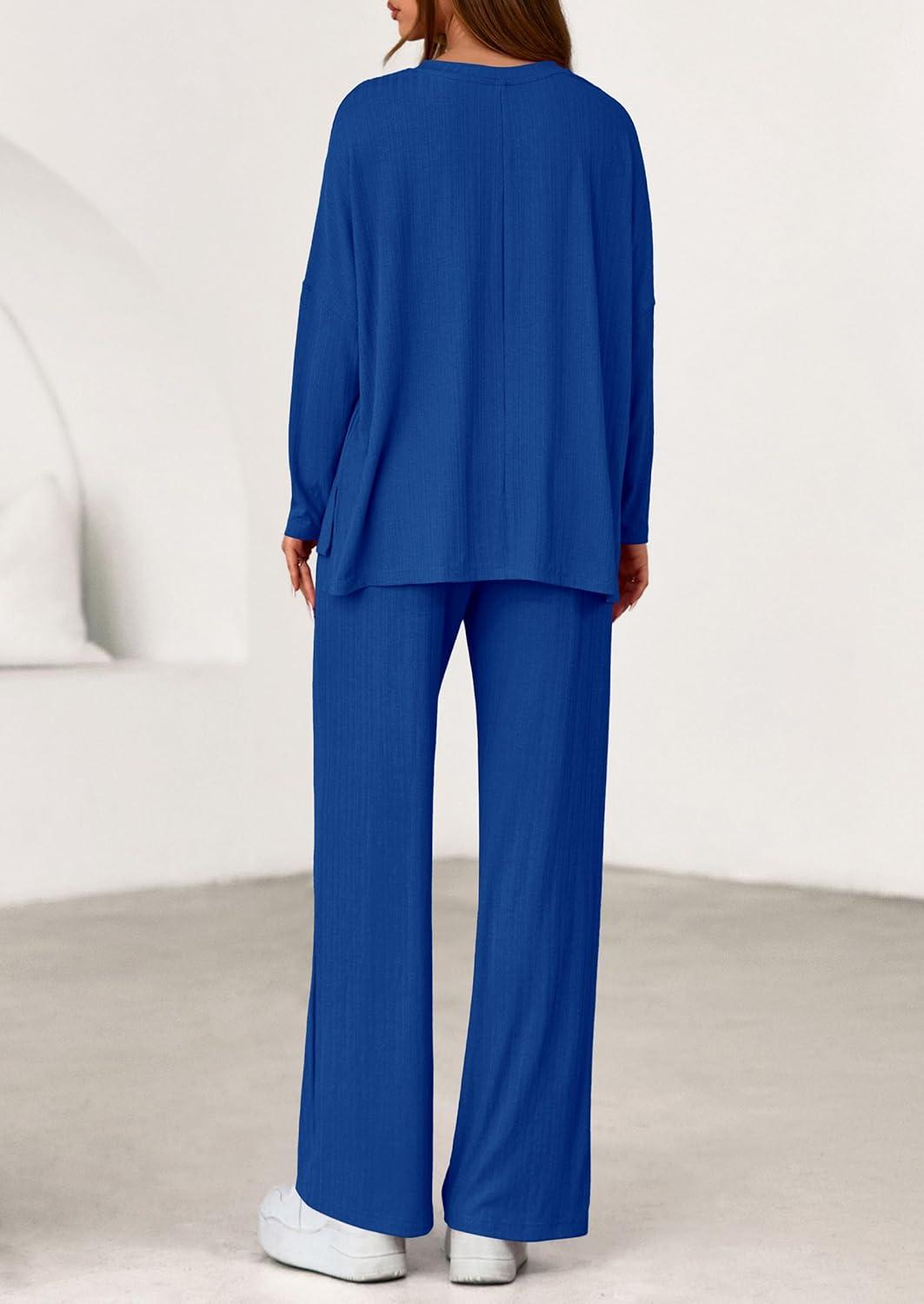 PRETTYGARDEN 2 Piece Lounge Sets for Women Fall Outfits 2025 Casual Loose Long Sleeve Tops Wide Leg Pants Matching Pajama Set(Royal Blue)