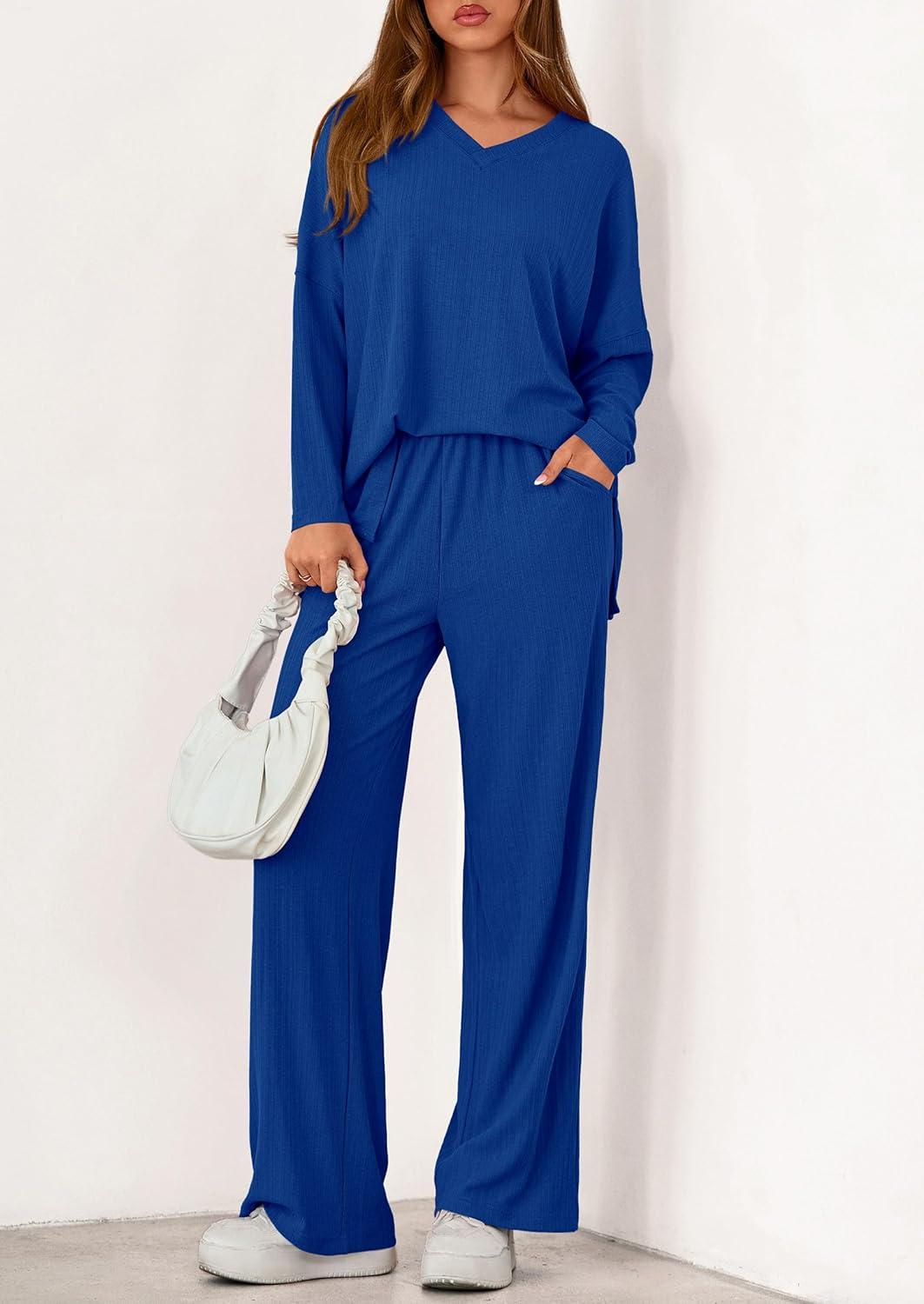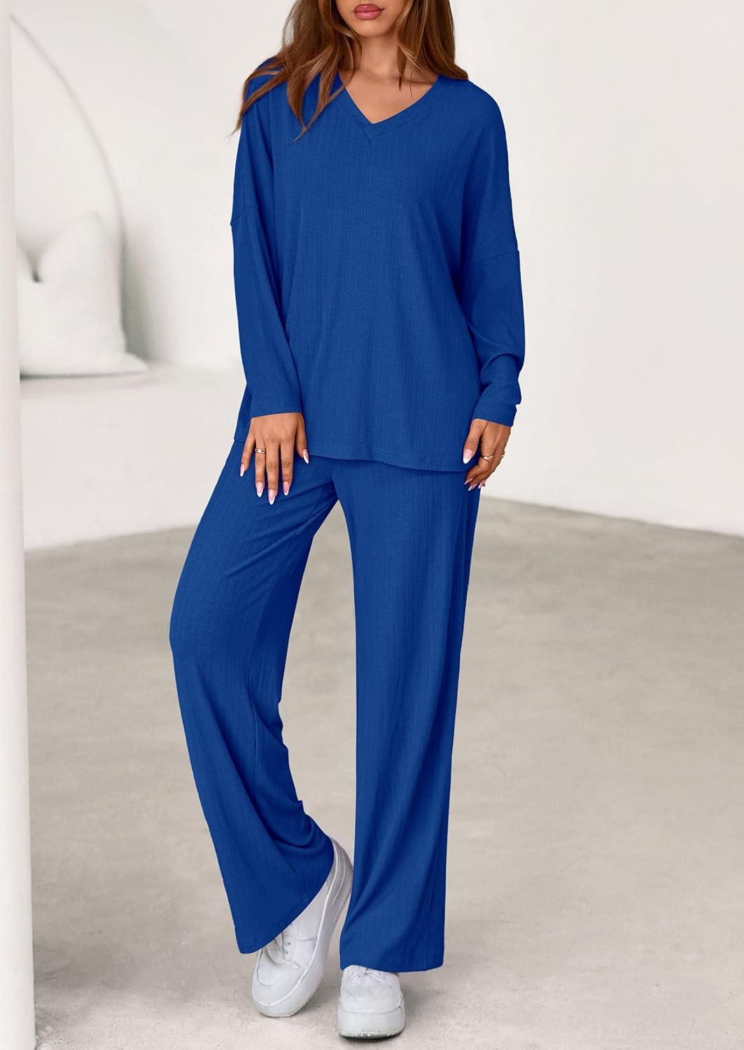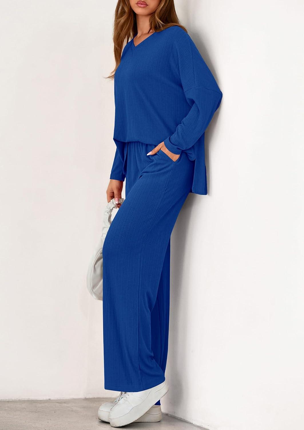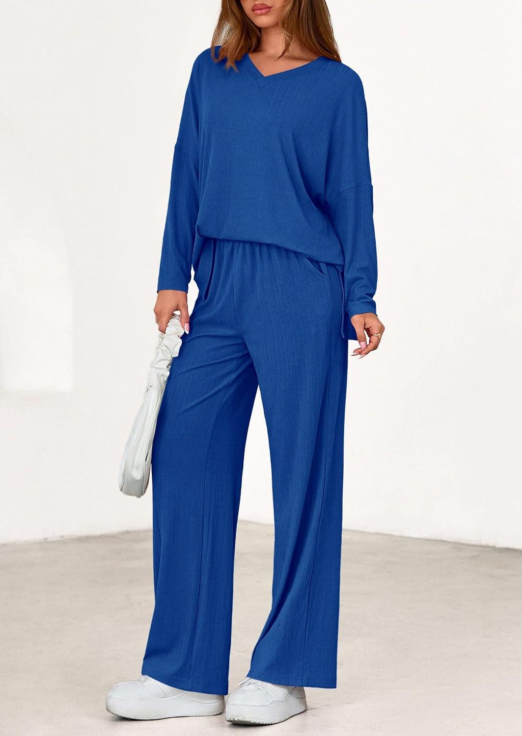 PRETTYGARDEN 2 Piece Lounge Sets for Women Fall Outfits 2025 Casual Loose Long Sleeve Tops Wide Leg Pants Matching Pajama Set(Royal Blue)