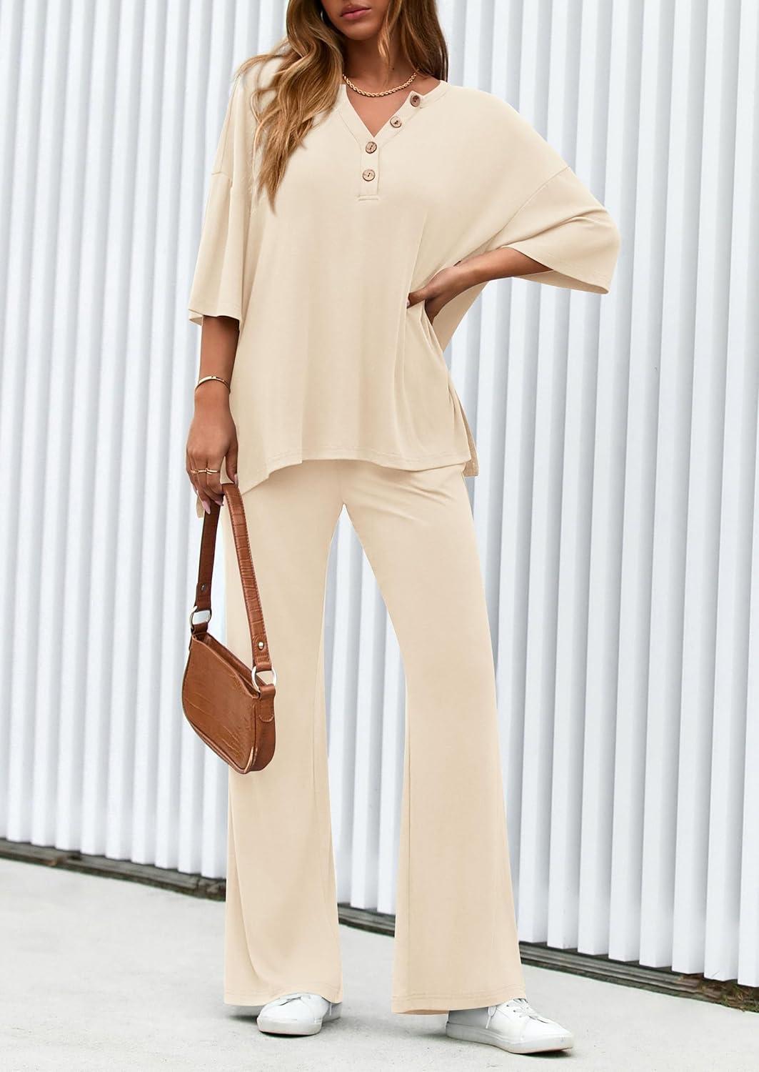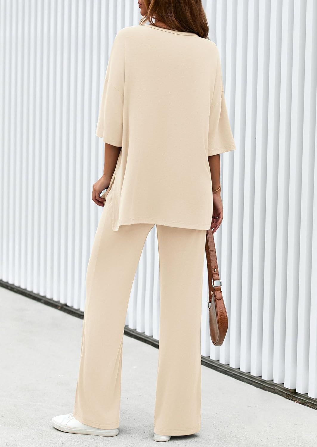 PRETTYGARDEN 2 Piece Lounge Sets for Women Summer 2025 Short Sleeve Tops Wide Leg Pants Matching Travel Outfits Clothing(Beige)