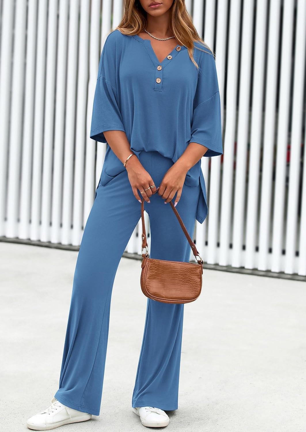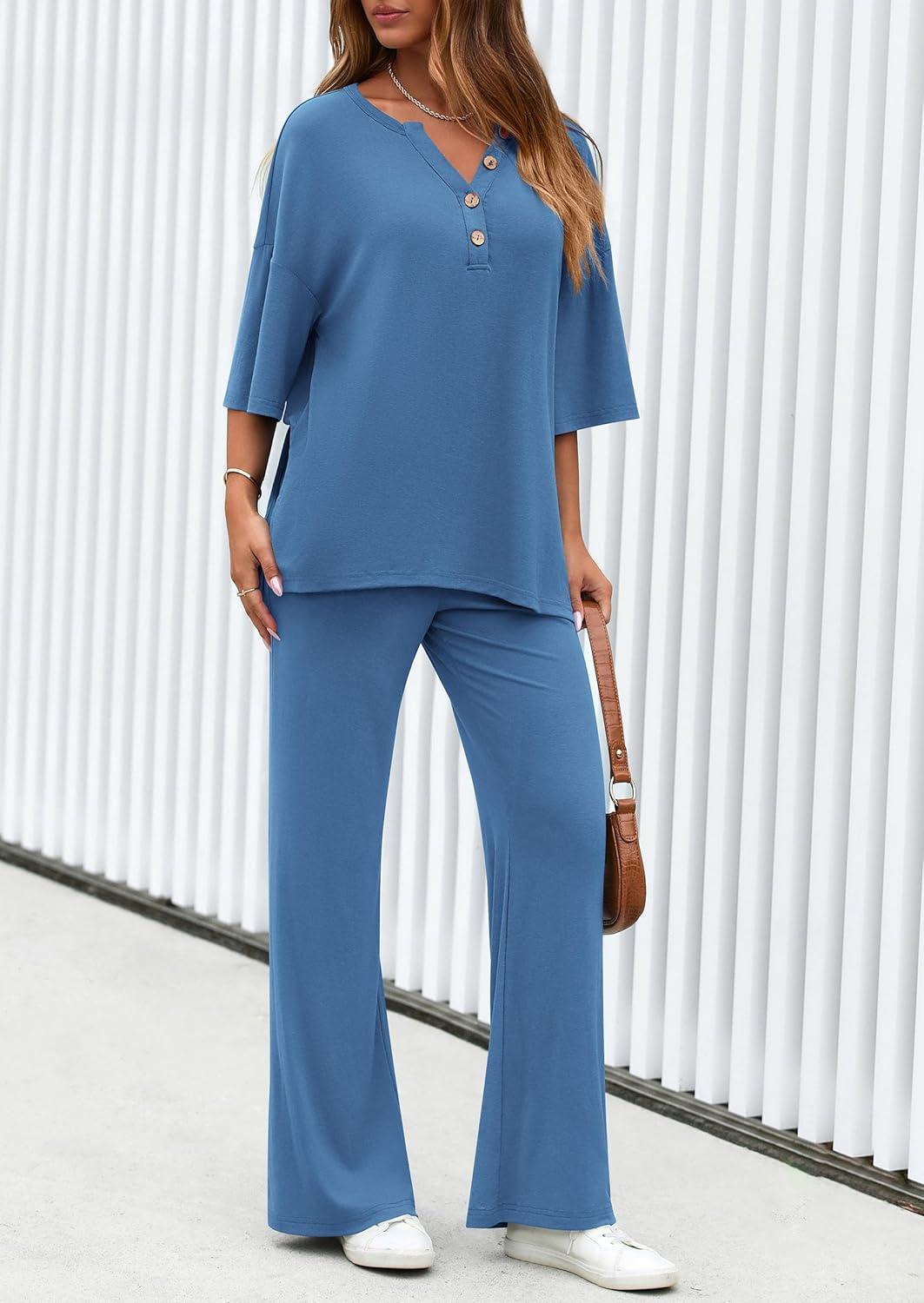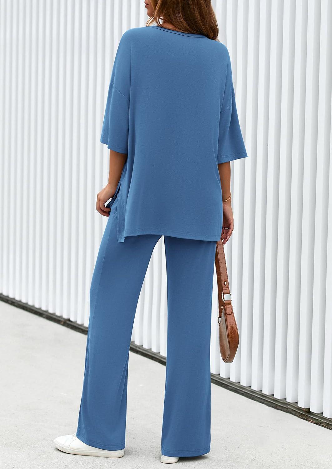 PRETTYGARDEN 2 Piece Lounge Sets for Women Summer 2025 Short Sleeve Tops Wide Leg Pants Matching Travel Outfits Clothing(Blue)