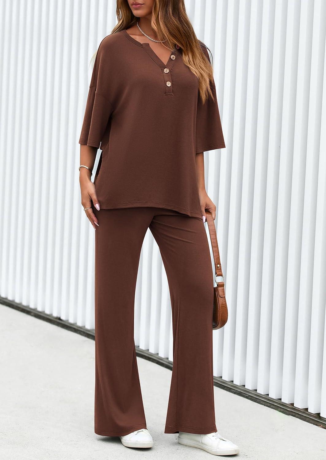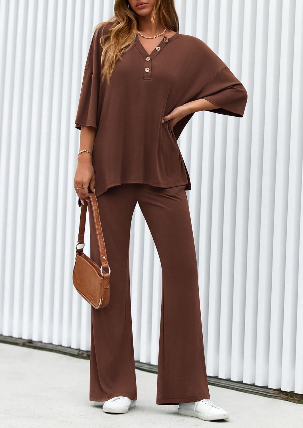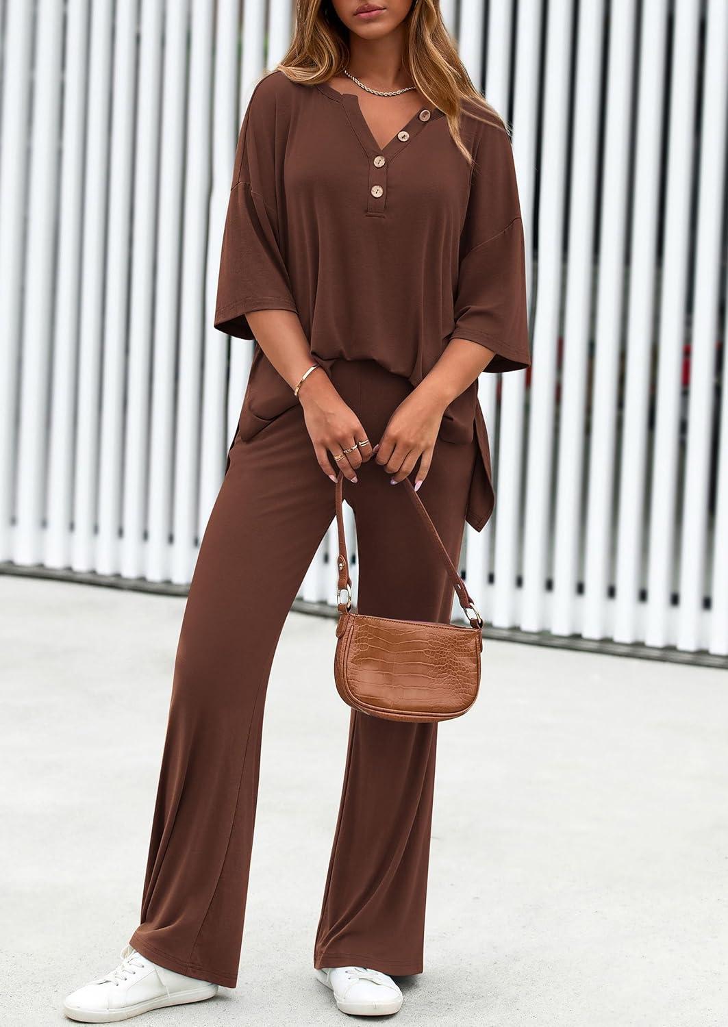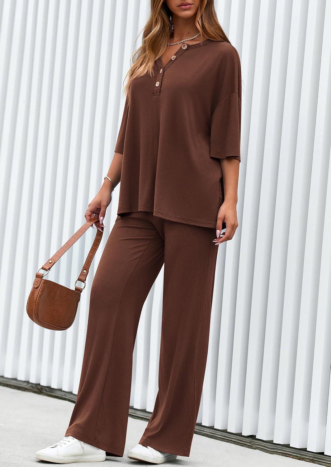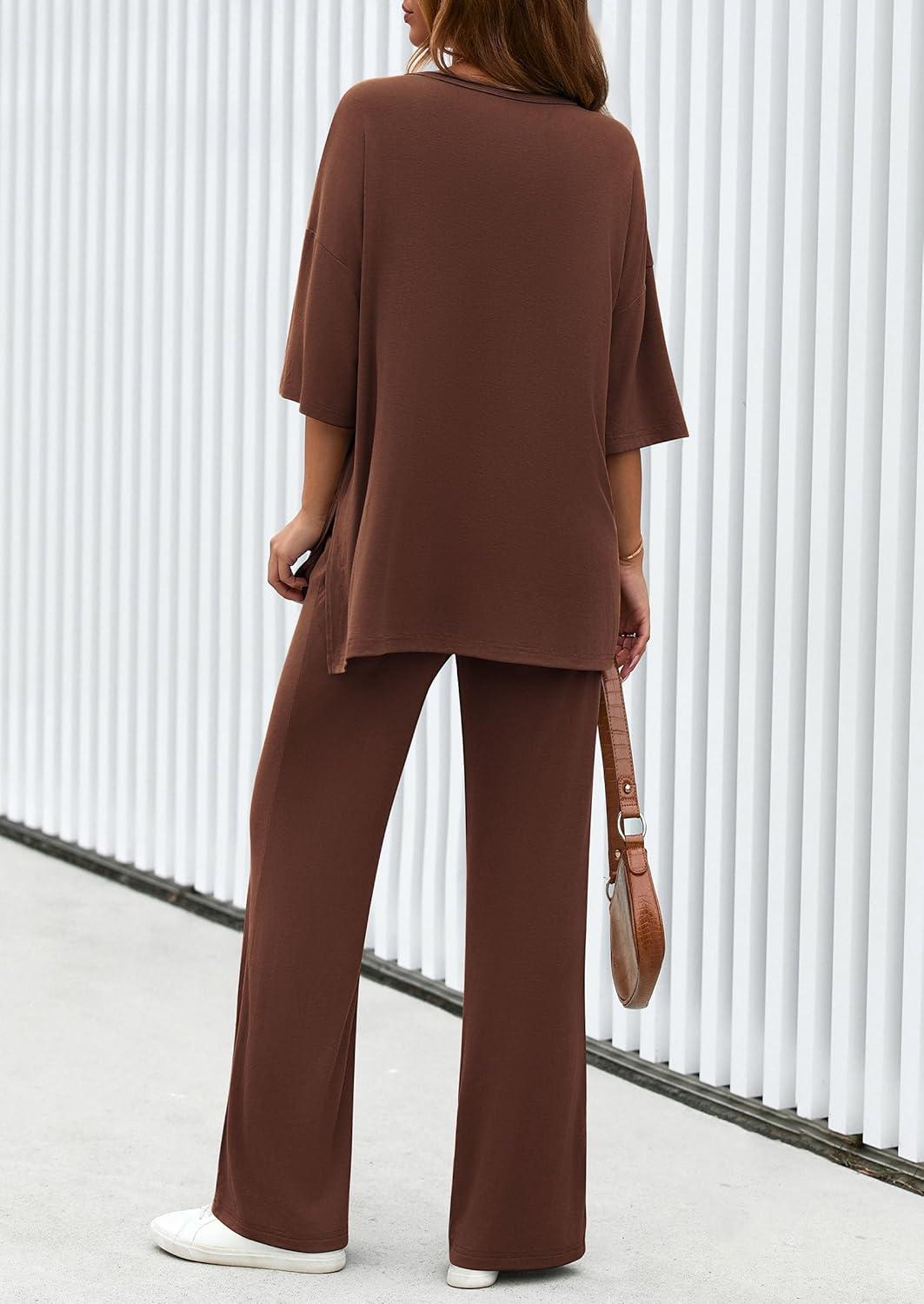 PRETTYGARDEN 2 Piece Lounge Sets for Women Summer 2025 Short Sleeve Tops Wide Leg Pants Matching Travel Outfits Clothing(Brown)
