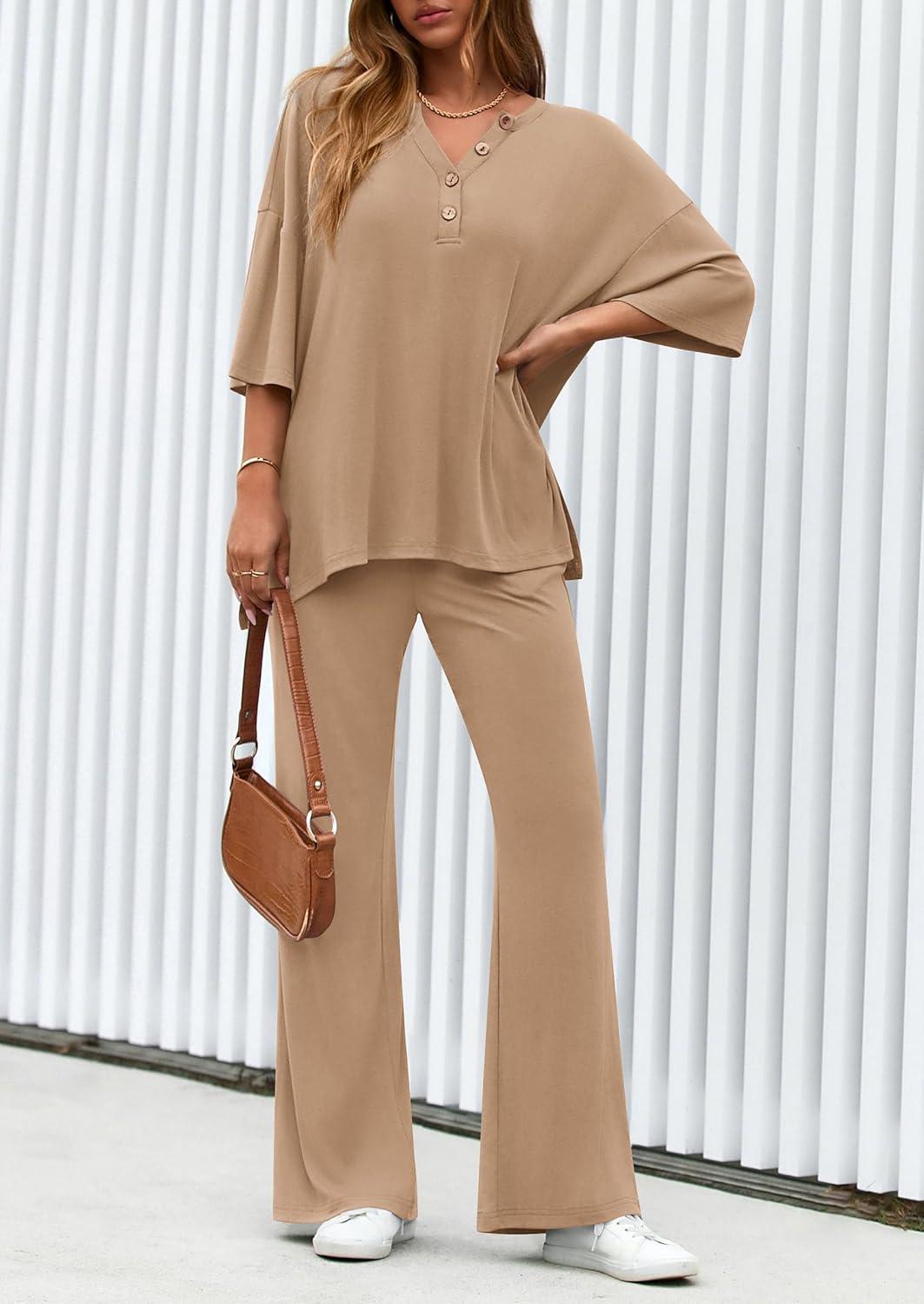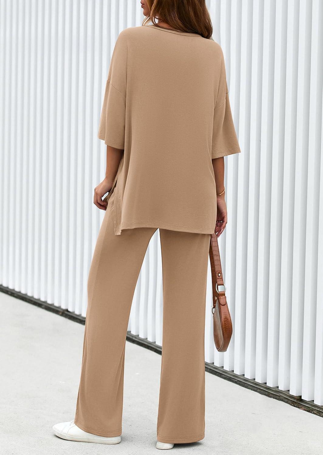 PRETTYGARDEN 2 Piece Lounge Sets for Women Summer 2025 Short Sleeve Tops Wide Leg Pants Matching Travel Outfits Clothing(Khaki)