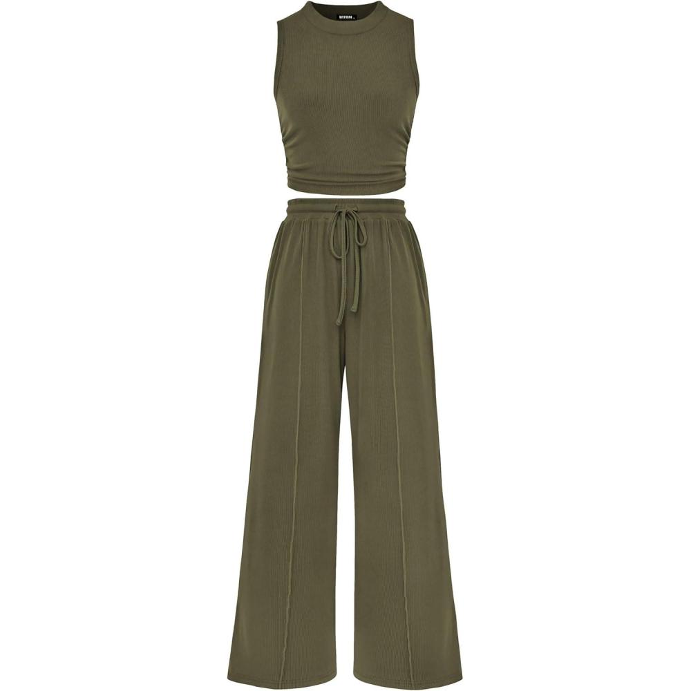 PRETTYGARDEN 2 Piece Sets for Women 2025 Summer Sleeveless Tank Ribbed Travel Beach Vacation Spring Lounge Wear Outfits(Army Green)