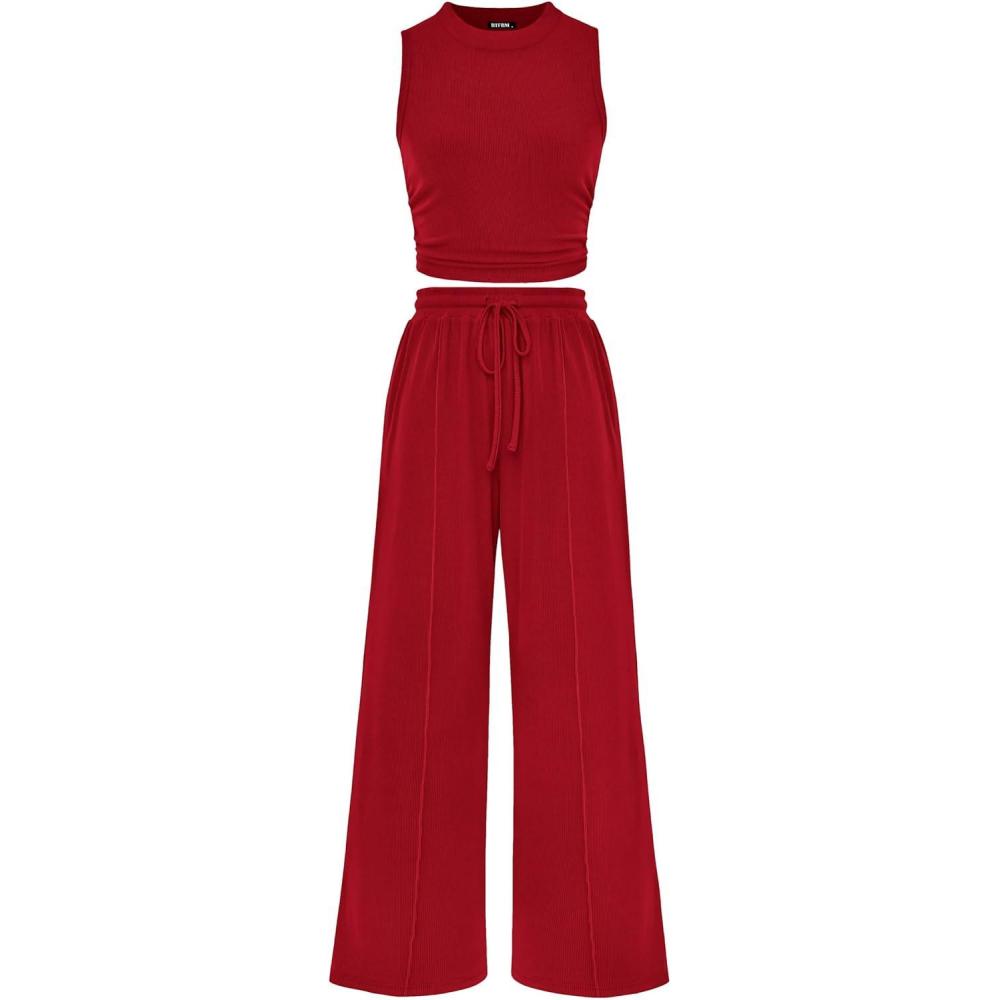 imagePRETTYGARDEN 2 Piece Sets for Women 2025 Summer Sleeveless Tank Ribbed Travel Beach Vacation Spring Lounge Wear OutfitsWine Red