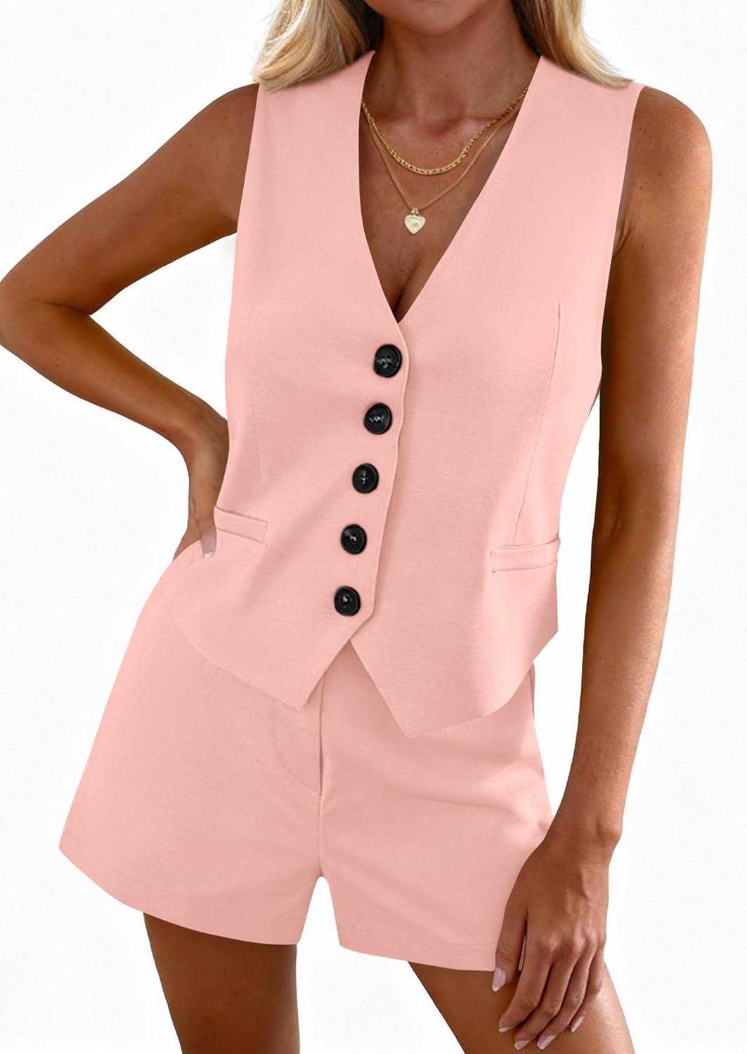 imagePRETTYGARDEN 2 Piece Sets for Women Spring Fashion 2026 Button Vest Tops High Waist Shorts Summer Business Casual OutfitsPink