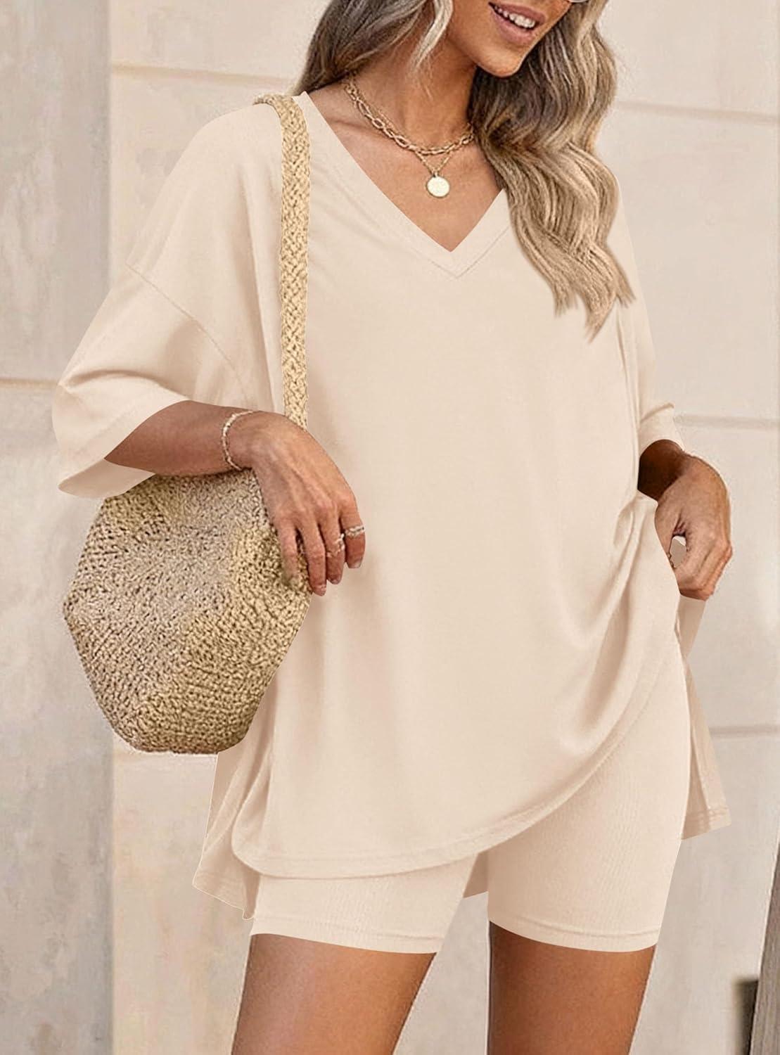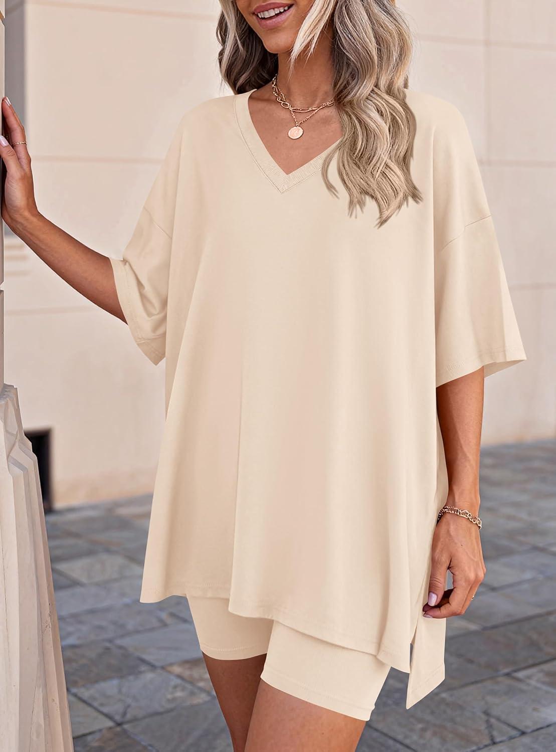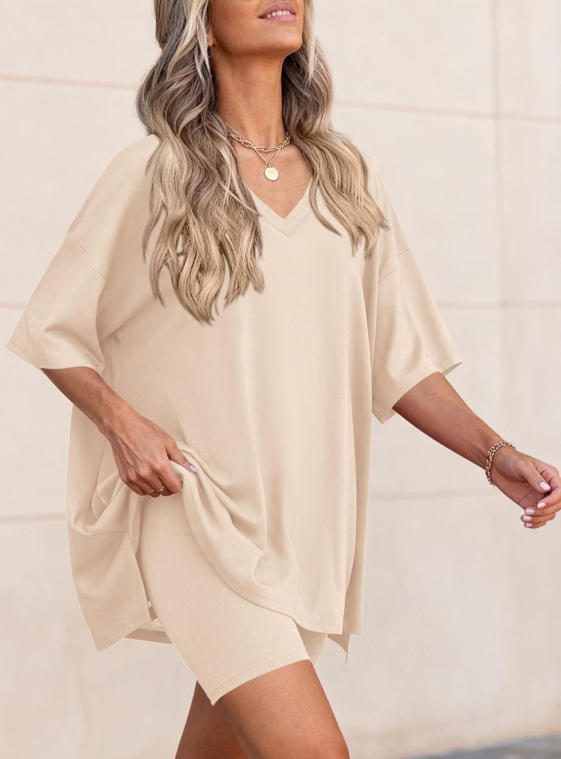 PRETTYGARDEN 2 Piece Sets for Women Summer 2026 Lounge Short Set Spring Matching Biker Shorts V Neck Oversized Shirt Clothing(Beige)