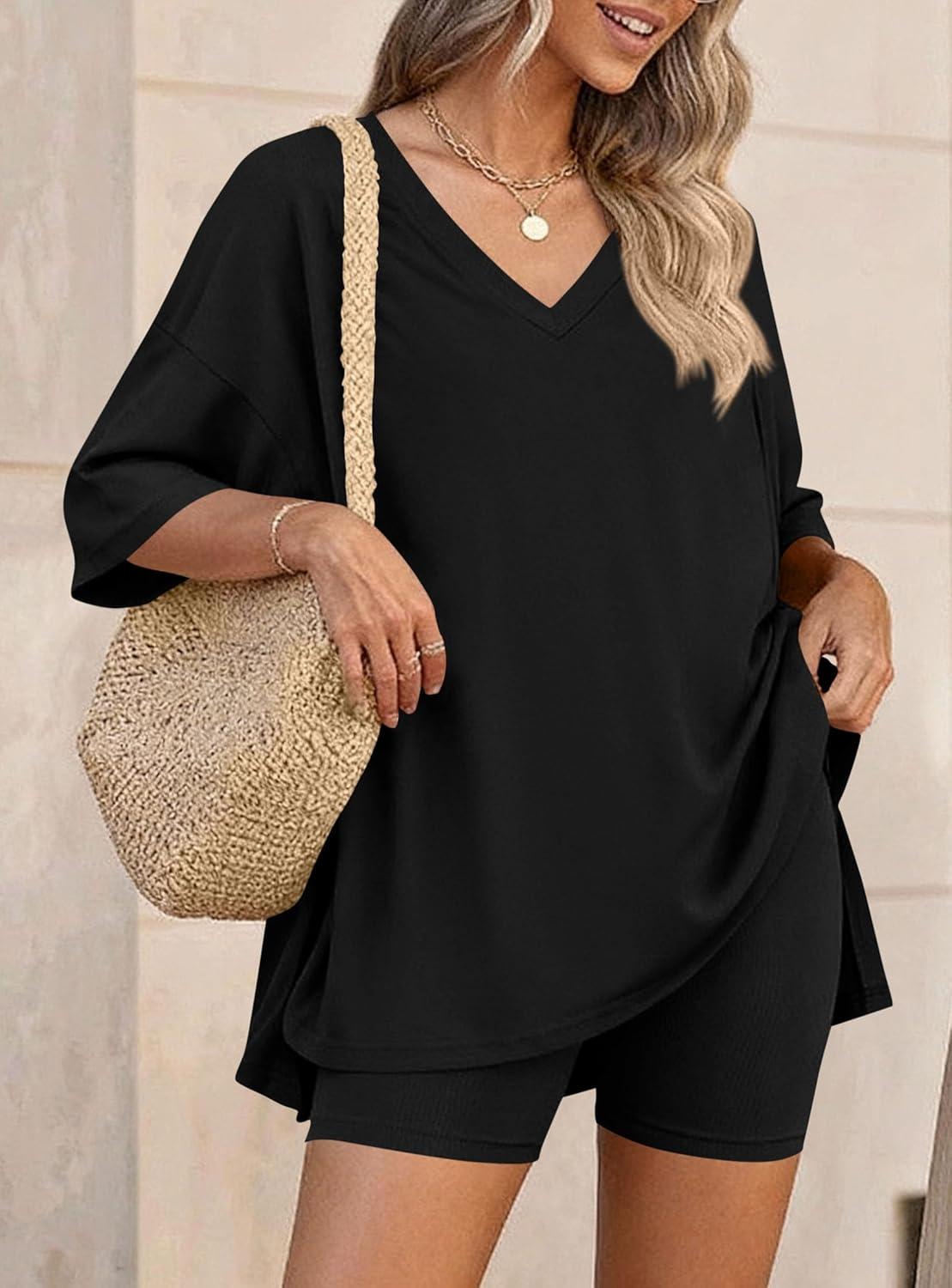 PRETTYGARDEN 2 Piece Sets for Women Summer 2026 Lounge Short Set Spring Matching Biker Shorts V Neck Oversized Shirt Clothing(Black)