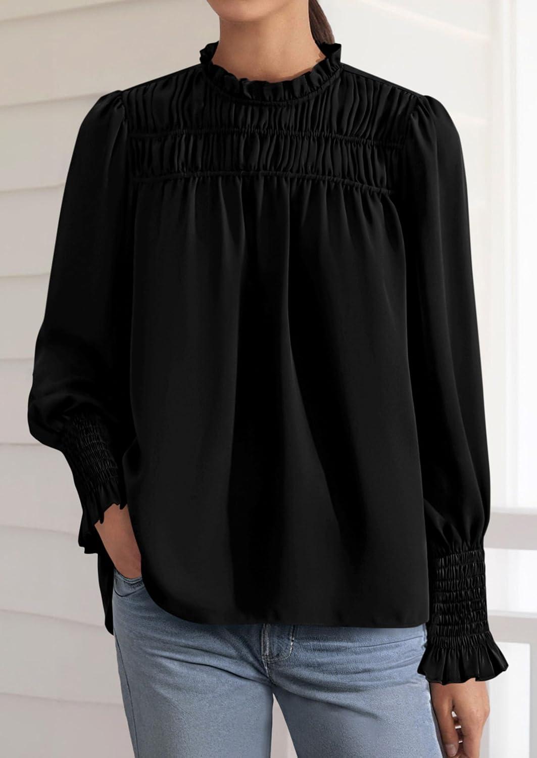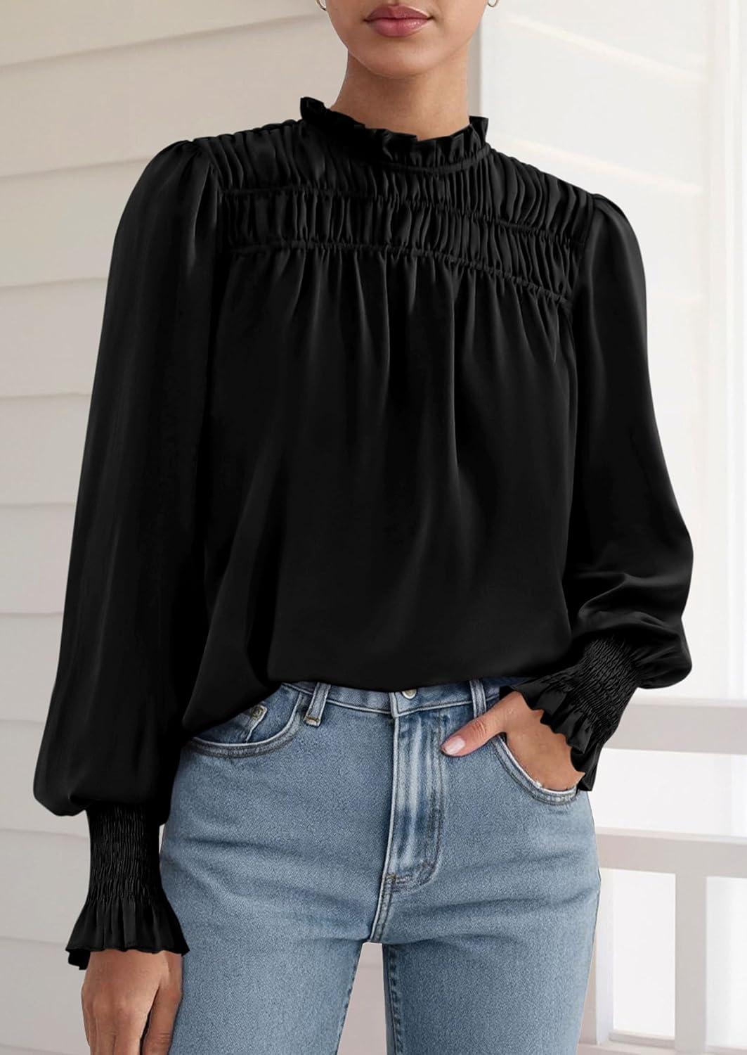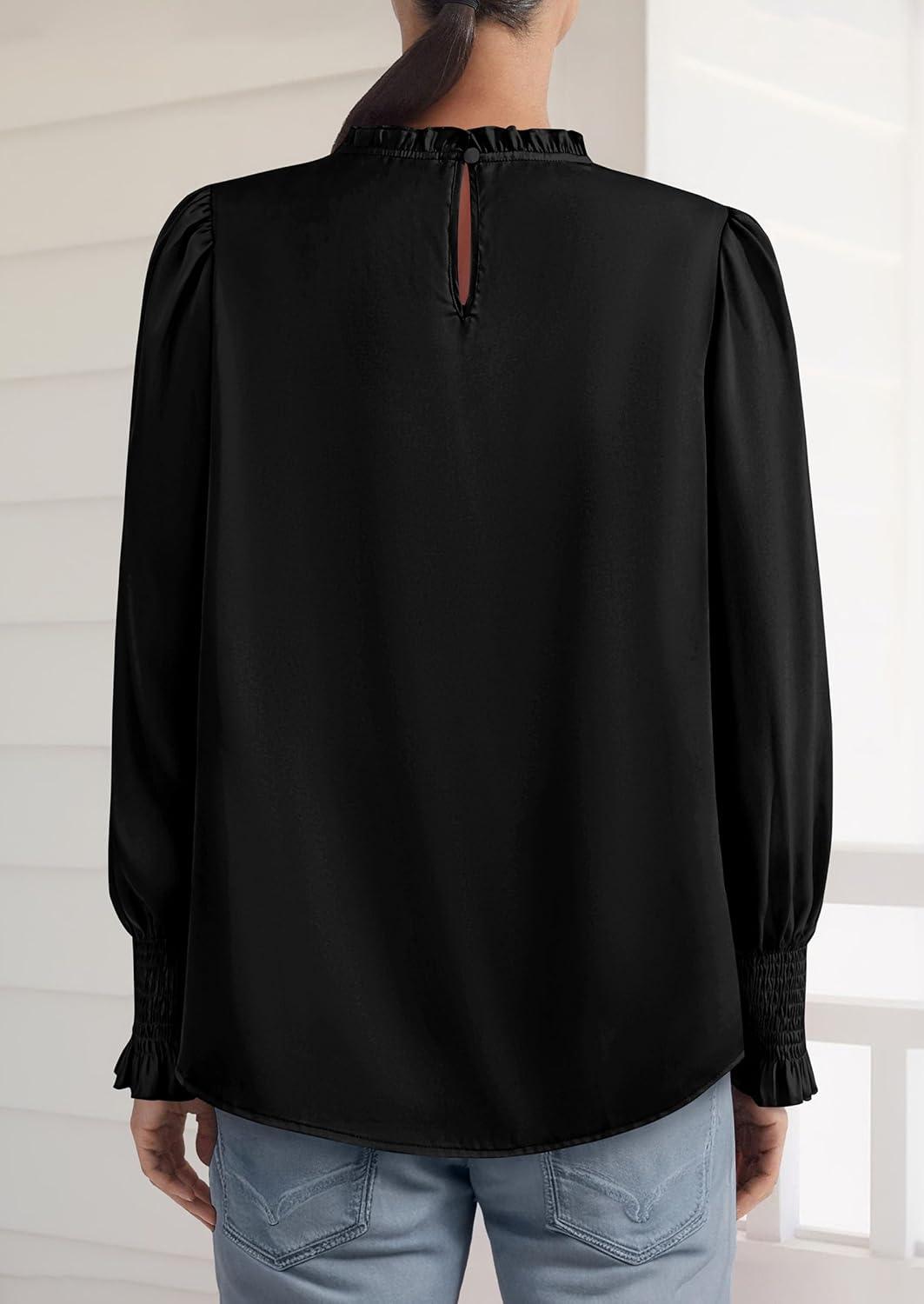 PRETTYGARDEN Blouses for Women Dressy Casual Fall Outfits 2025 Frill Neck Long Sleeve Shirts Satin Work Business Casual Tops(Black)