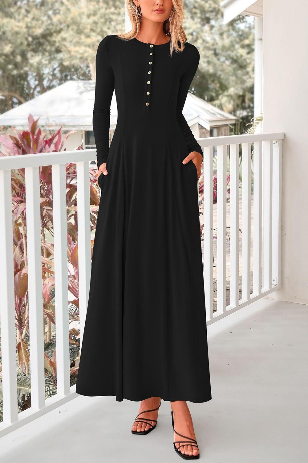 PRETTYGARDEN Casual Maxi Dress for Women 2024 Fall Fashion Clothes Long Sleeve Button Fit and Flare Long Flowy Dresses(Black)