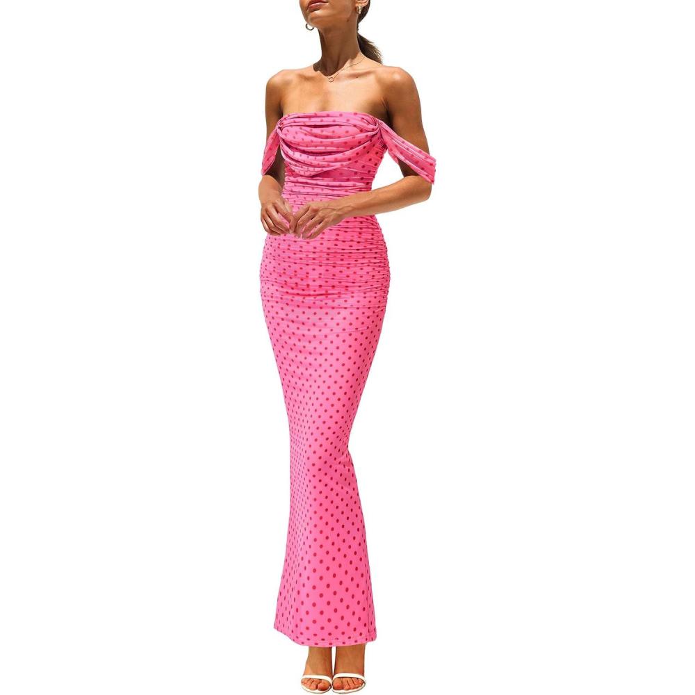 PRETTYGARDEN Cocktail Dresses for Women 2026 Summer Floral Off Shoulder Ruched Mesh Elegant Wedding Guest Maxi Dress(01 Dot Pink)