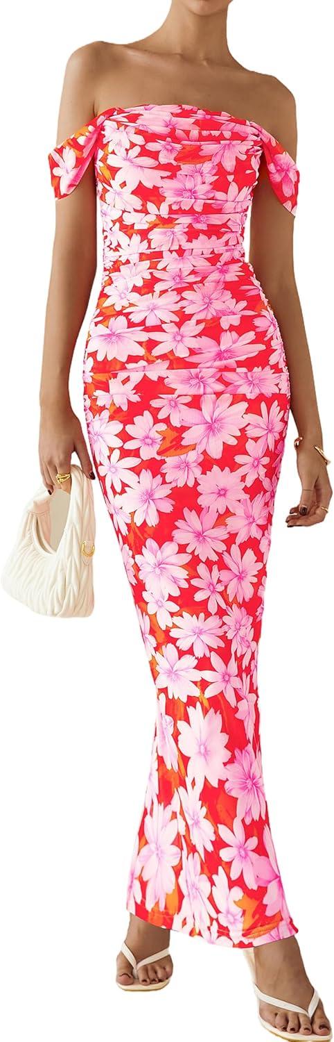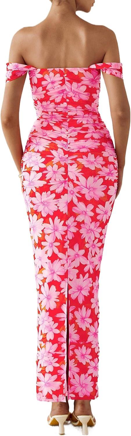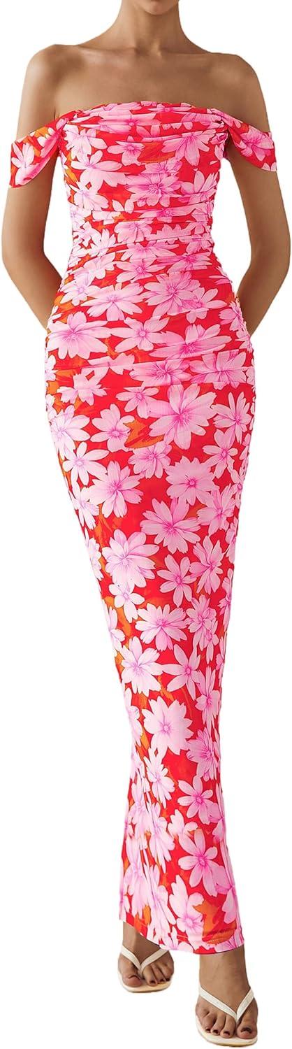 PRETTYGARDEN Cocktail Dresses for Women 2026 Summer Floral Off Shoulder Ruched Mesh Elegant Wedding Guest Maxi Dress(Orange Red Big Floral)