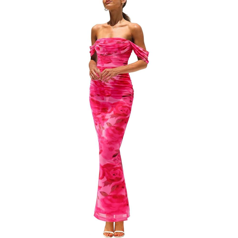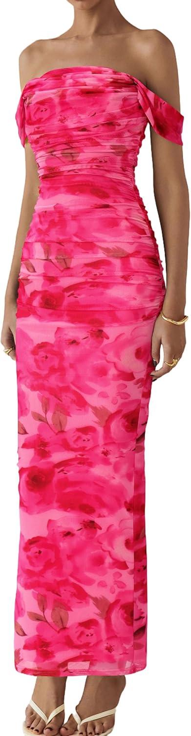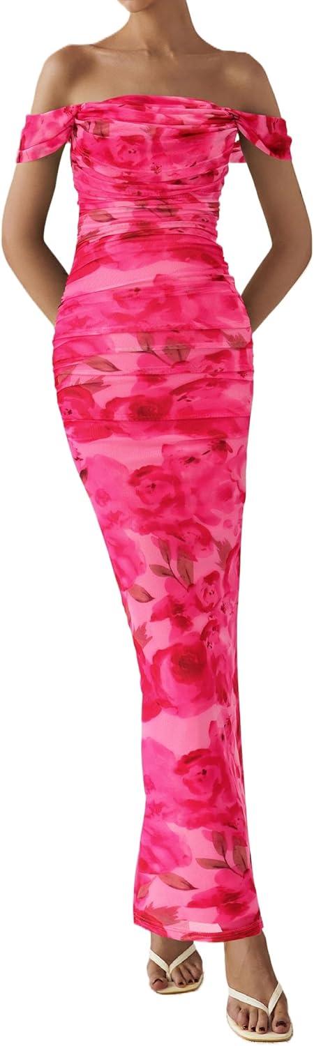 PRETTYGARDEN Cocktail Dresses for Women 2026 Summer Floral Off Shoulder Ruched Mesh Elegant Wedding Guest Maxi Dress(Rose Red Floral)