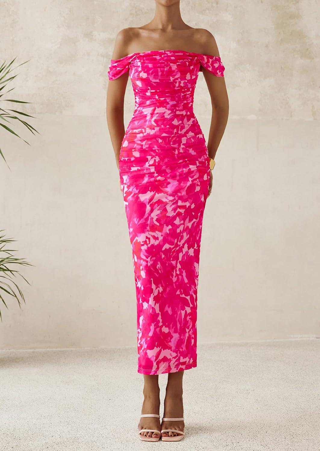 PRETTYGARDEN Cocktail Dresses for Women 2026 Summer Floral Off Shoulder Ruched Mesh Elegant Wedding Guest Maxi Dress(Pink Floral)