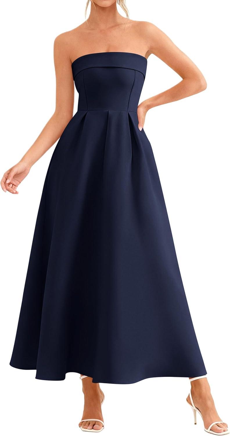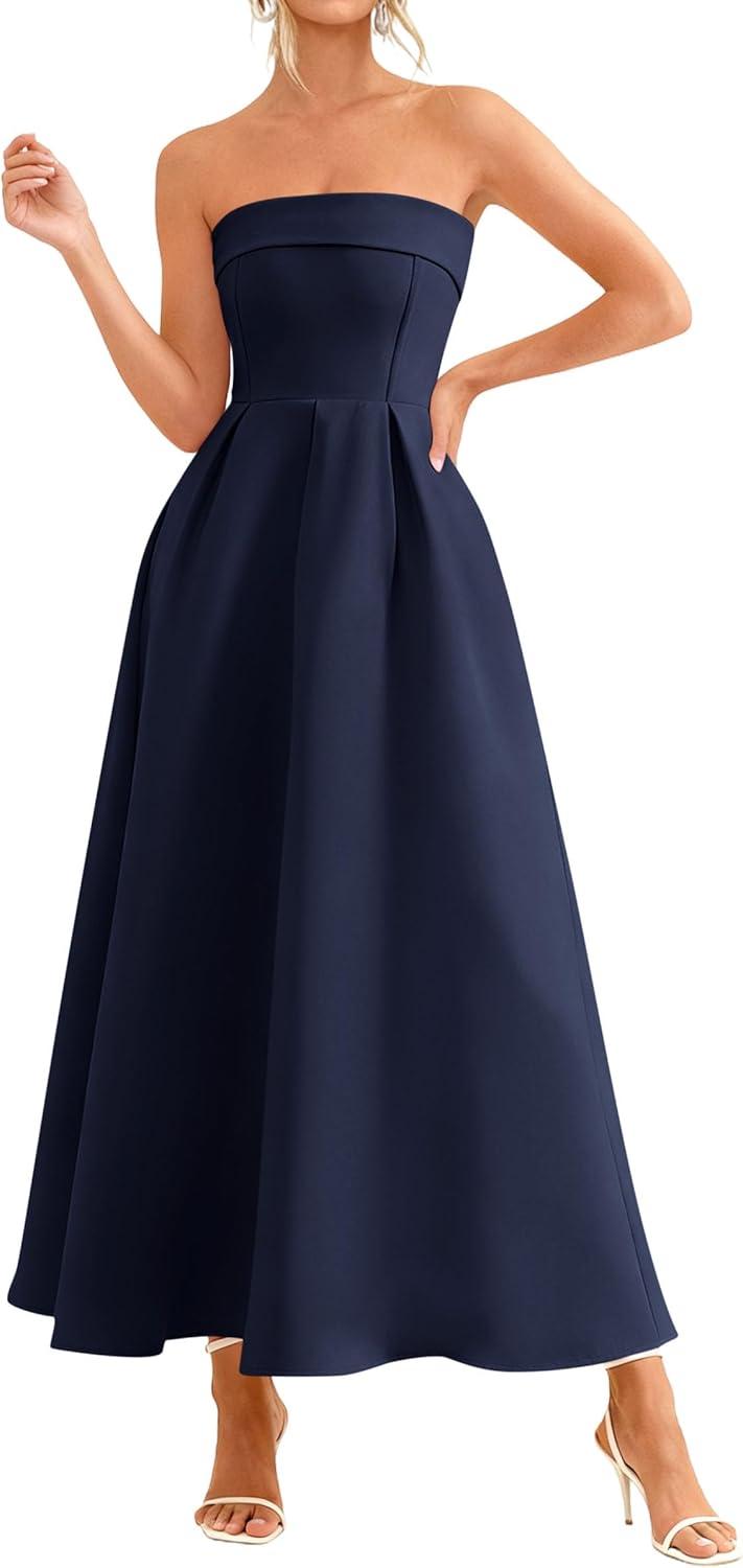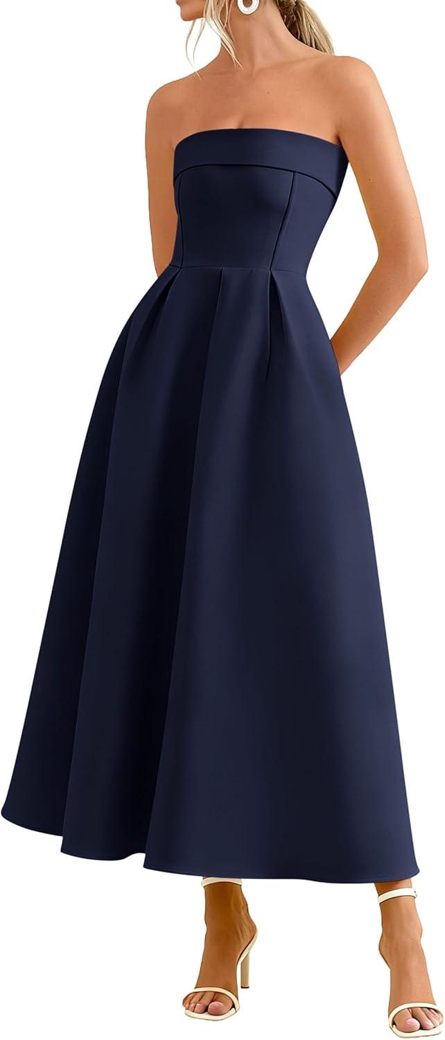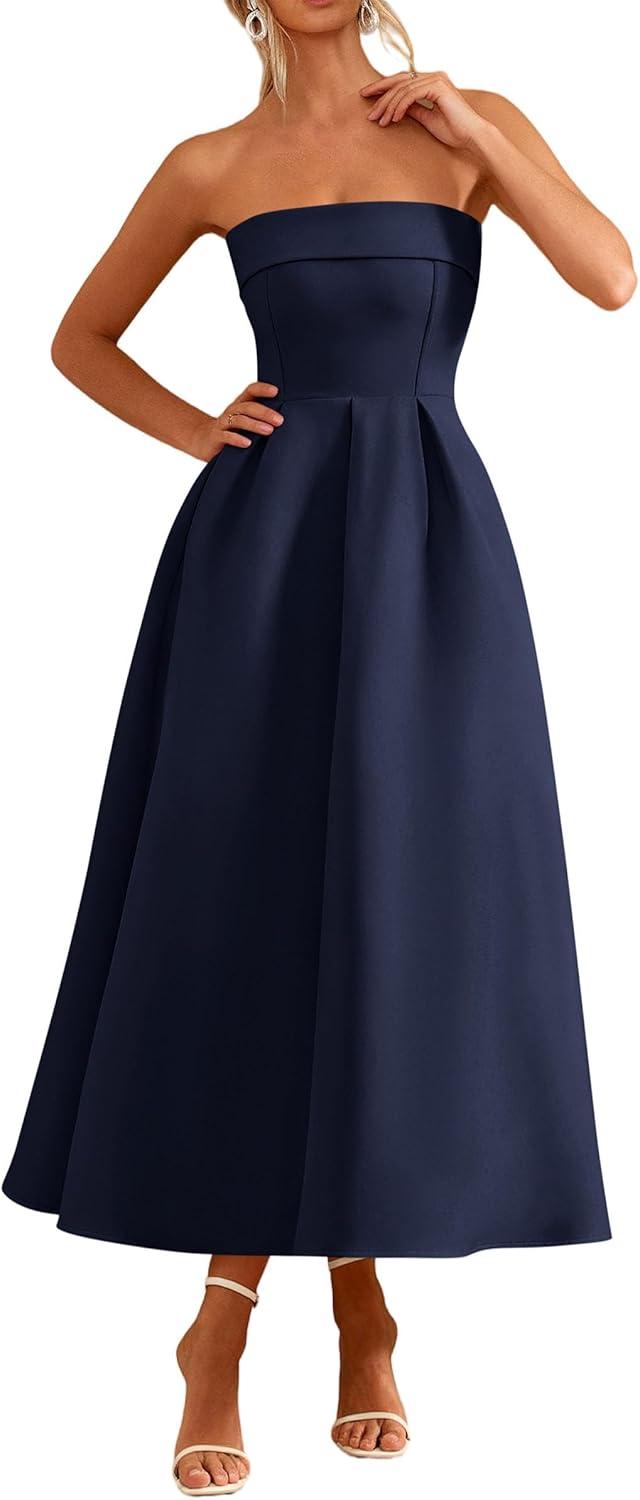 PRETTYGARDEN Cocktail Dresses for Women 2026 Summer Formal Elegant Tube Top Strapless Spring Wedding Guest Party Midi Dress(Navy)