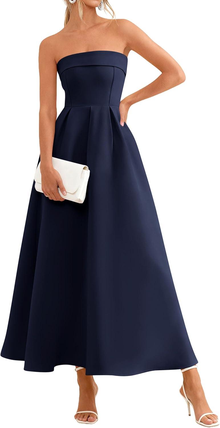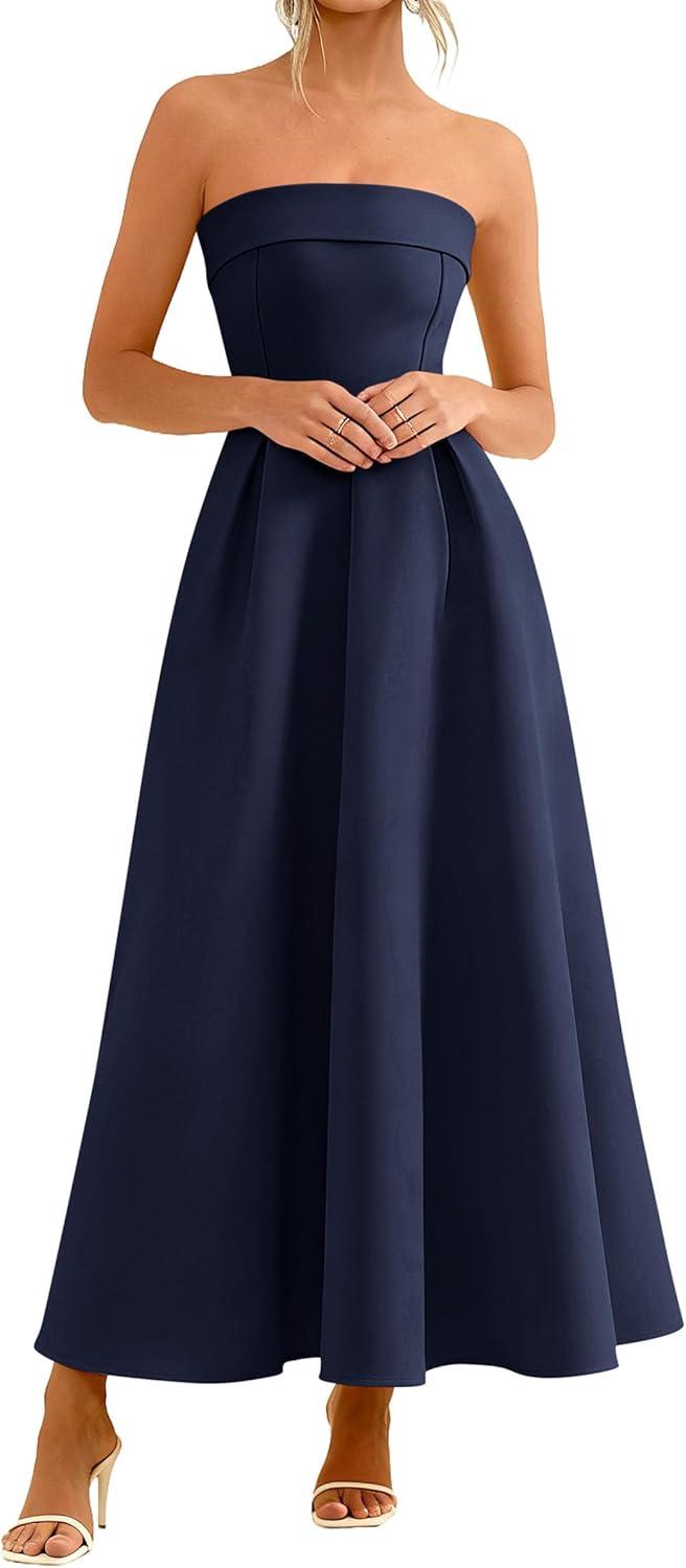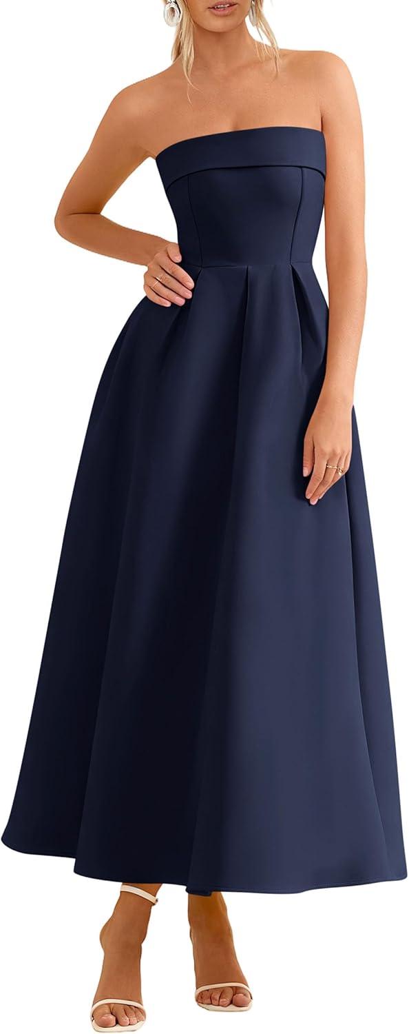 PRETTYGARDEN Cocktail Dresses for Women 2026 Summer Formal Elegant Tube Top Strapless Spring Wedding Guest Party Midi Dress(Navy)