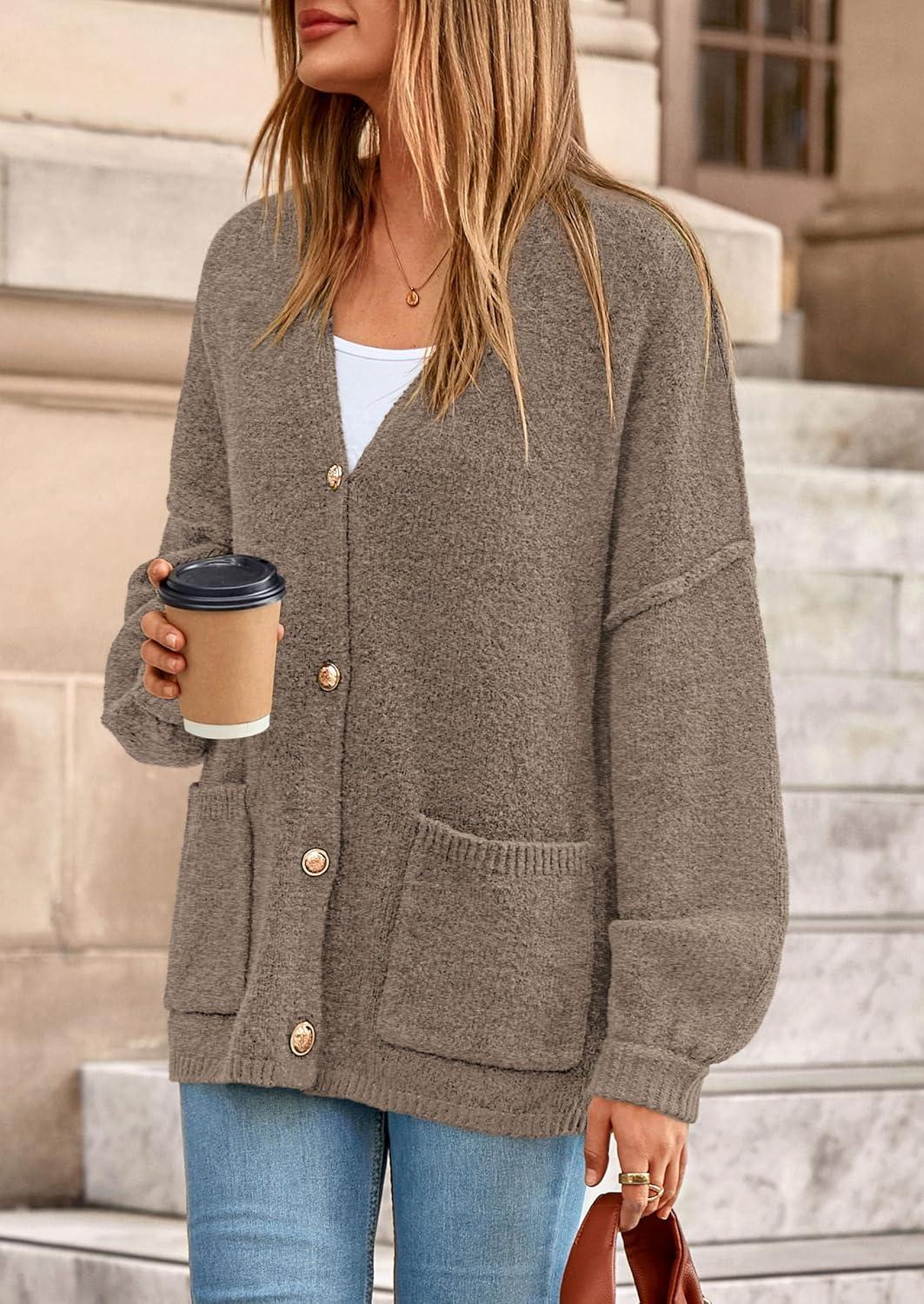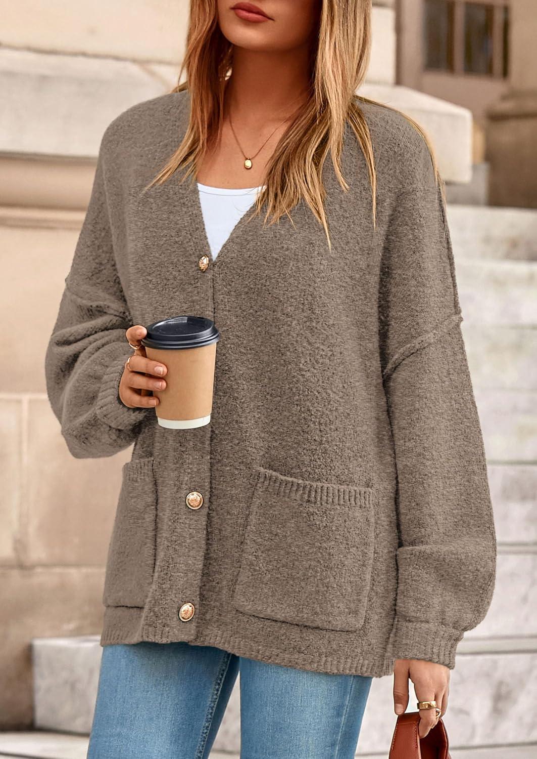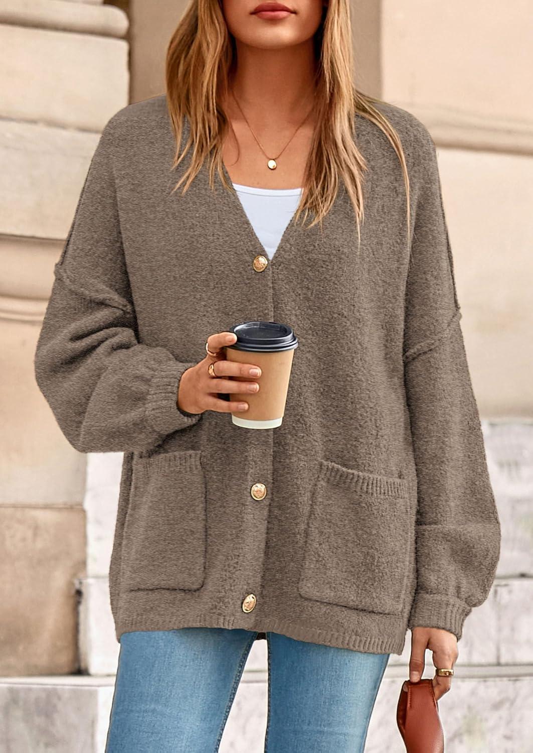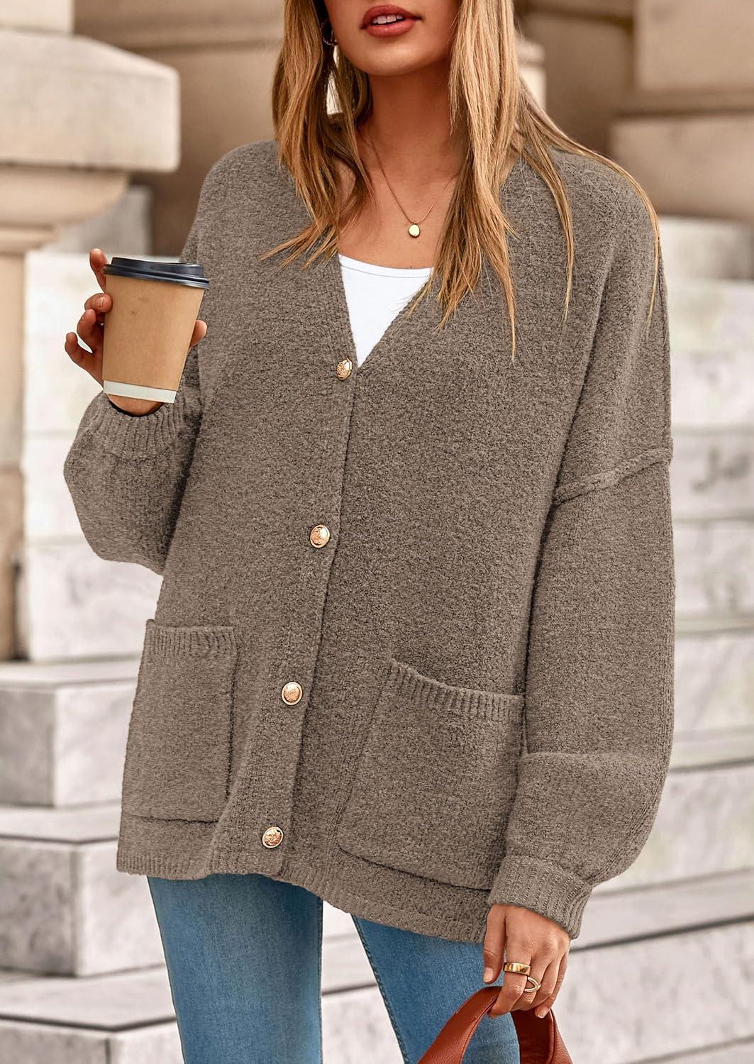 PRETTYGARDEN Fall Chunky Cardigan Sweaters for Women 2025 Button Lantern Sleeve Knit Oversized Sweater Coats with Pockets(Dark Khaki)