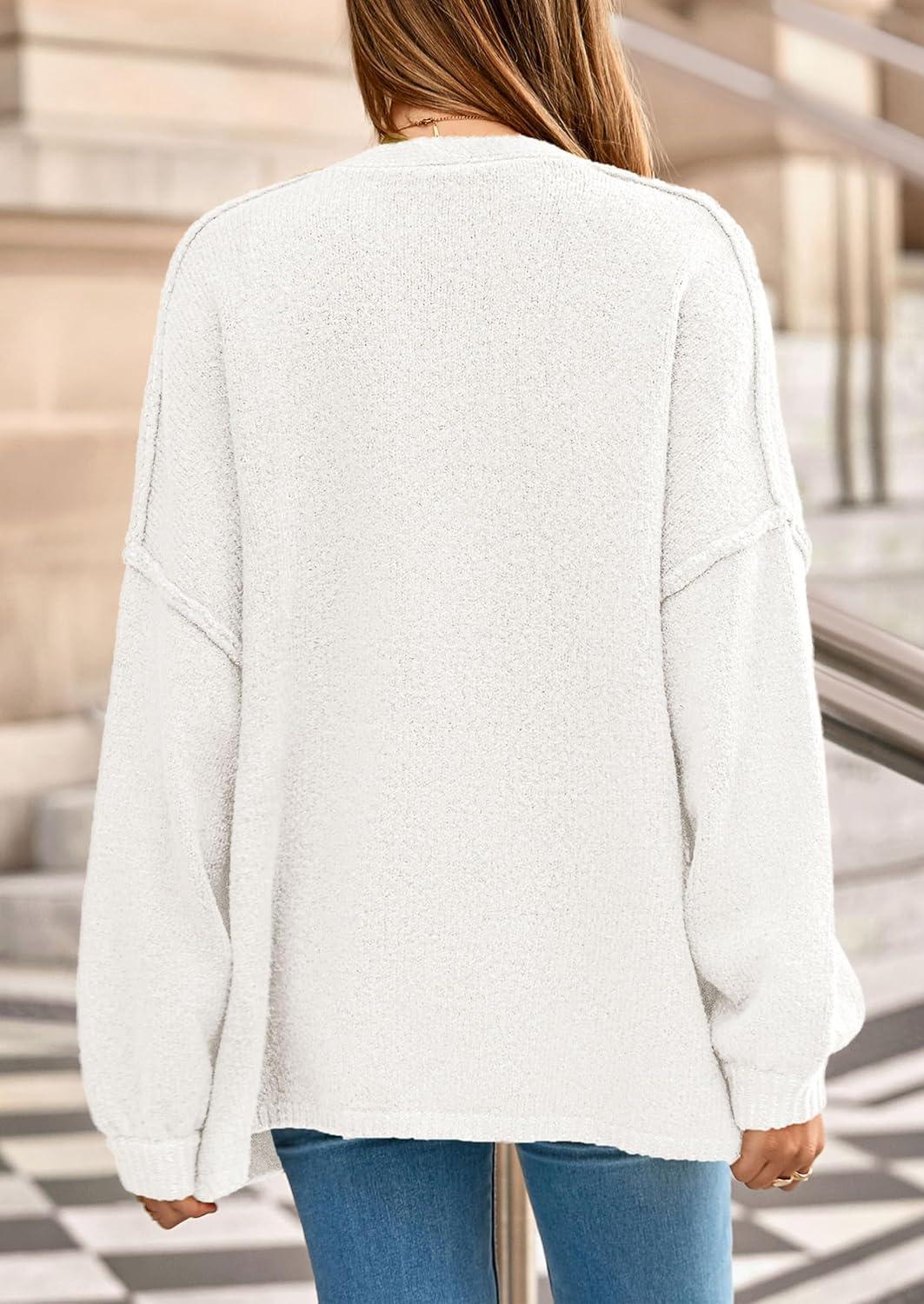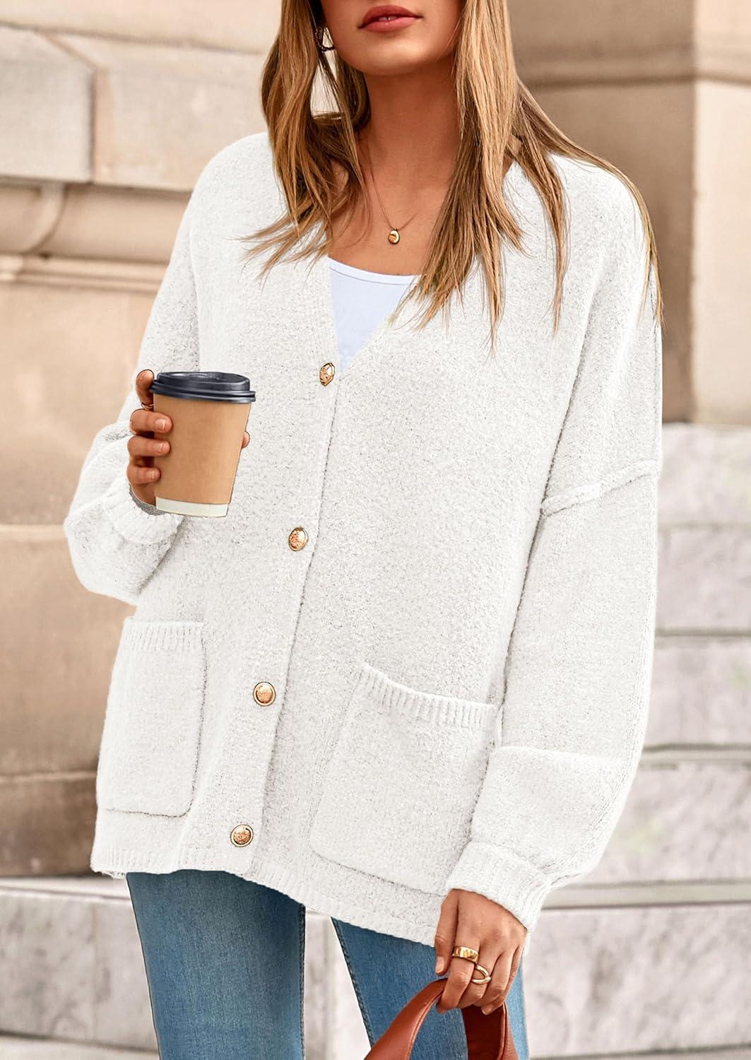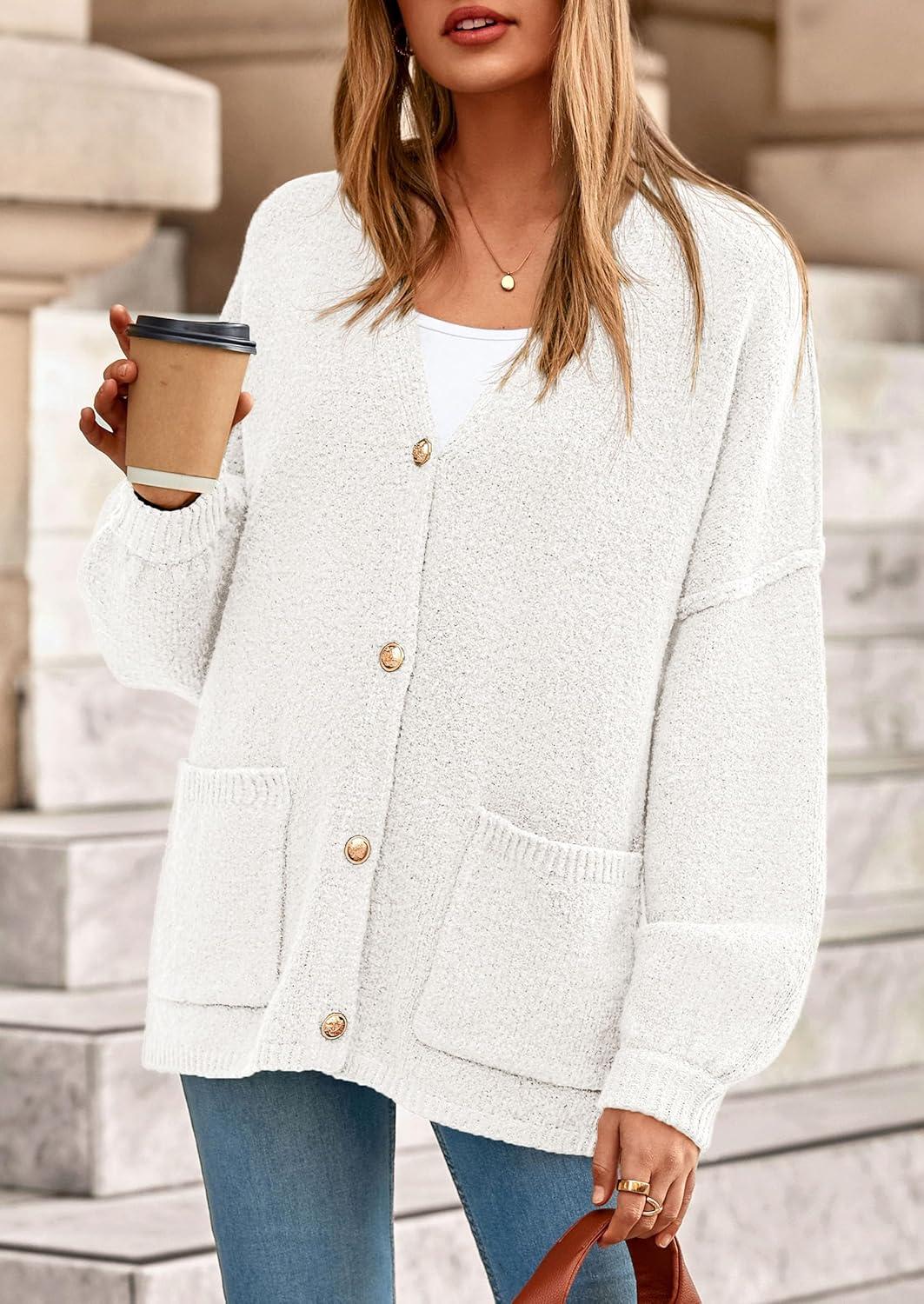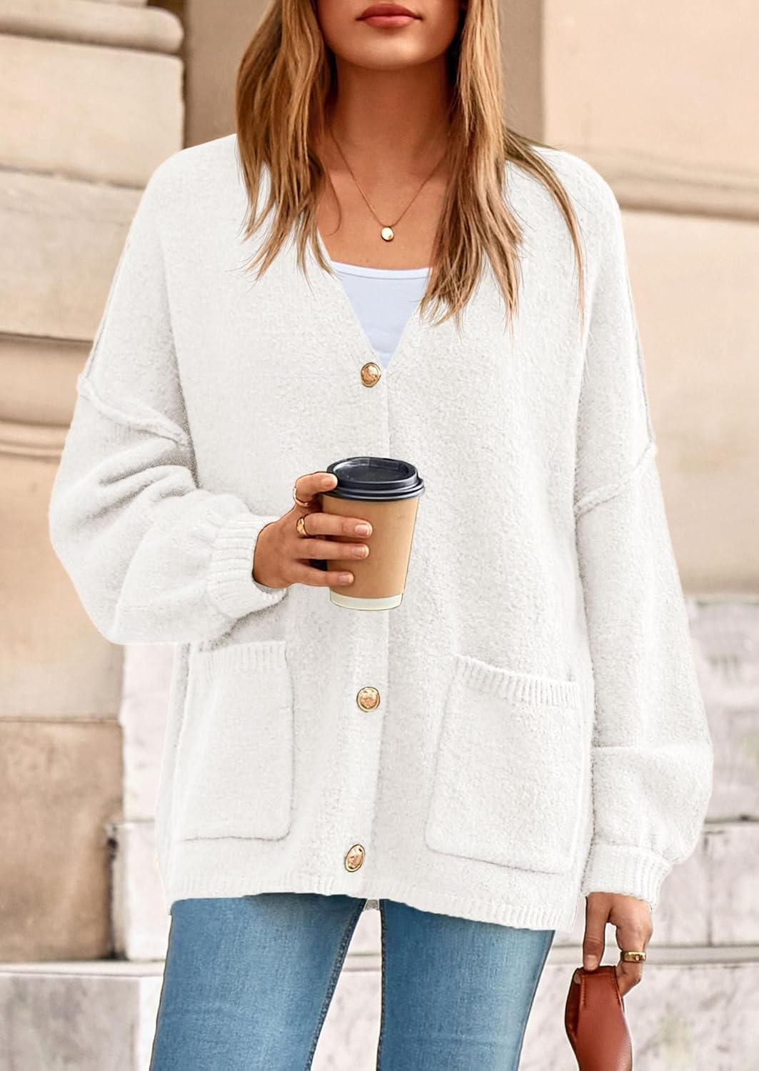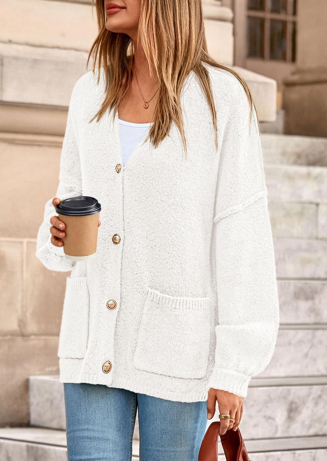 PRETTYGARDEN Fall Chunky Cardigan Sweaters for Women 2025 Button Lantern Sleeve Knit Oversized Sweater Coats with Pockets(White)