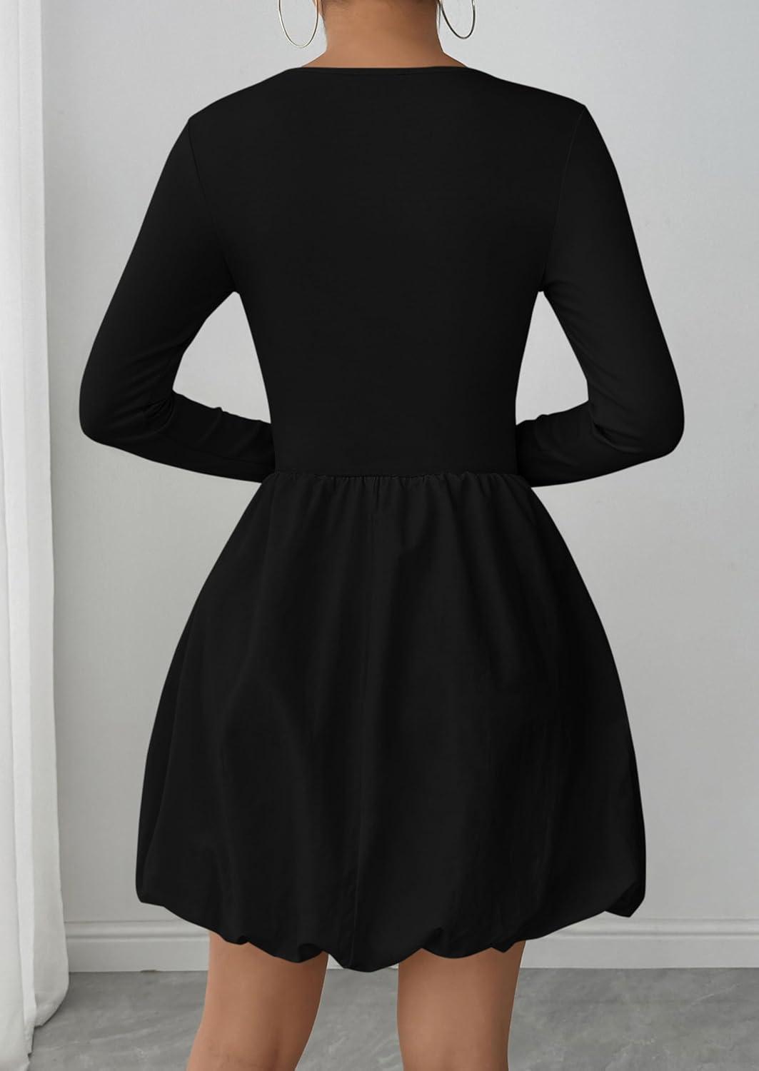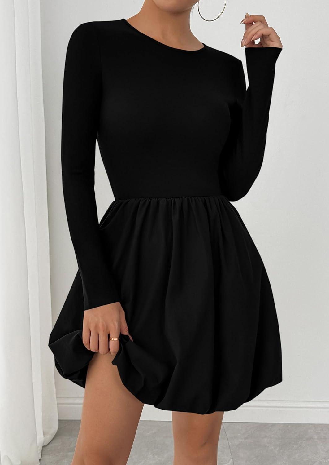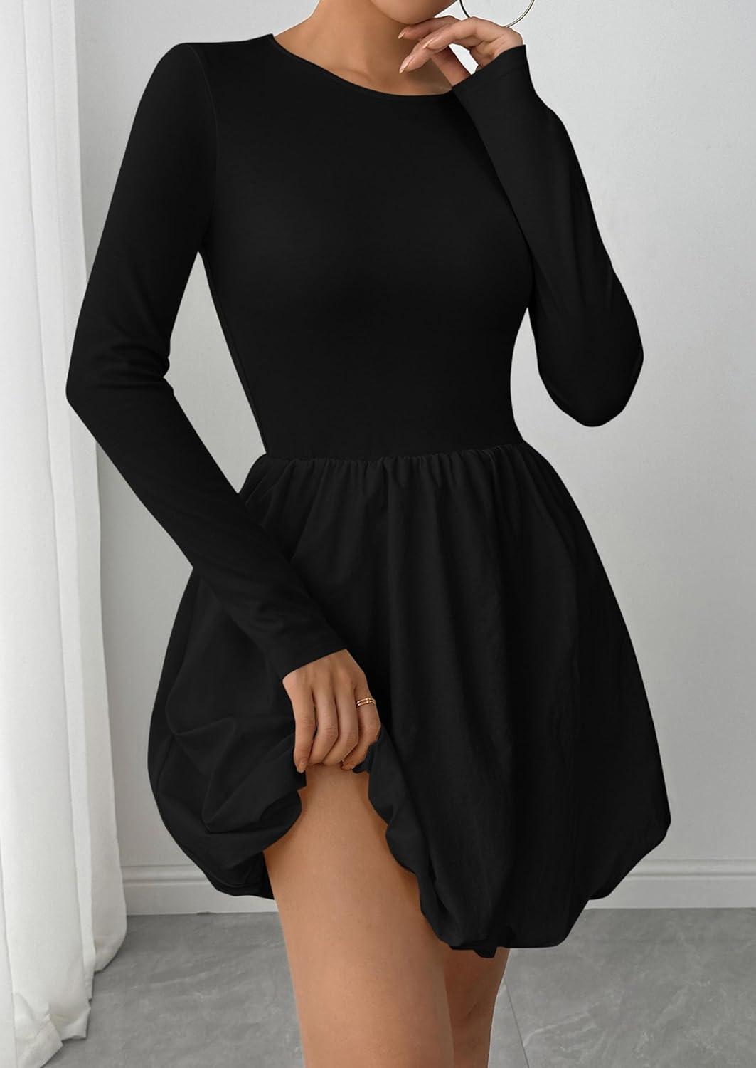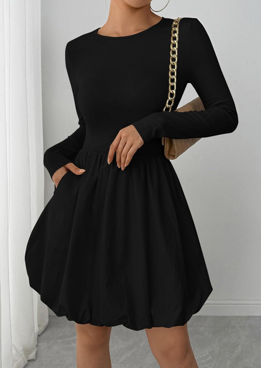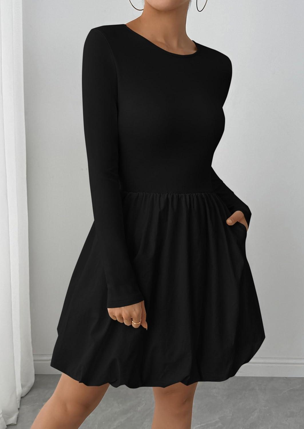 PRETTYGARDEN Fall Dresses for Women 2025 Casual Long Sleeve Bubble Cute Crew Neck A Line Mini Short Dress with Pockets(Black)