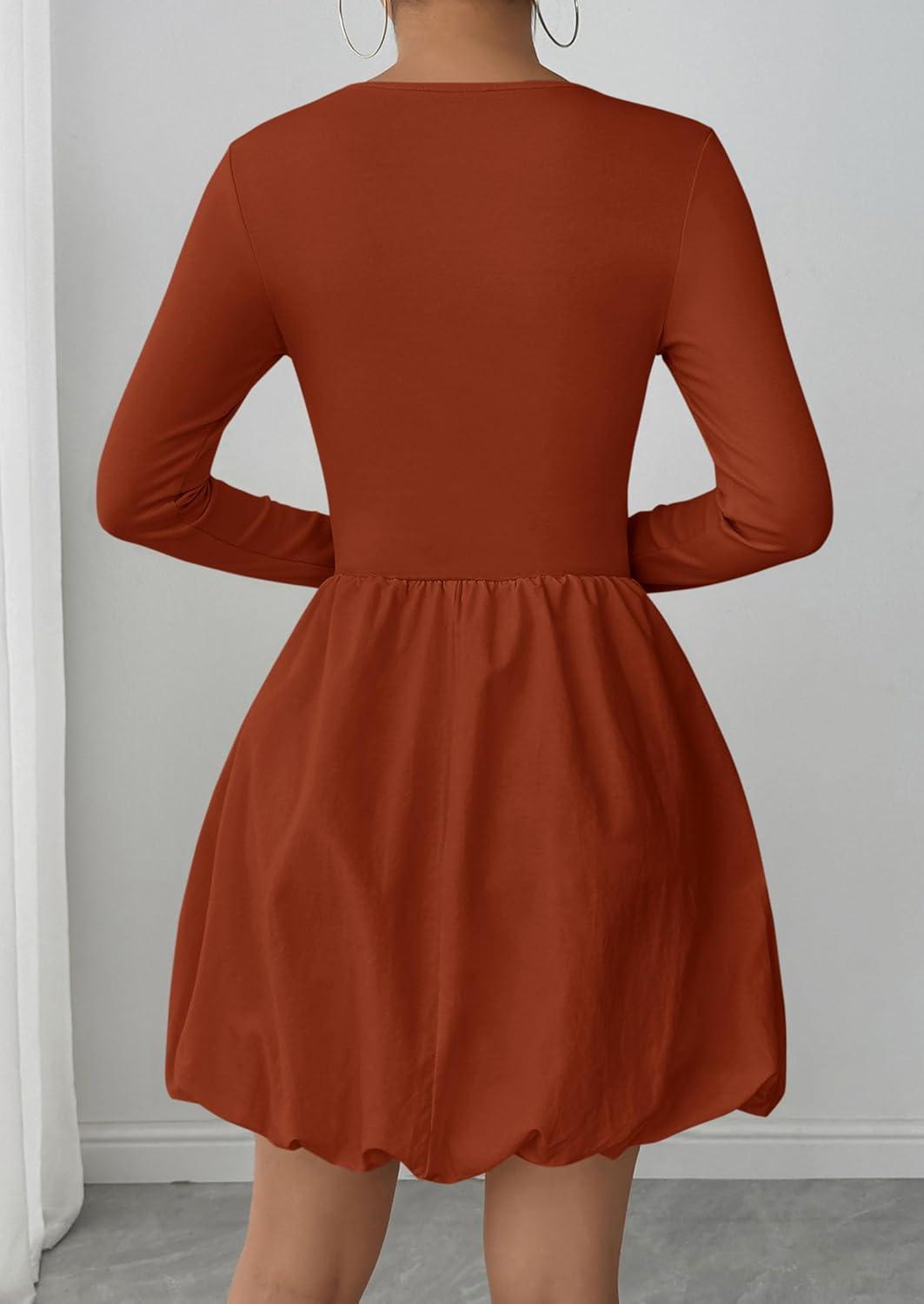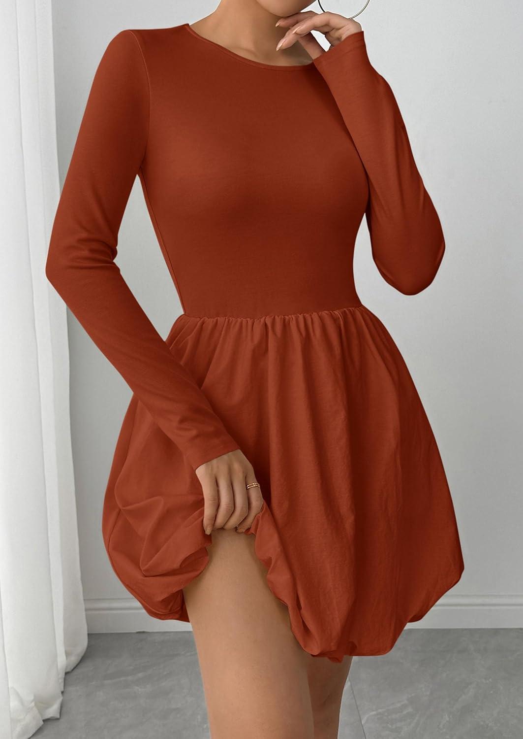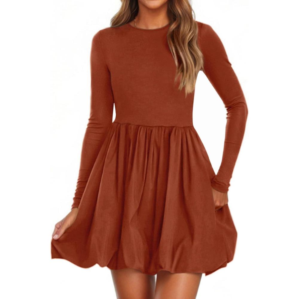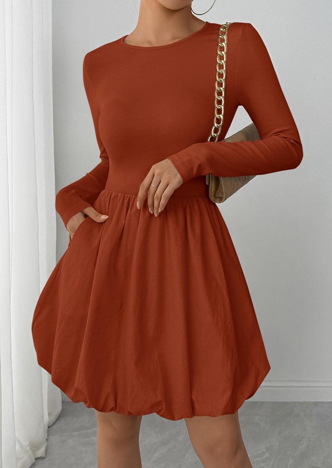 PRETTYGARDEN Fall Dresses for Women 2025 Casual Long Sleeve Bubble Cute Crew Neck A Line Mini Short Dress with Pockets(Brick Red)