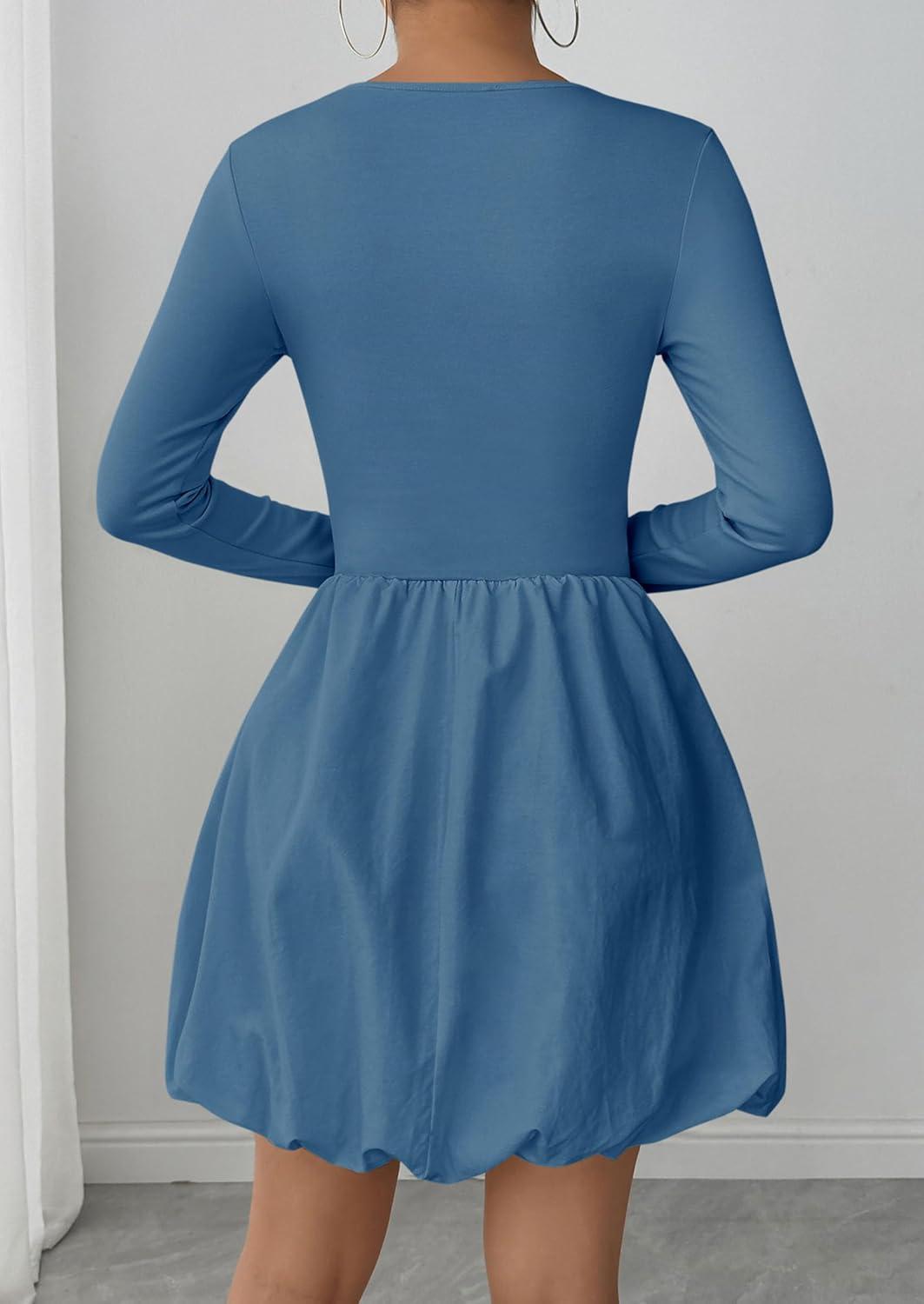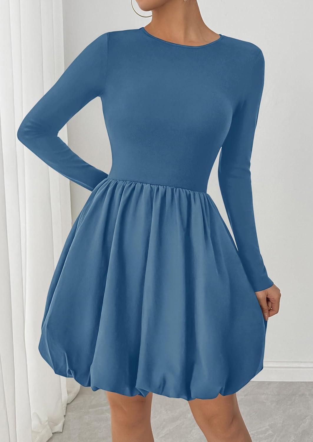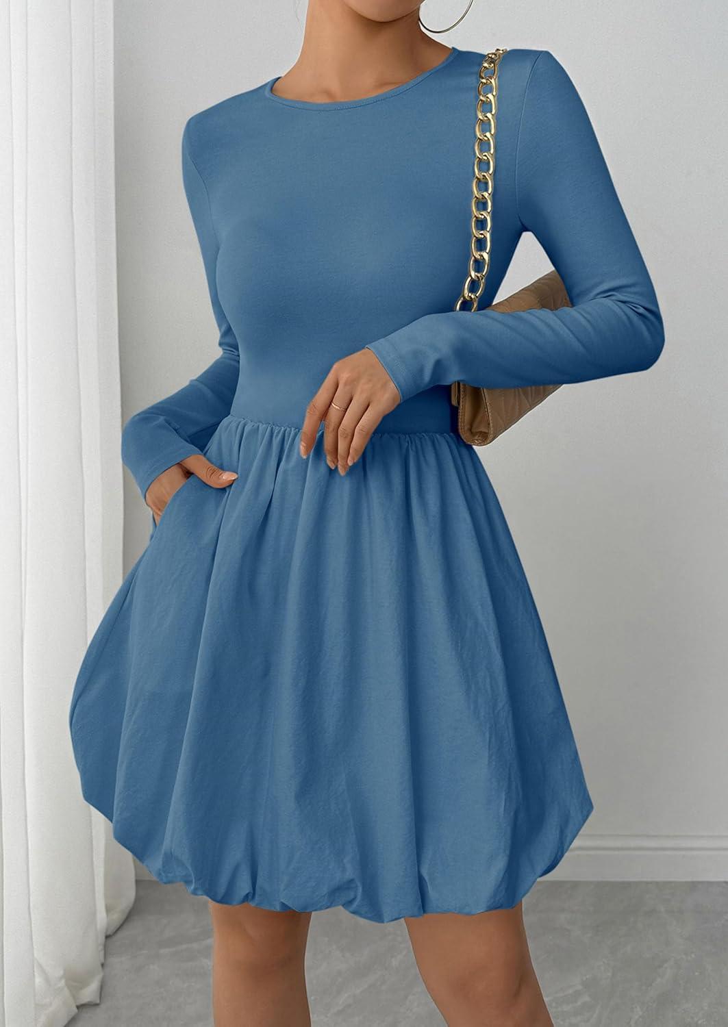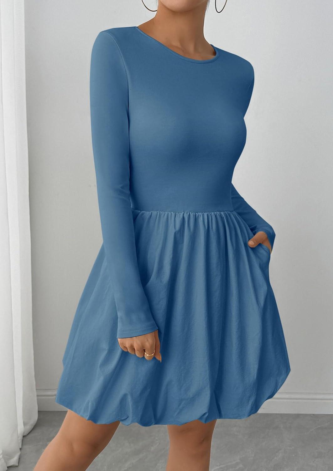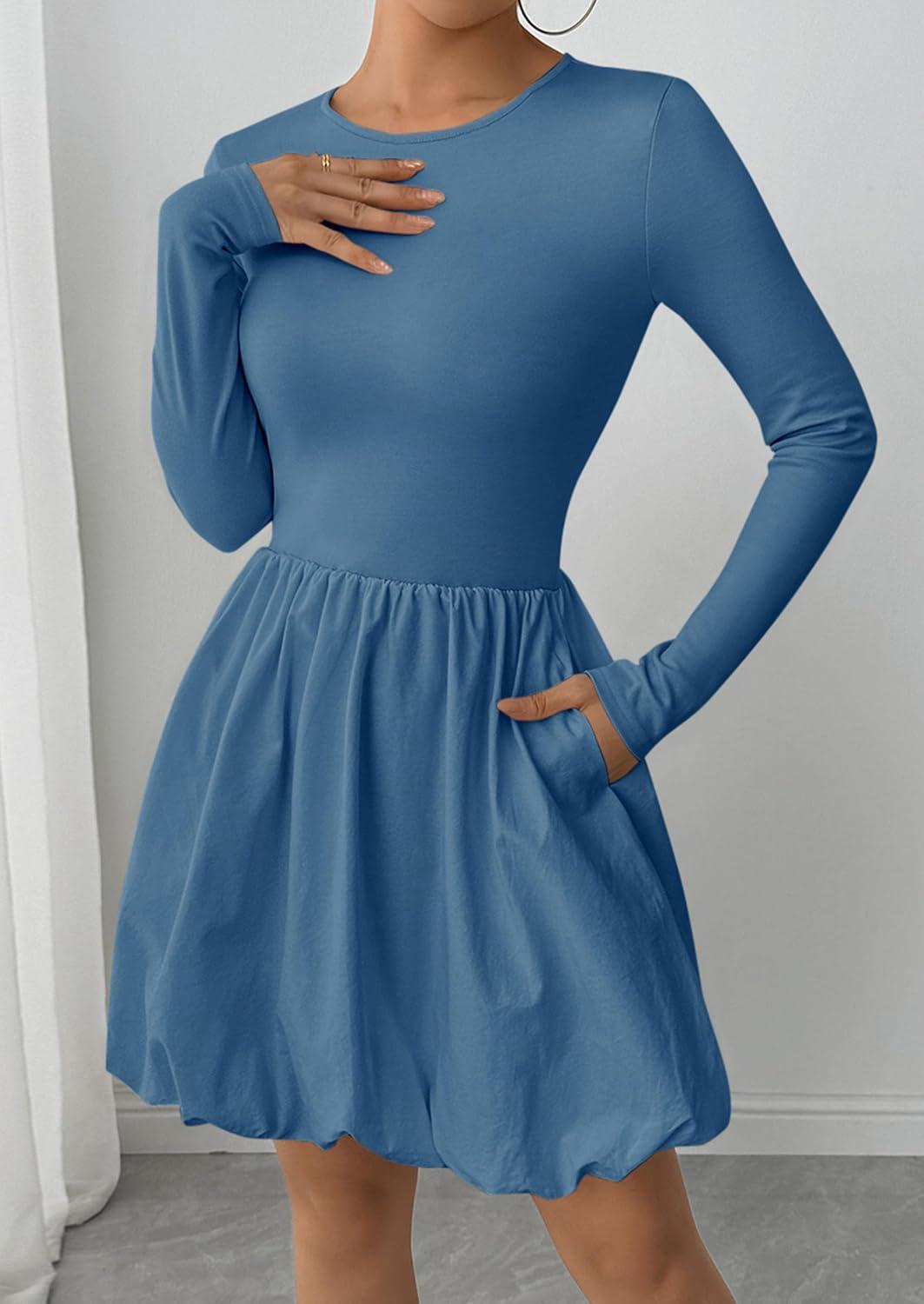 PRETTYGARDEN Fall Dresses for Women 2025 Casual Long Sleeve Bubble Cute Crew Neck A Line Mini Short Dress with Pockets(Grey Blue)