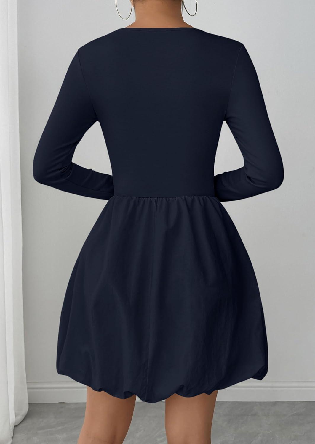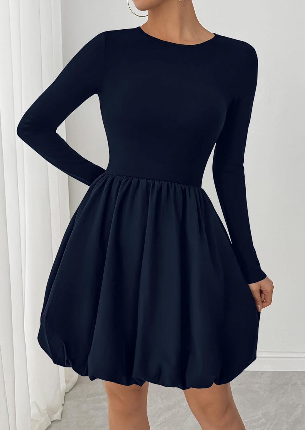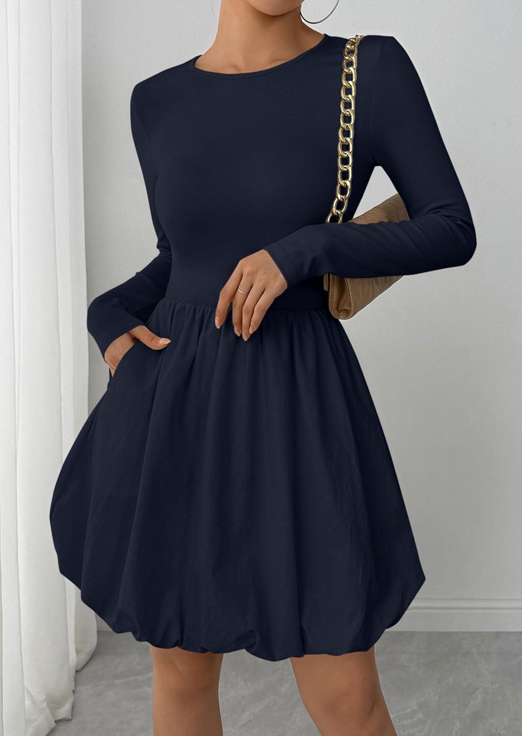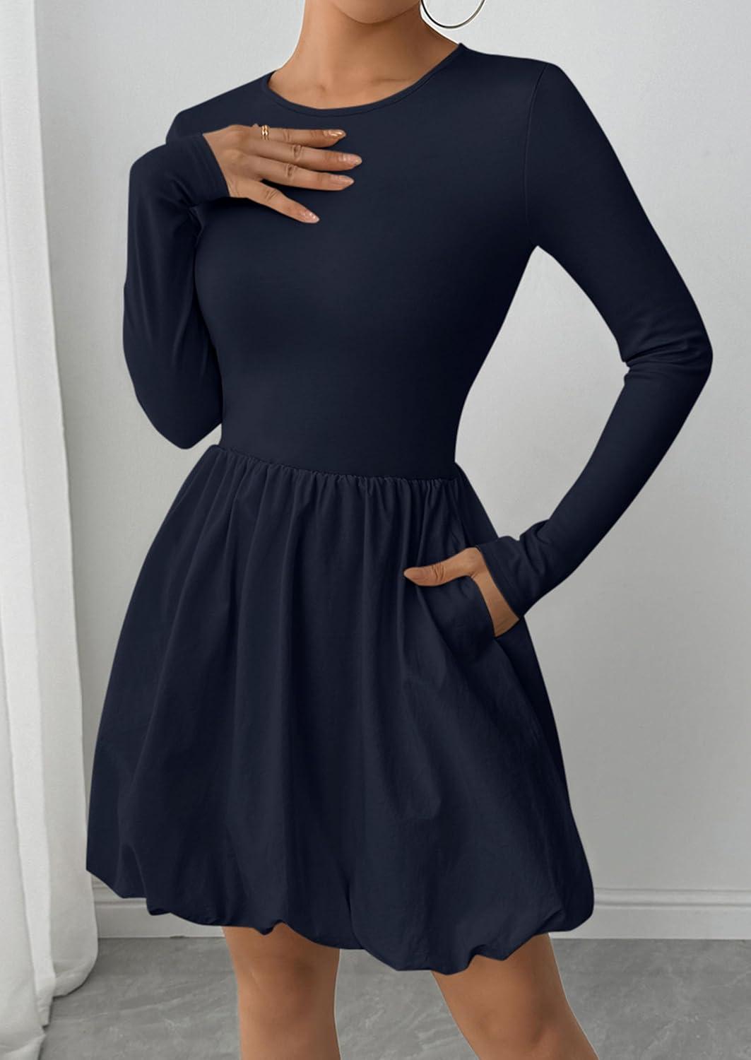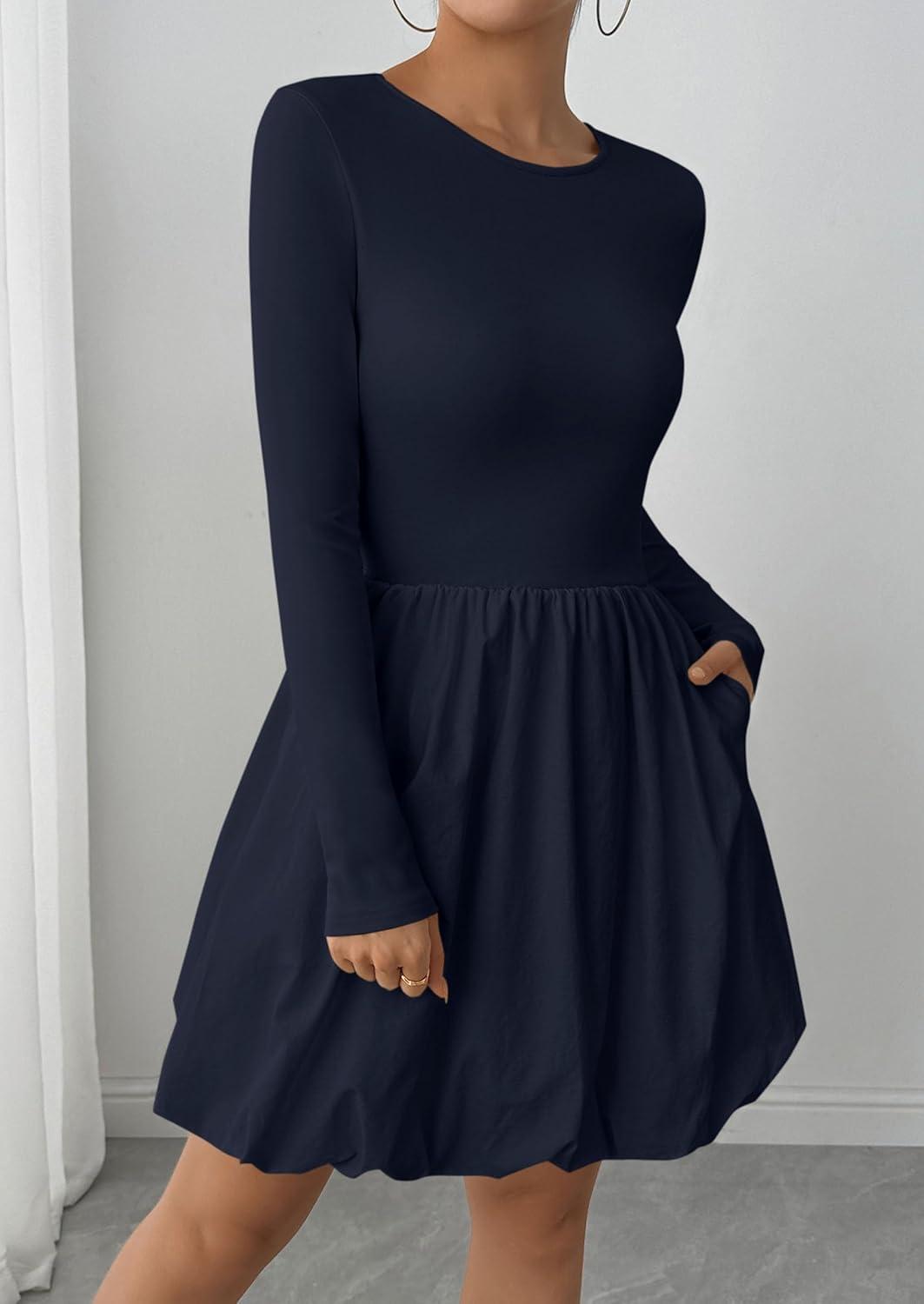 PRETTYGARDEN Fall Dresses for Women 2025 Casual Long Sleeve Bubble Cute Crew Neck A Line Mini Short Dress with Pockets(Navy)