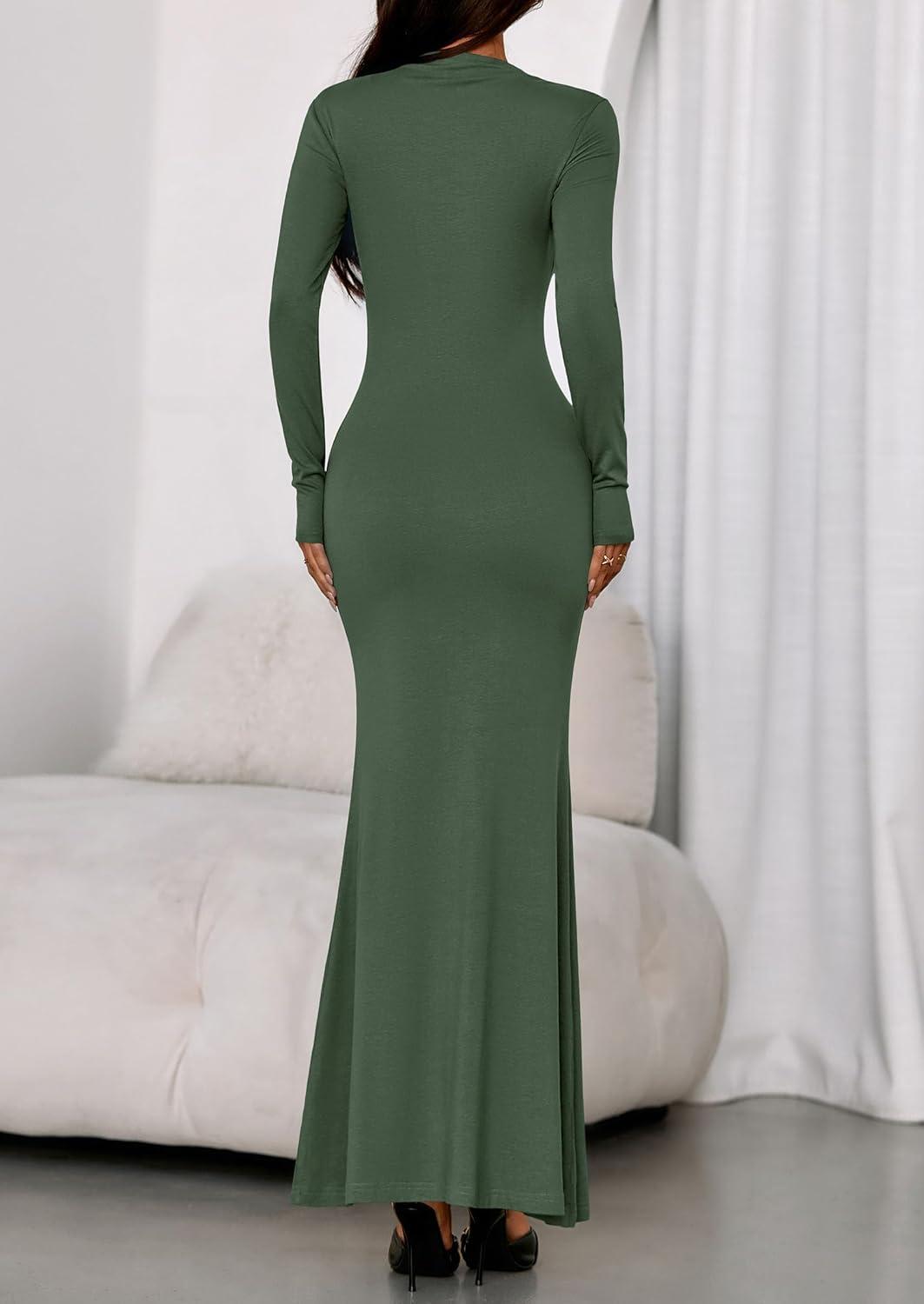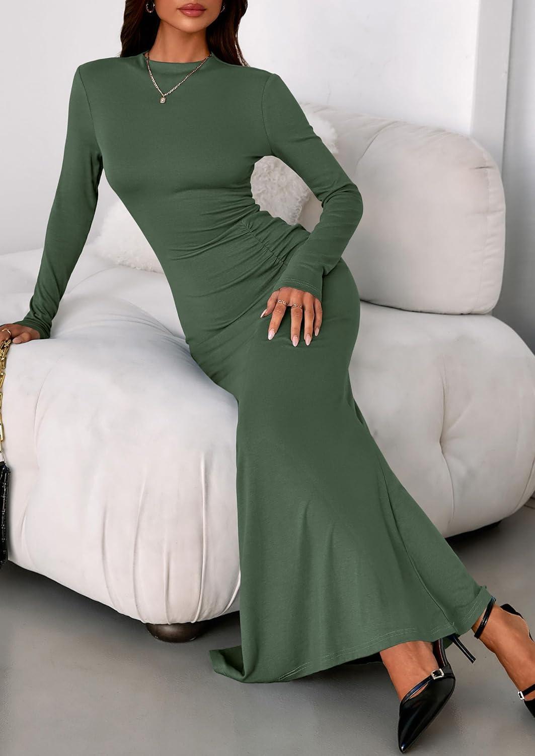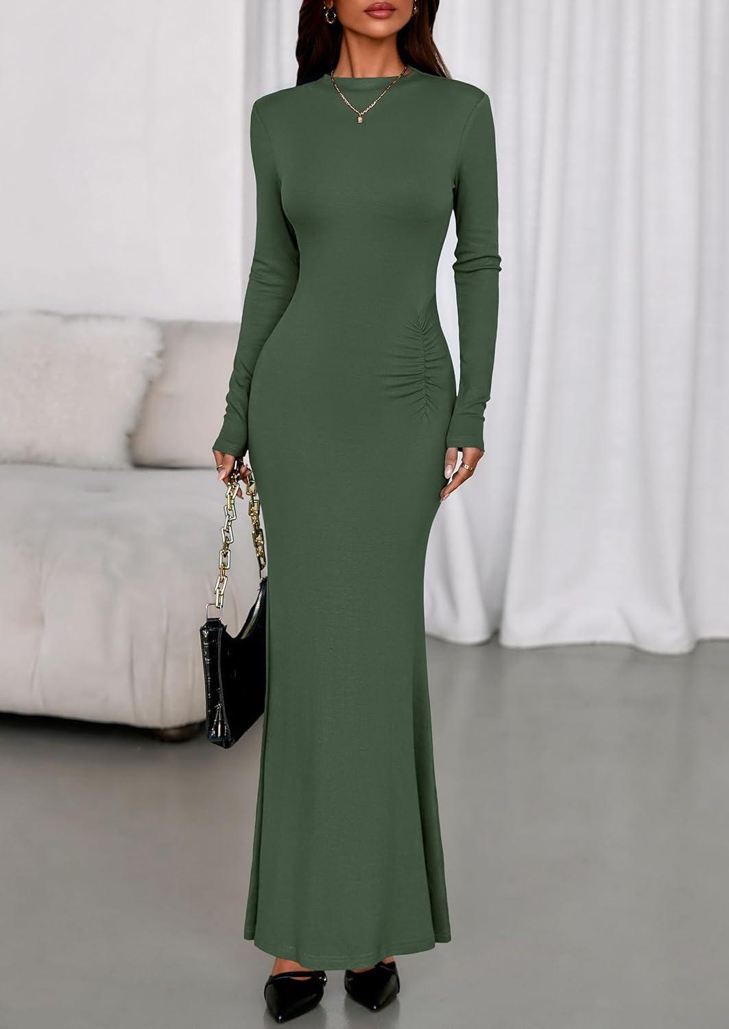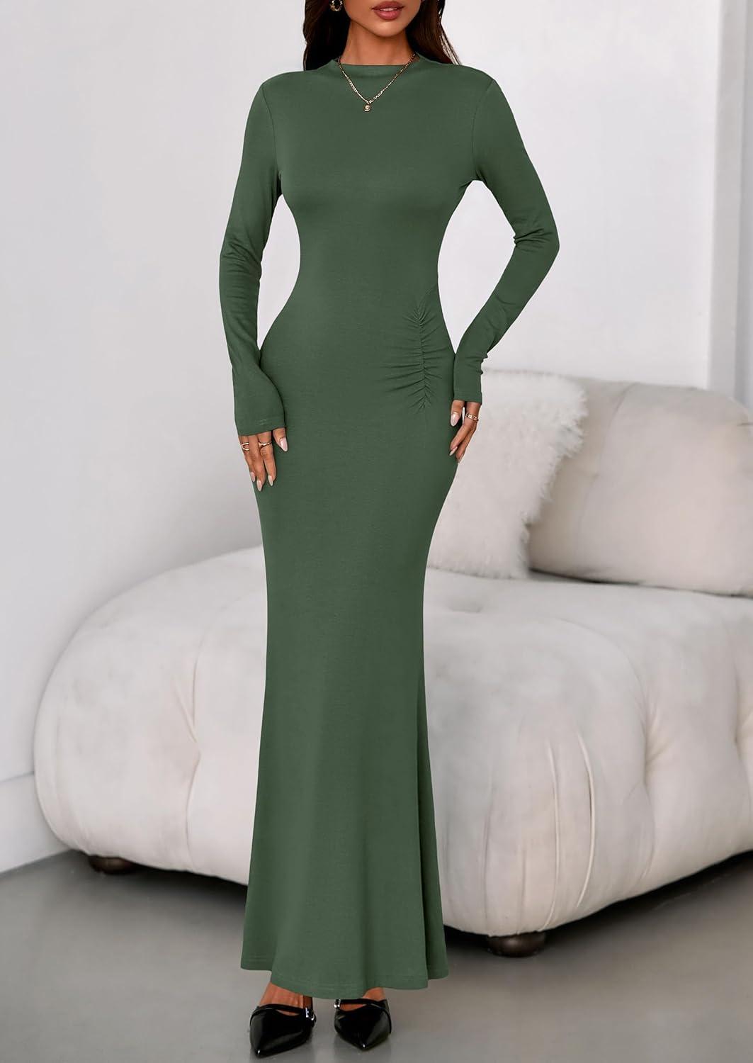 PRETTYGARDEN Fall Dresses for Women 2025 Long Sleeve Bodycon Mock Neck Ruched Maxi Formal Cocktail Wedding Guest Dress(Army Green)