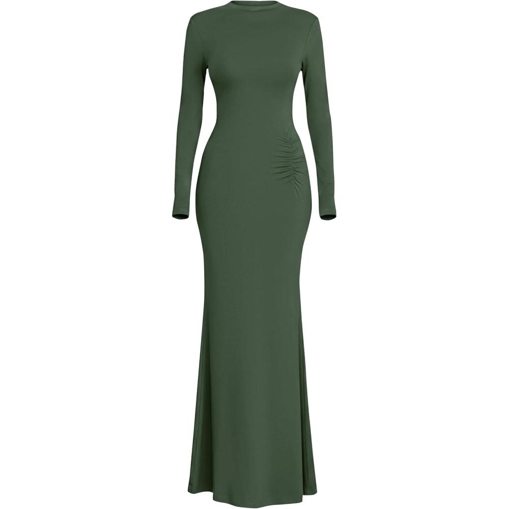 imagePRETTYGARDEN Fall Dresses for Women 2025 Long Sleeve Bodycon Mock Neck Ruched Maxi Formal Cocktail Wedding Guest DressArmy Green
