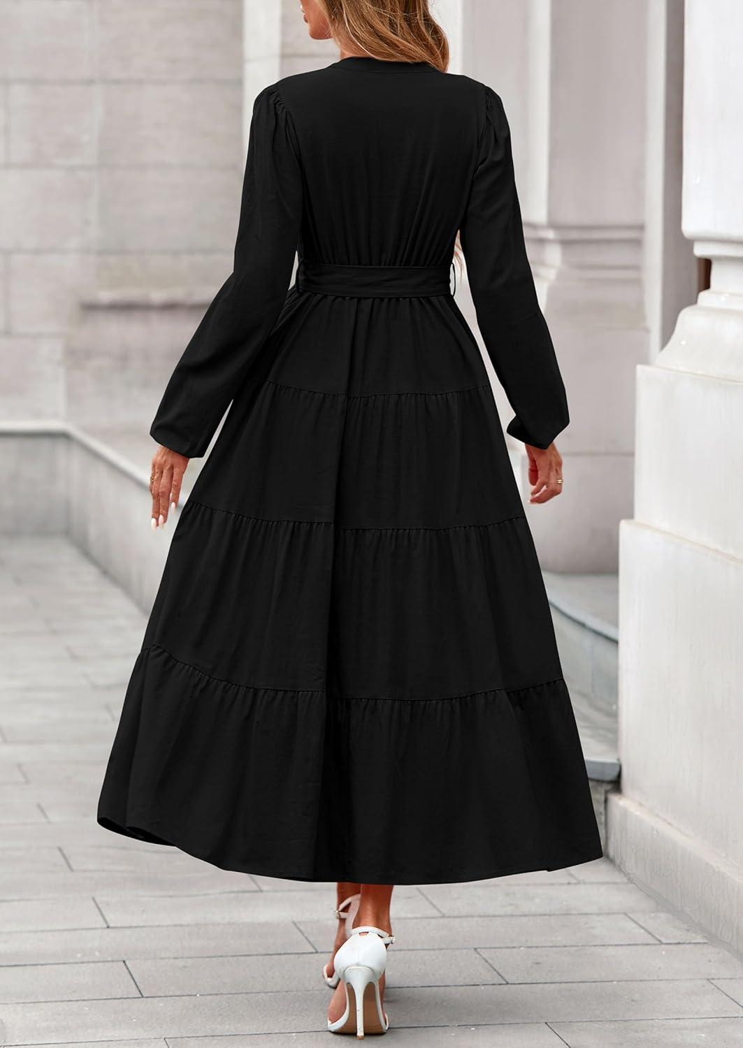 PRETTYGARDEN Fall Dresses for Women 2025 Long Sleeve V Neck Belted Ruffle A Line Flowy Boho Maxi Wedding Guest Dress Pockets(Black)