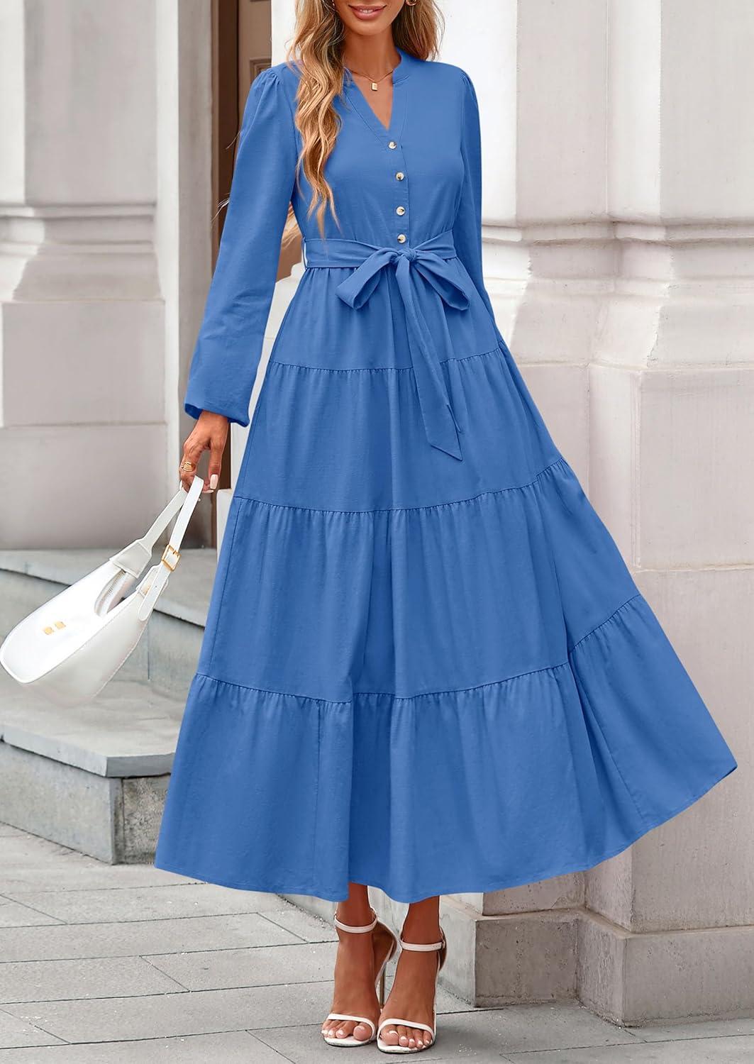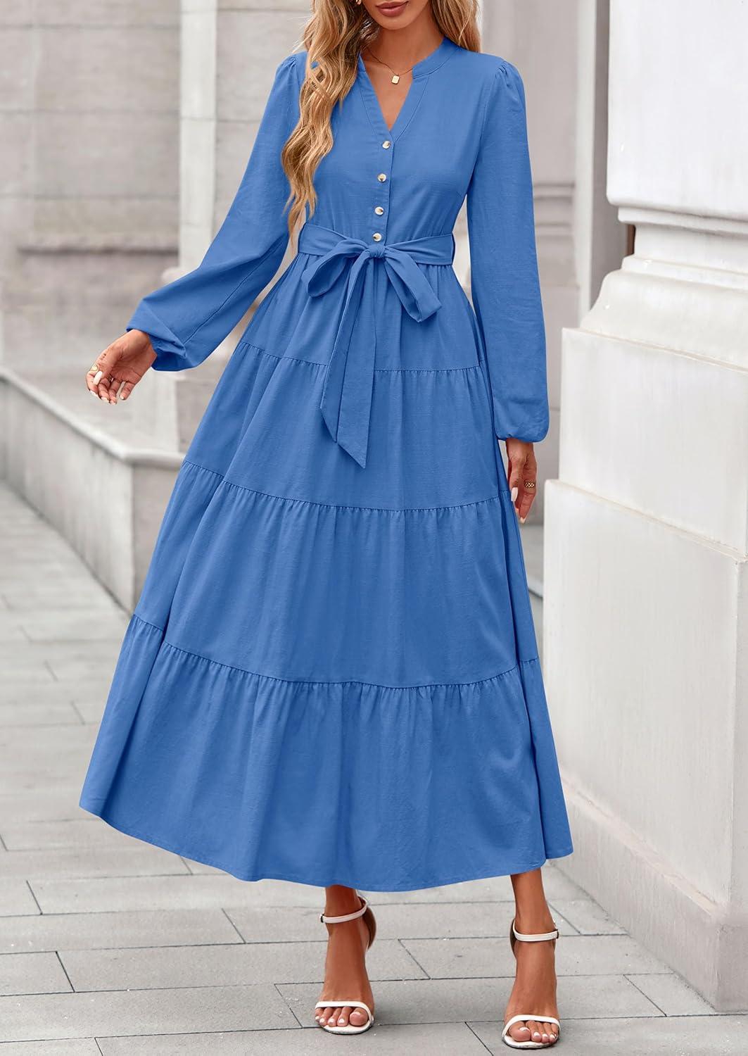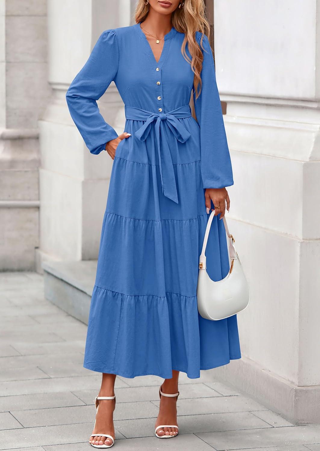 PRETTYGARDEN Fall Dresses for Women 2025 Long Sleeve V Neck Belted Ruffle A Line Flowy Boho Maxi Wedding Guest Dress Pockets(Blue)