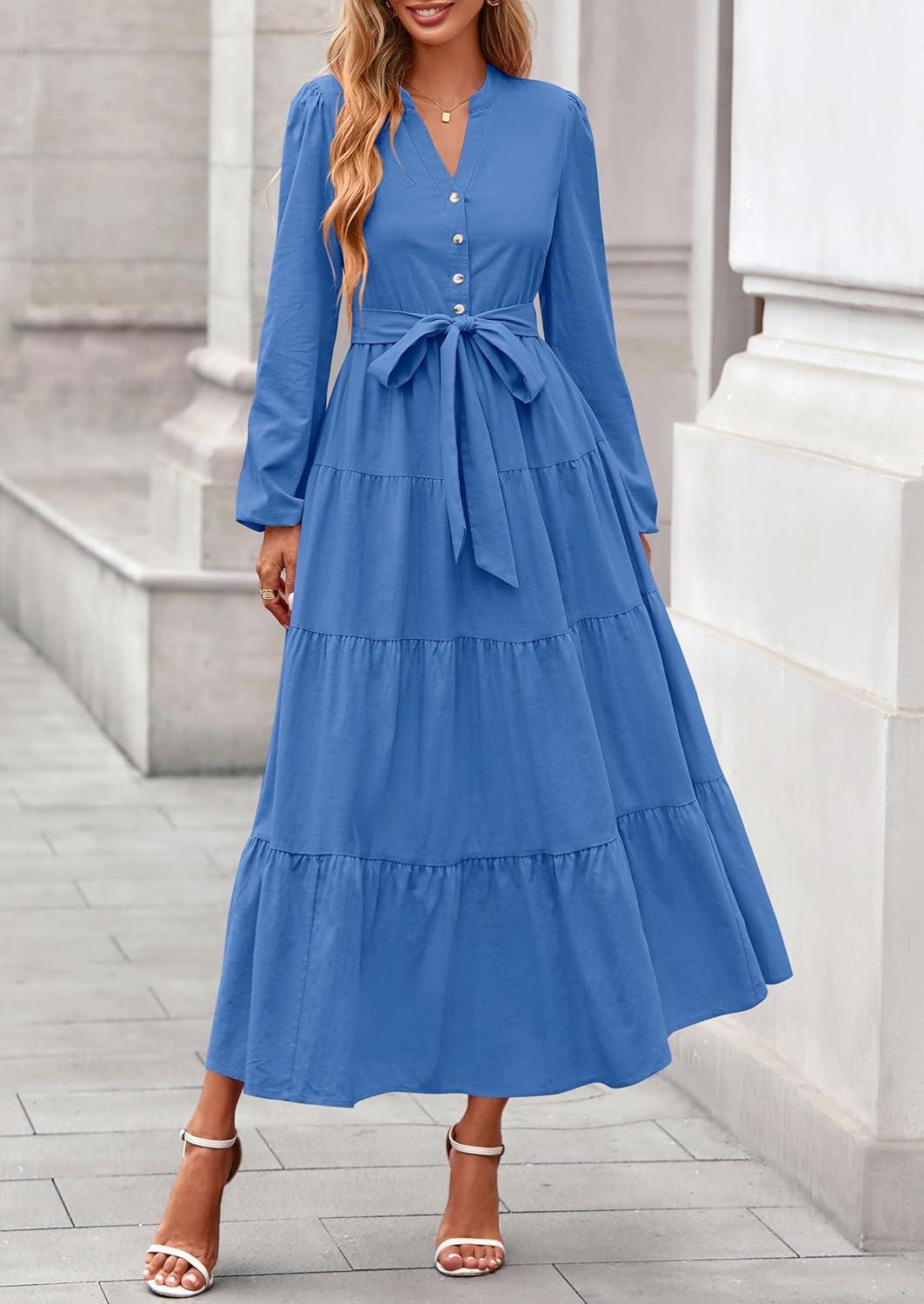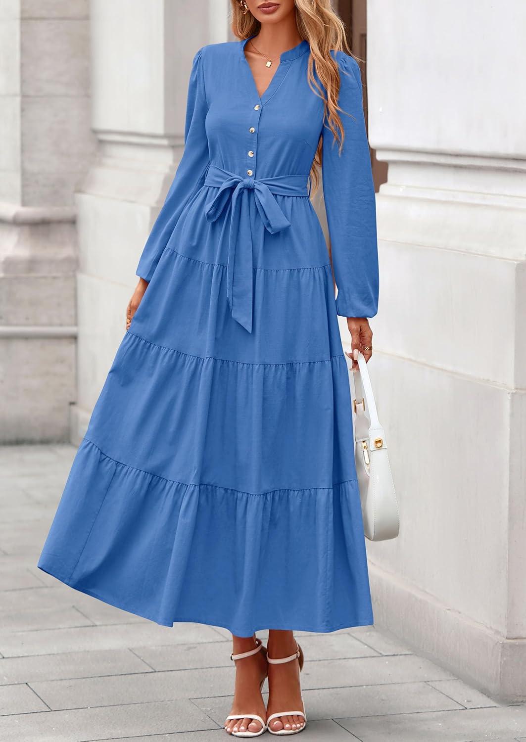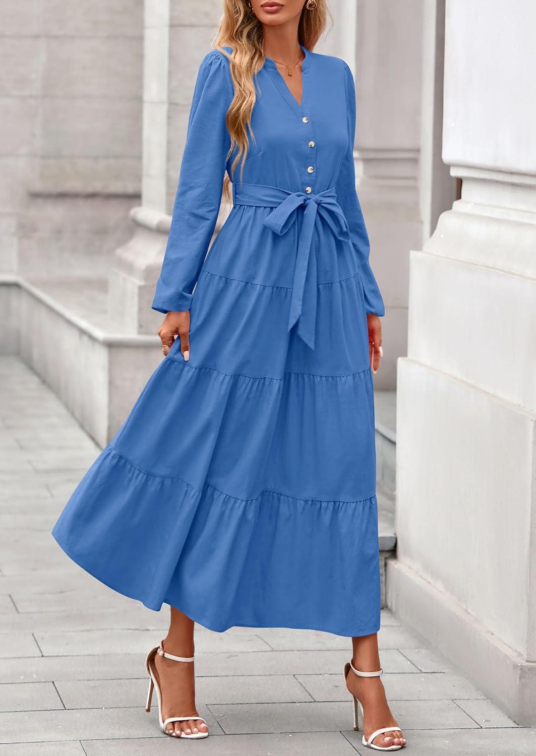 PRETTYGARDEN Fall Dresses for Women 2025 Long Sleeve V Neck Belted Ruffle A Line Flowy Boho Maxi Wedding Guest Dress Pockets(Blue)