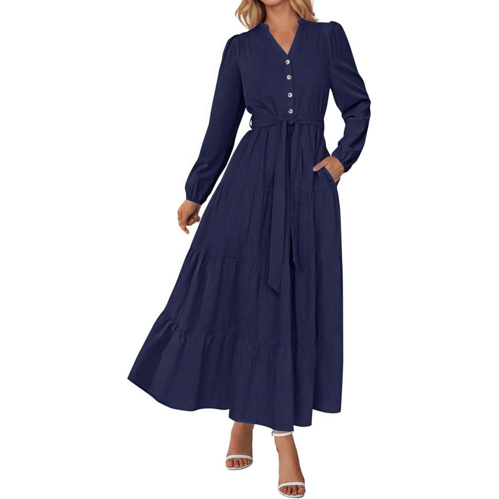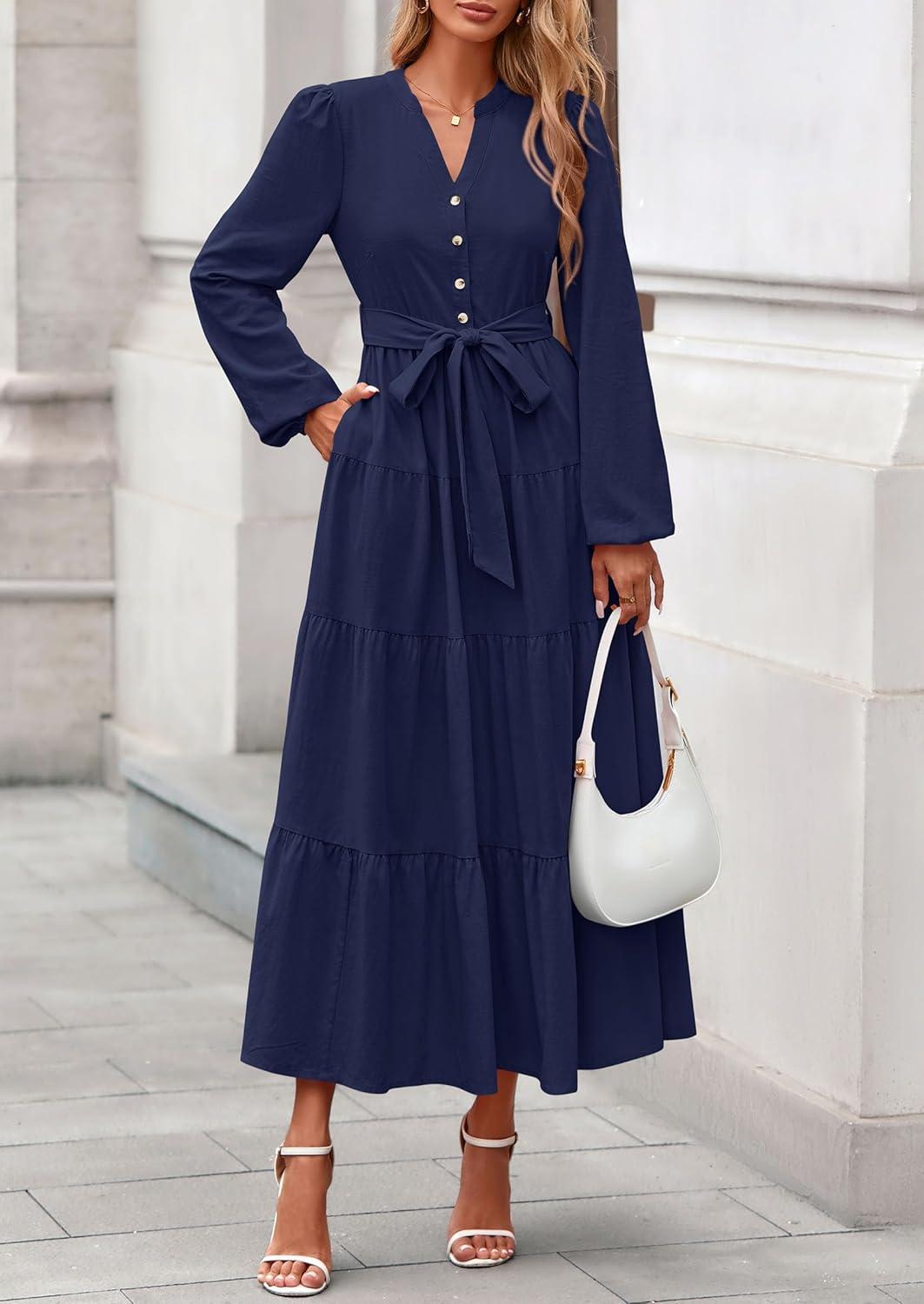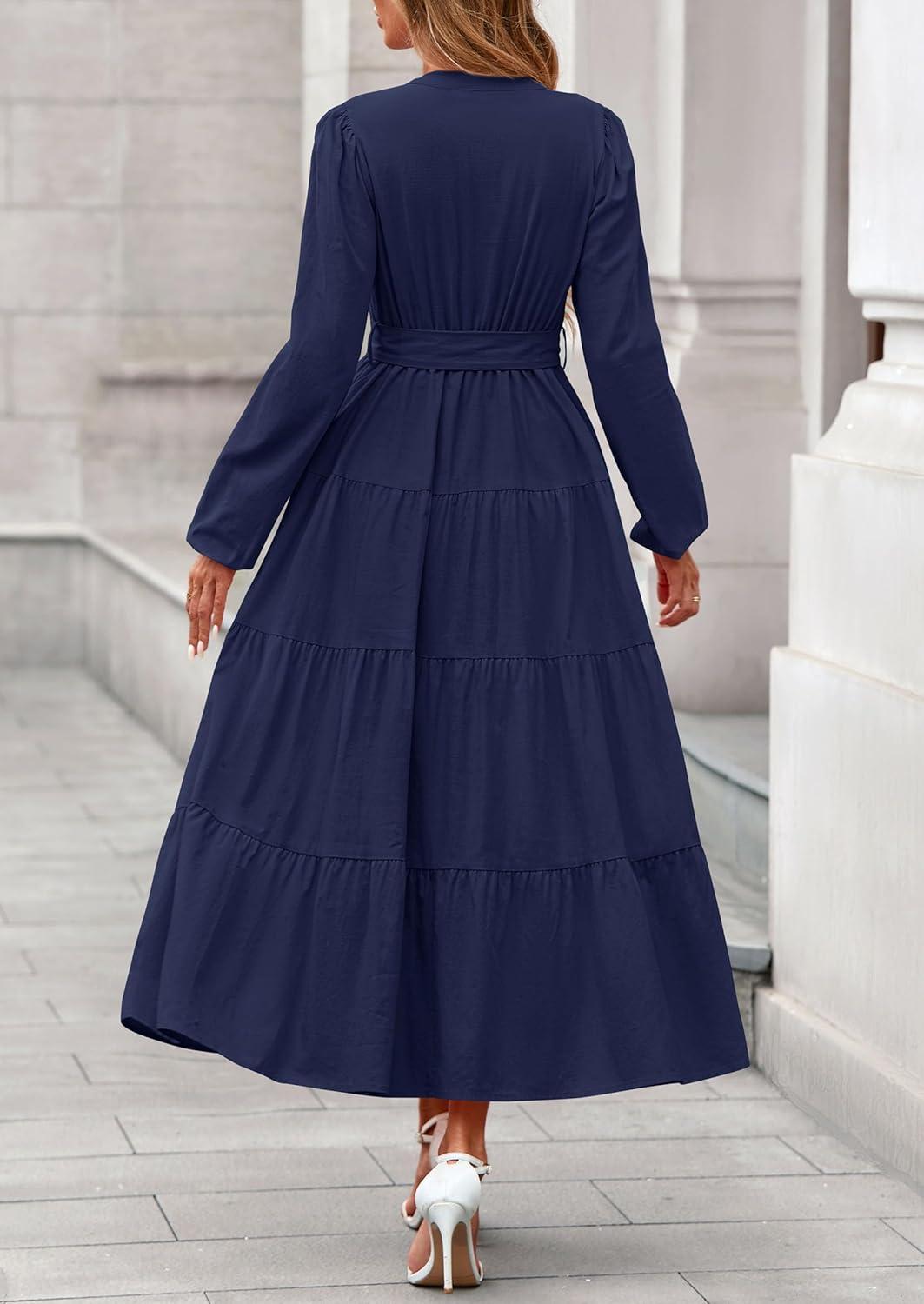 PRETTYGARDEN Fall Dresses for Women 2025 Long Sleeve V Neck Belted Ruffle A Line Flowy Boho Maxi Wedding Guest Dress Pockets(Navy Blue)