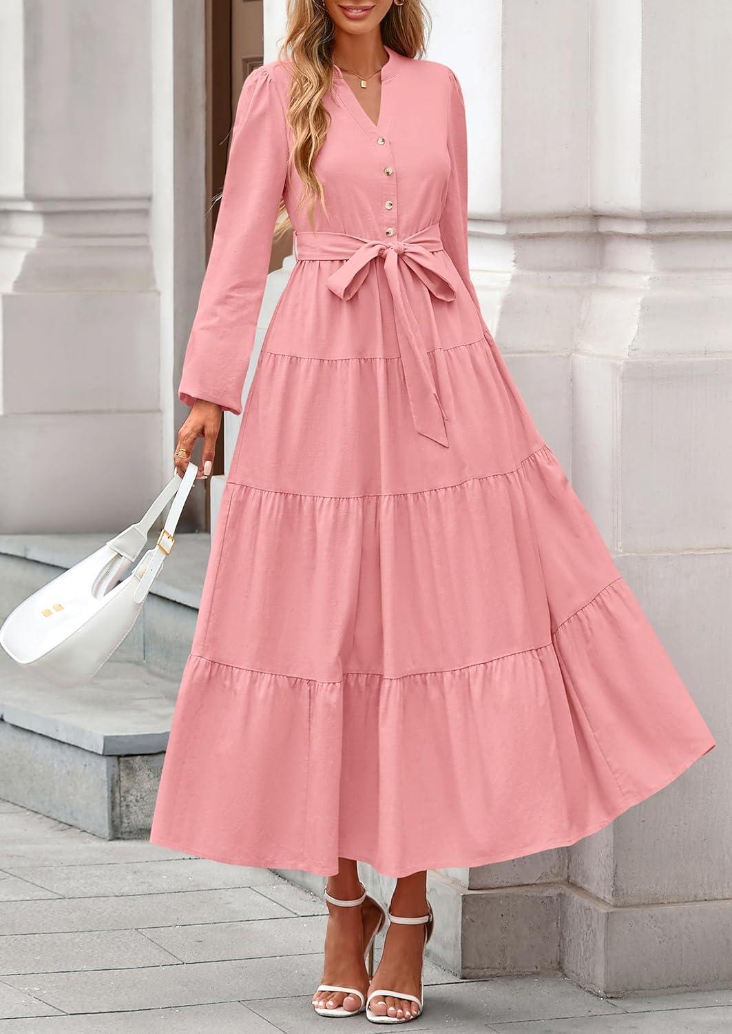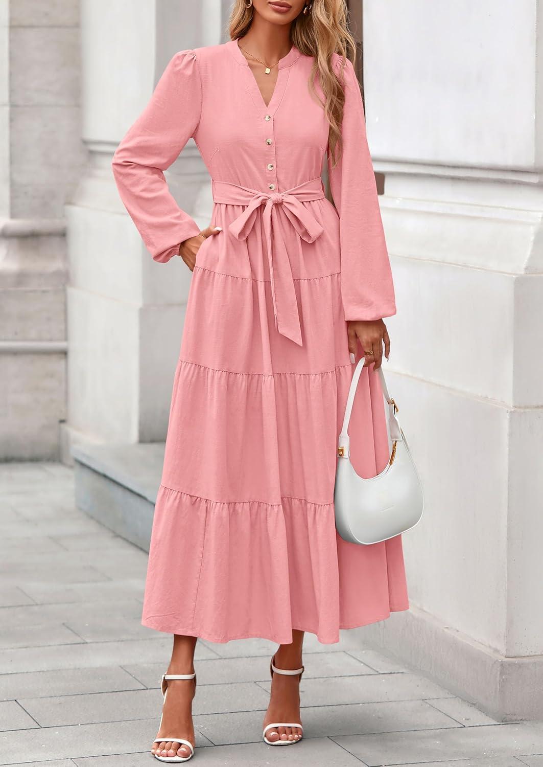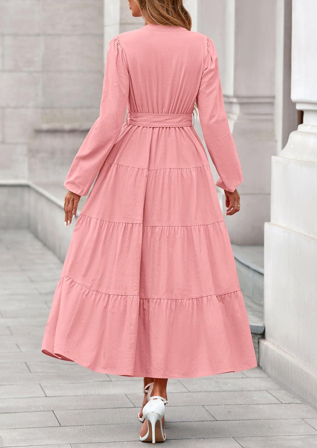 PRETTYGARDEN Fall Dresses for Women 2025 Long Sleeve V Neck Belted Ruffle A Line Flowy Boho Maxi Wedding Guest Dress Pockets(Pink)