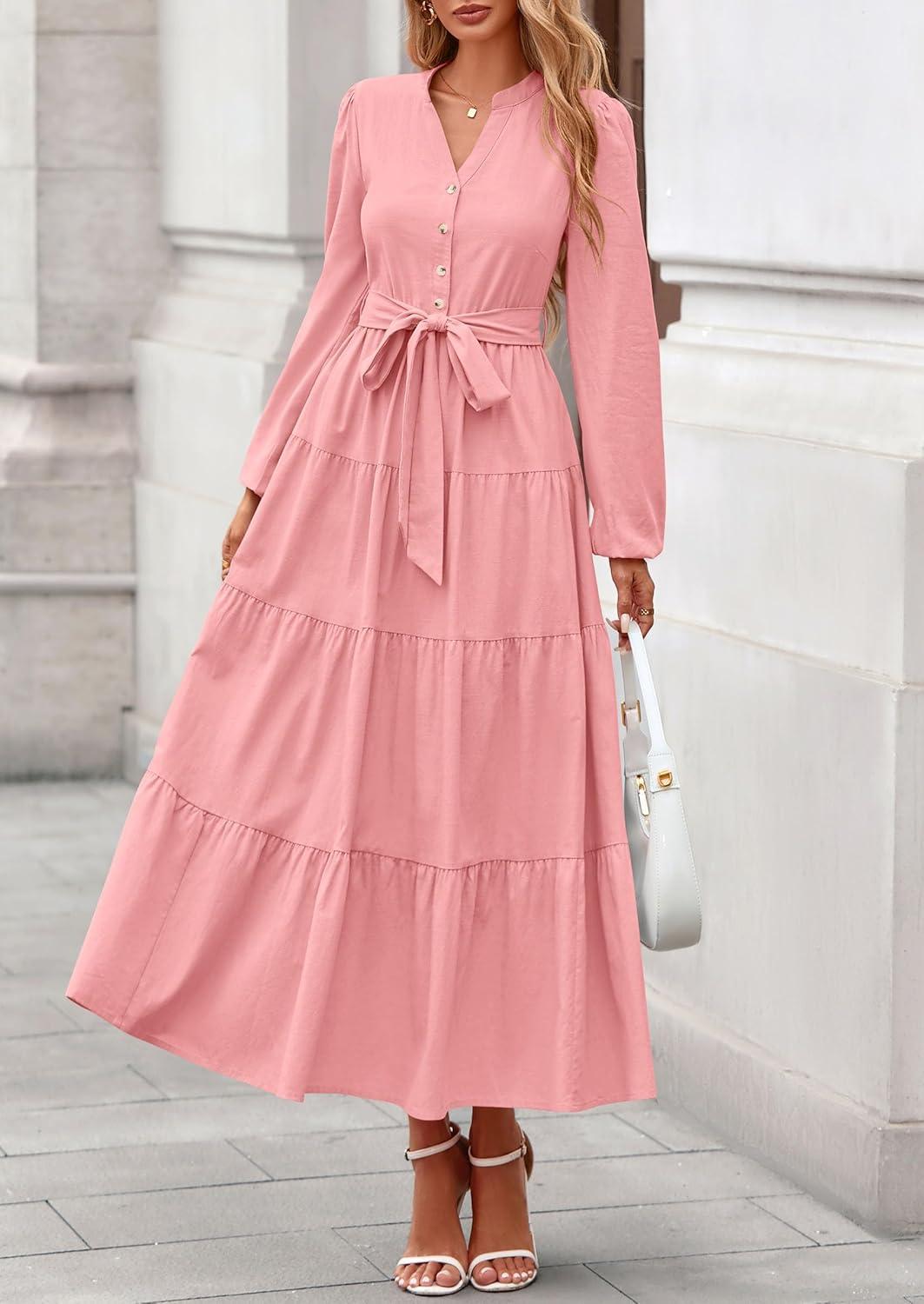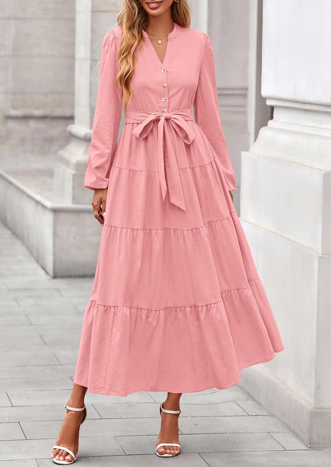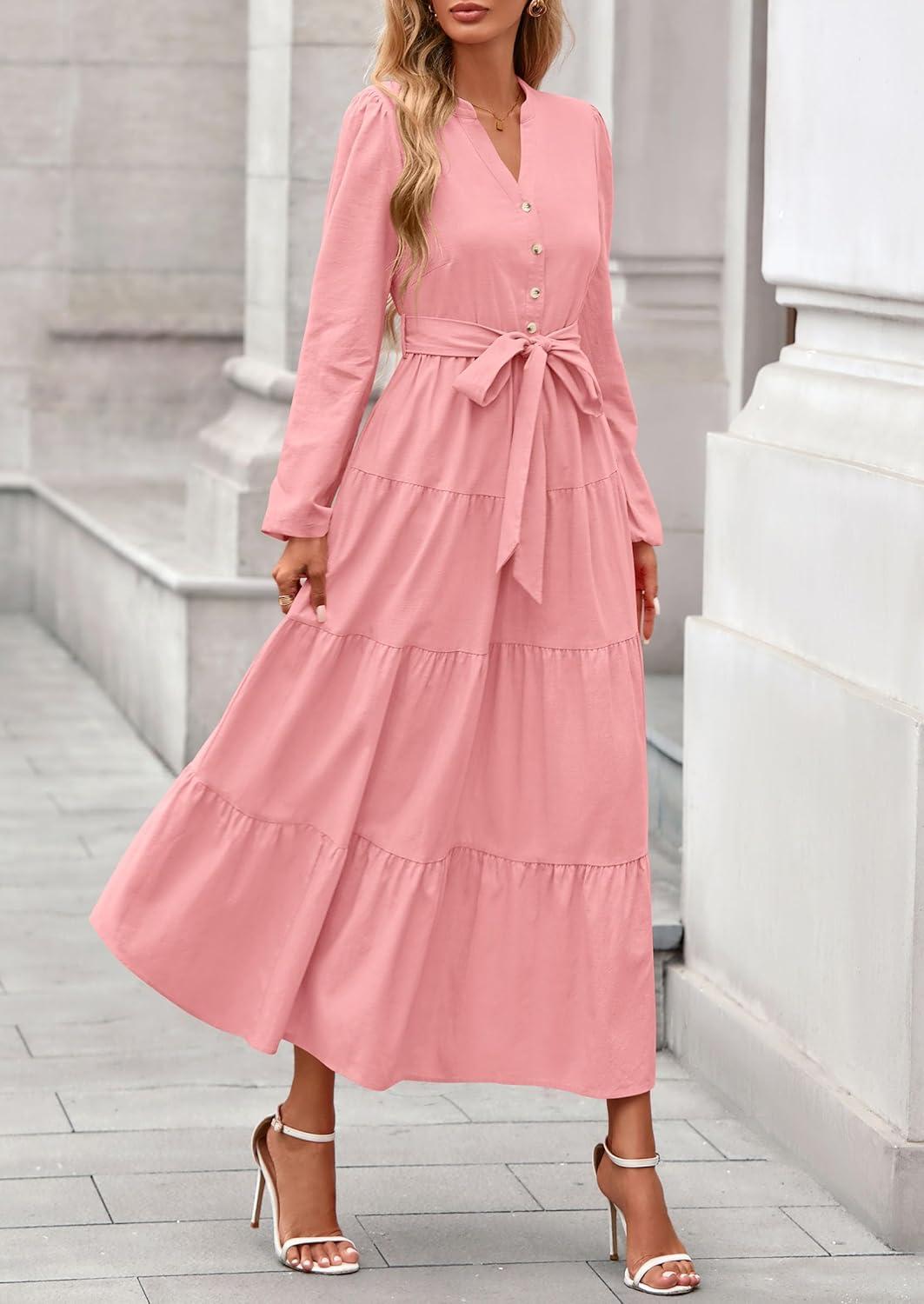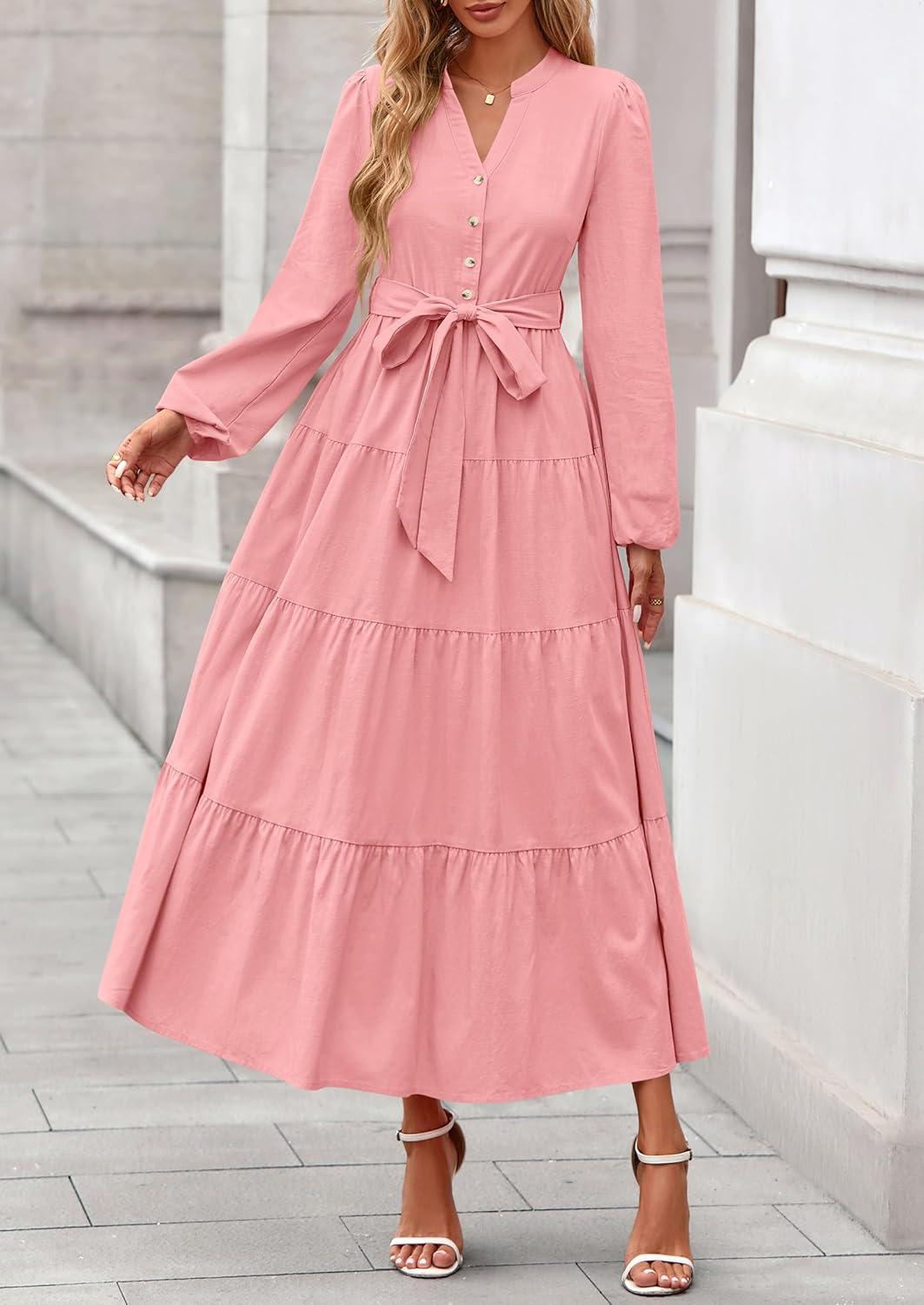PRETTYGARDEN Fall Dresses for Women 2025 Long Sleeve V Neck Belted Ruffle A Line Flowy Boho Maxi Wedding Guest Dress Pockets(Pink)