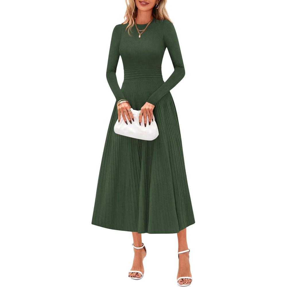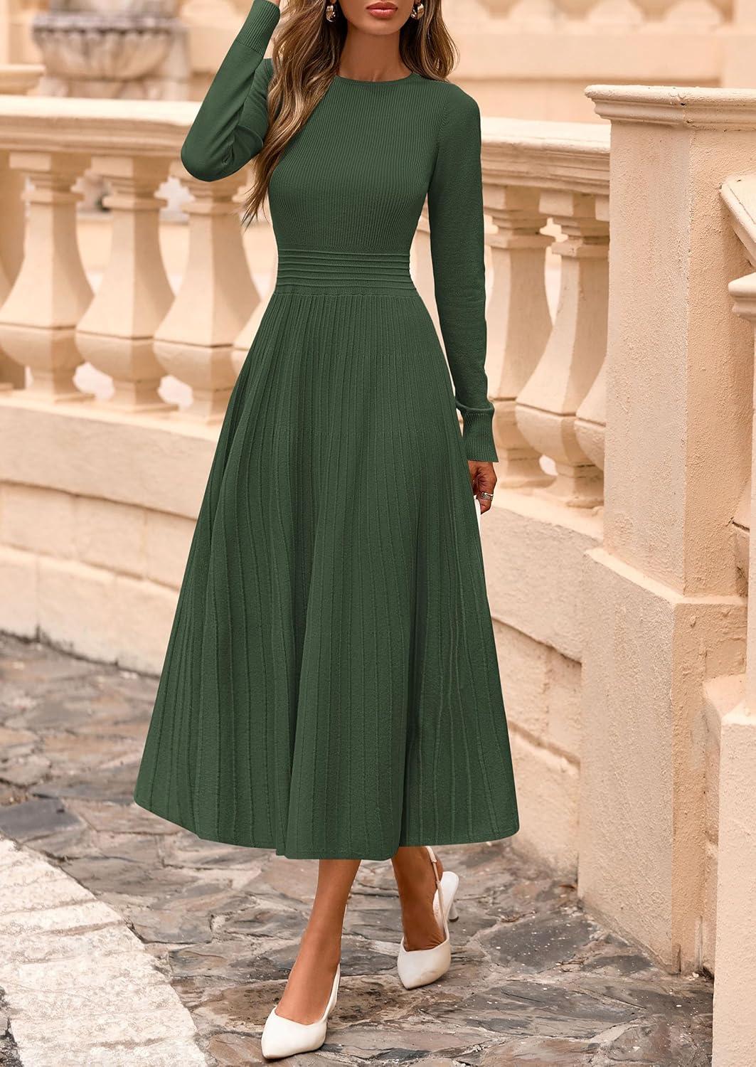 PRETTYGARDEN Fall Dresses for Women 2025 Long Sleeve Work Casual A Line Pleated Cocktail Church Midi Winter Sweater Dress(Army Green)
