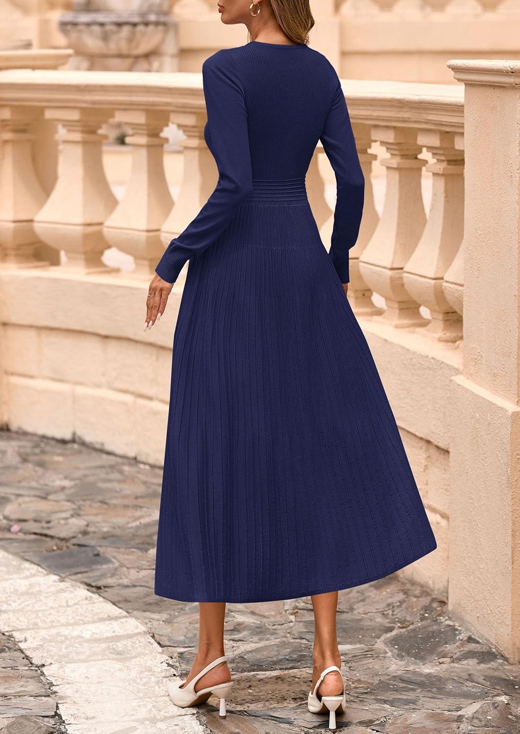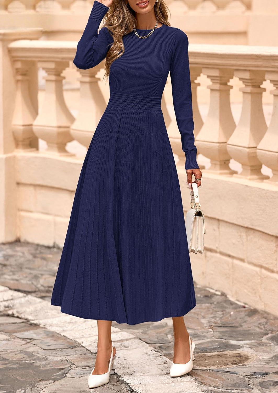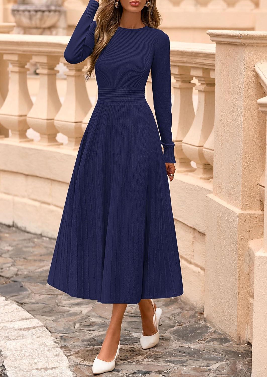 PRETTYGARDEN Fall Dresses for Women 2025 Long Sleeve Work Casual A Line Pleated Cocktail Church Midi Winter Sweater Dress(Navy Blue)