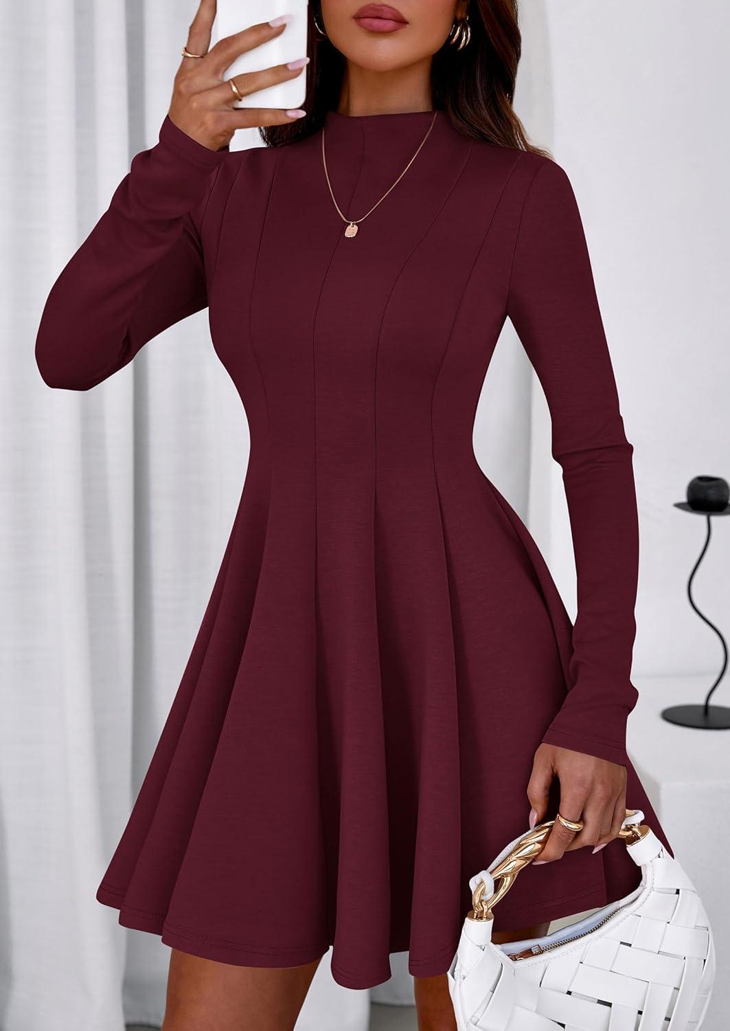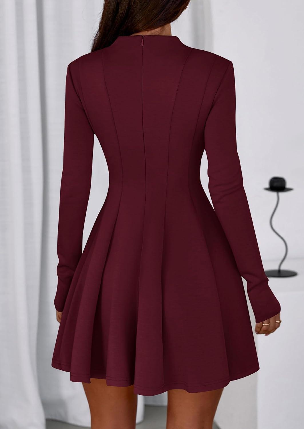 PRETTYGARDEN Fall Dresses for Women Elegant Classy 2025 Casual Long Sleeve Swing A Line Ruffle Short Homecoming Party Dress(Burgundy)