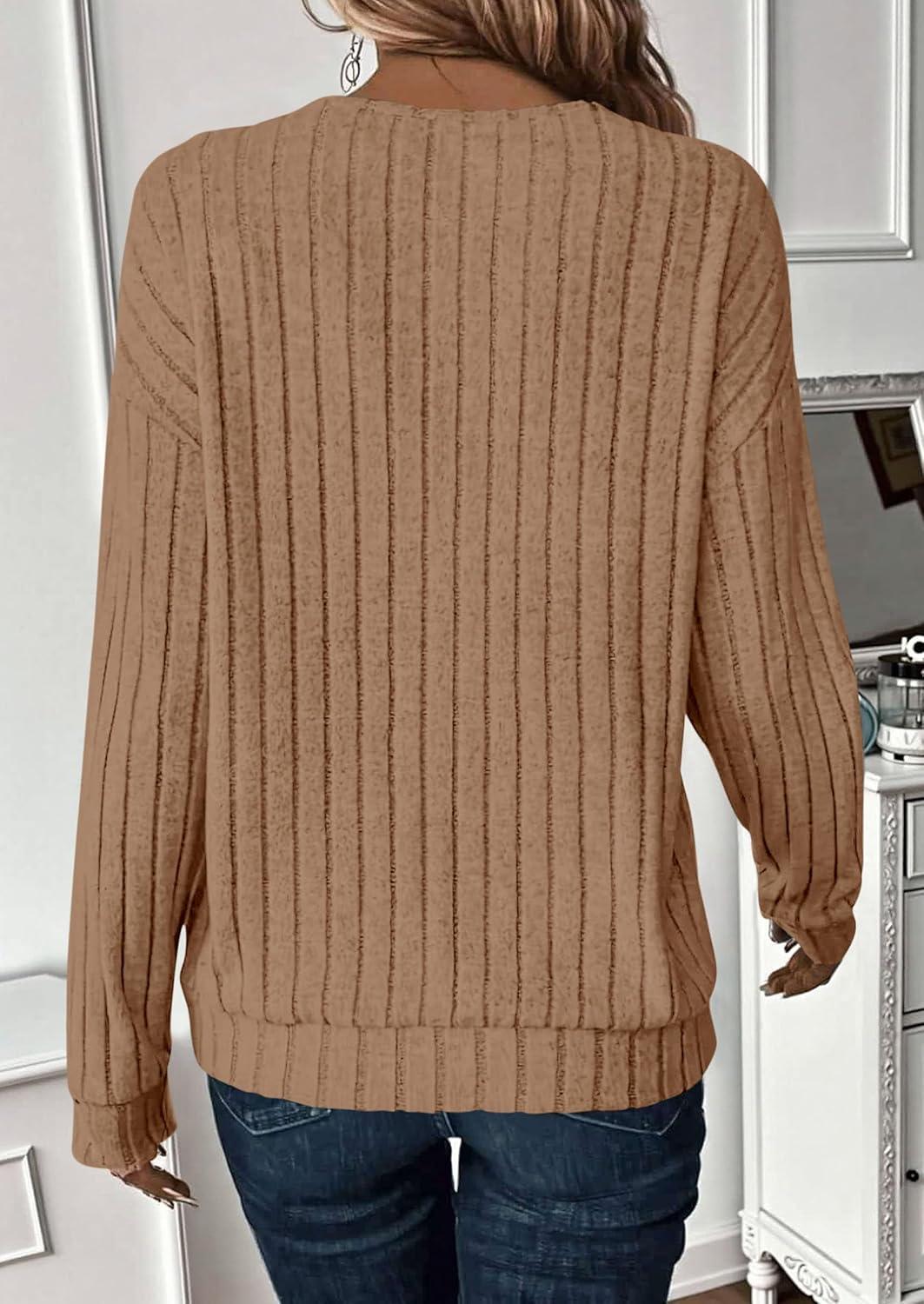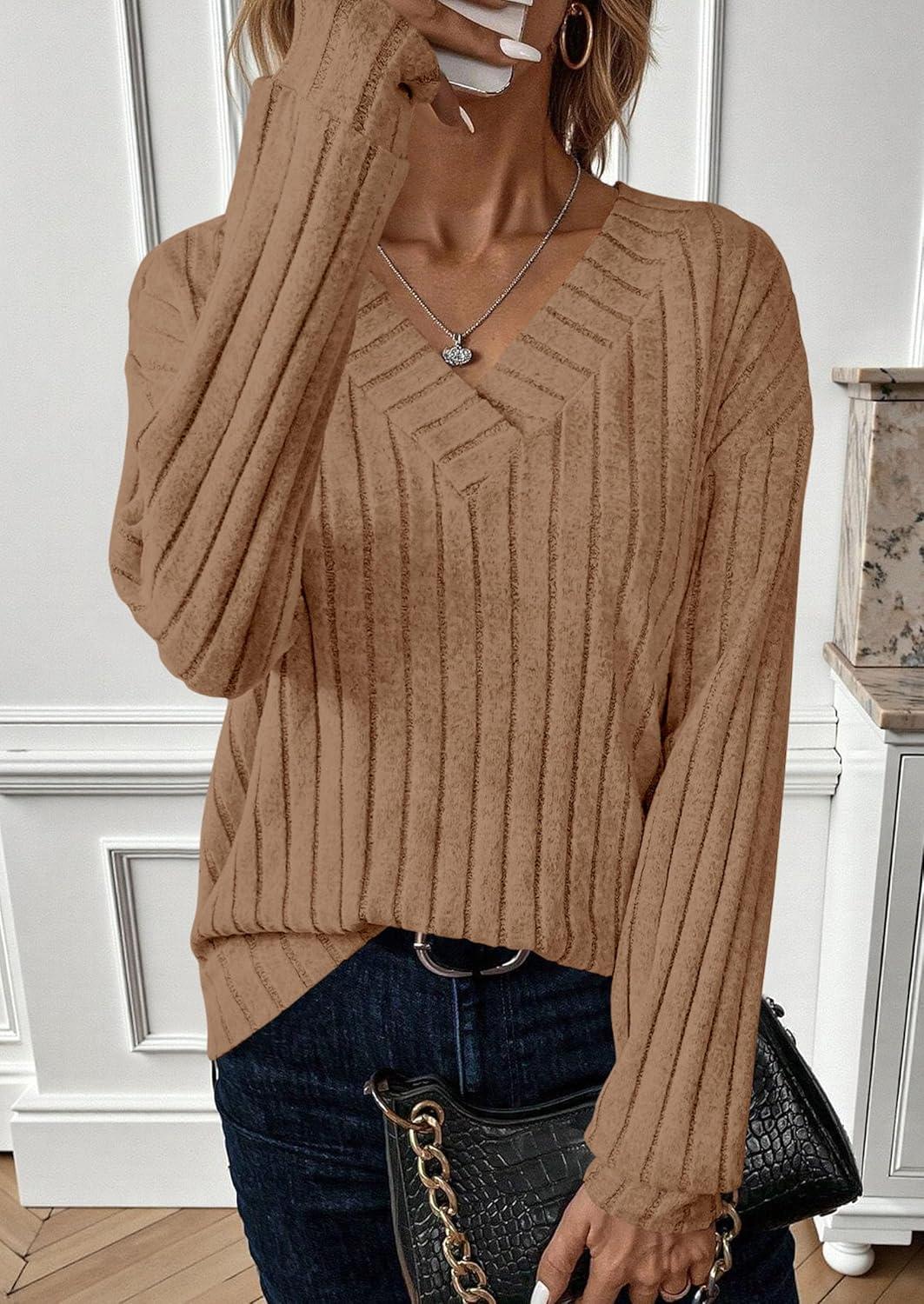 PRETTYGARDEN Fall Fashion 2025 Long Sleeve Shirts for Women Ribbed Knit V Neck Dressy Casual Lightweight Sweaters Tunic Tops(Khaki)