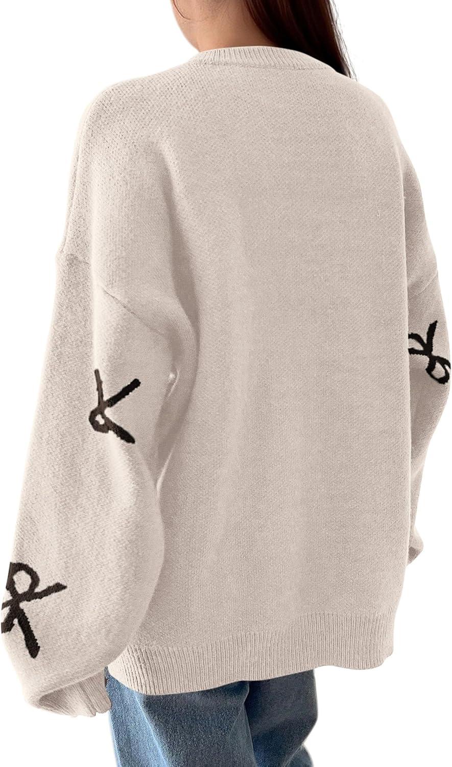imagePRETTYGARDEN Fall Long Sleeve Pullover Sweaters for Women 2025 Trendy Crewneck Casual Cute Bow Chunky Knit Oversized SweaterBeige