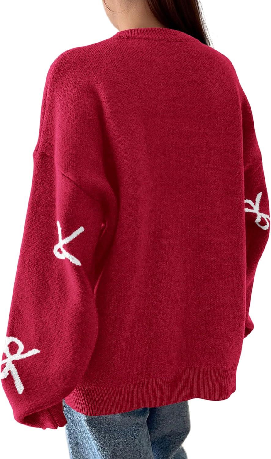 imagePRETTYGARDEN Fall Long Sleeve Pullover Sweaters for Women 2025 Trendy Crewneck Casual Cute Bow Chunky Knit Oversized SweaterRed