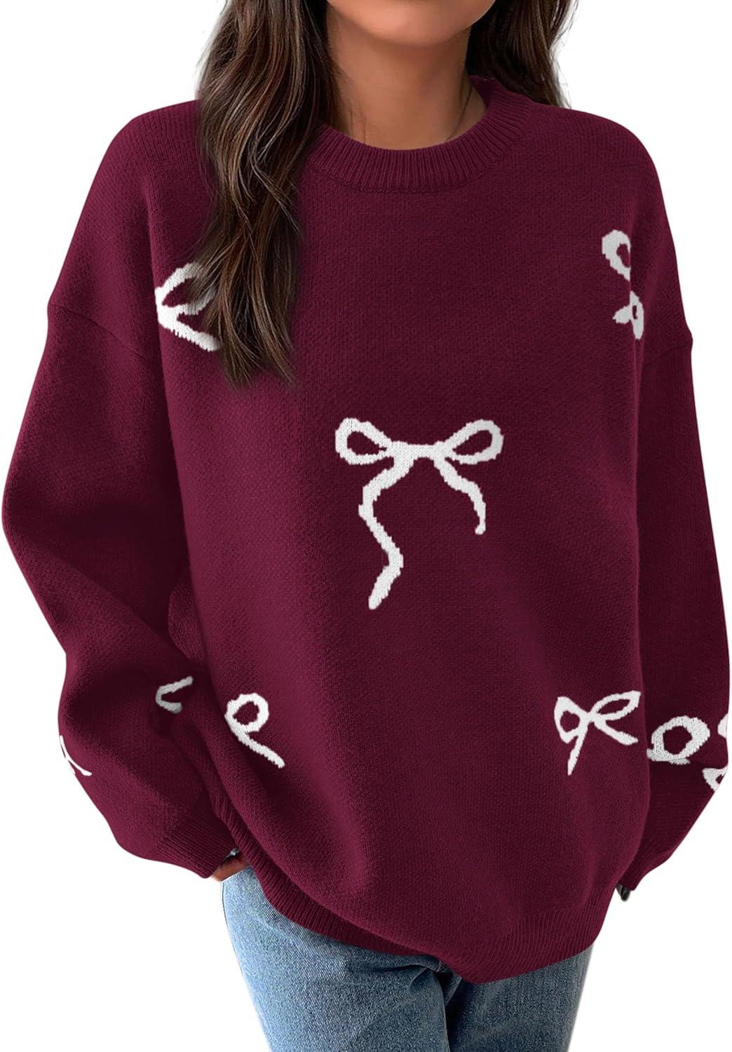 PRETTYGARDEN Fall Long Sleeve Pullover Sweaters for Women 2025 Trendy Crewneck Casual Cute Bow Chunky Knit Oversized Sweater(Wine Red)