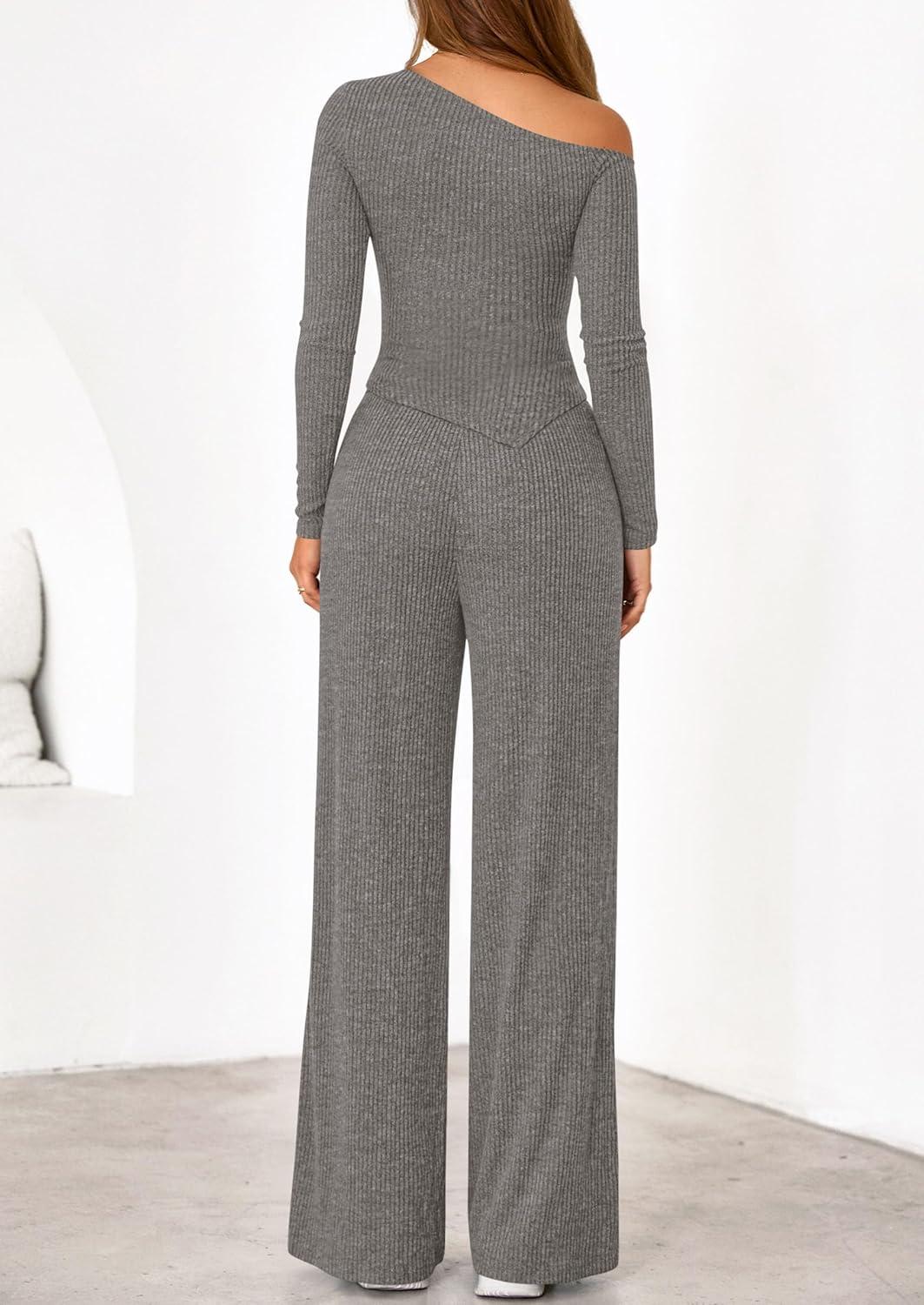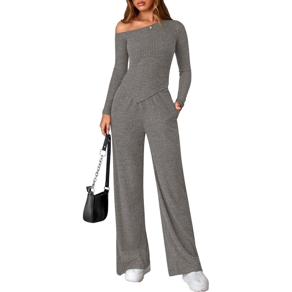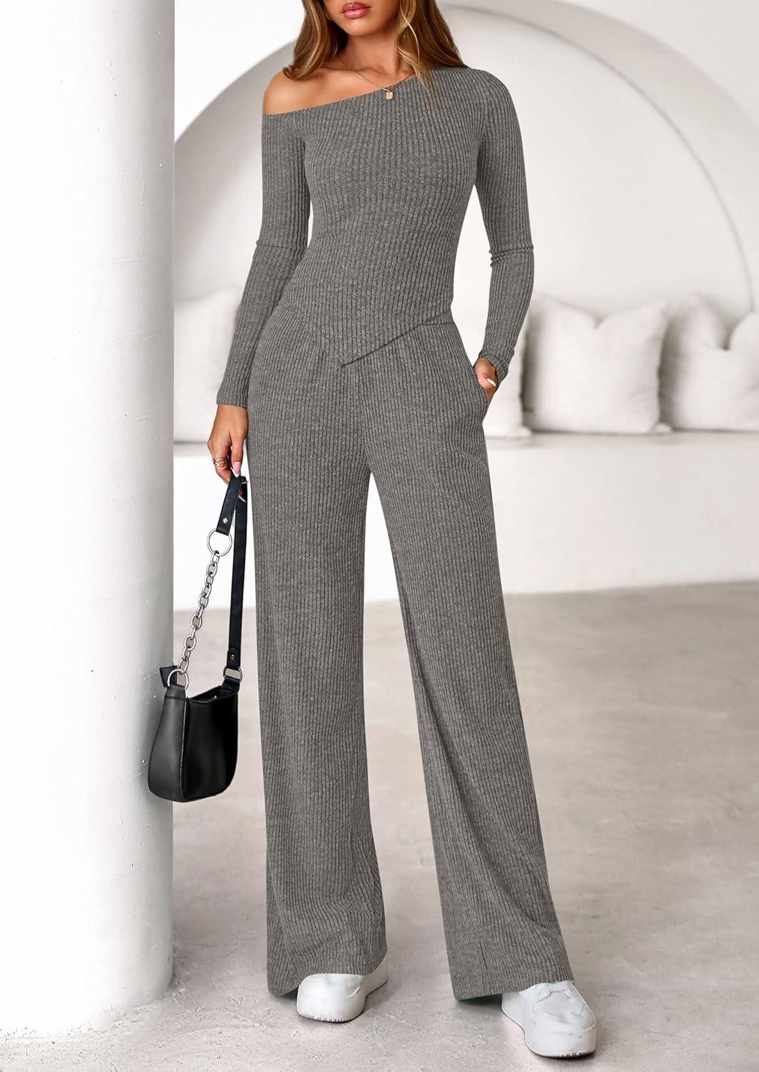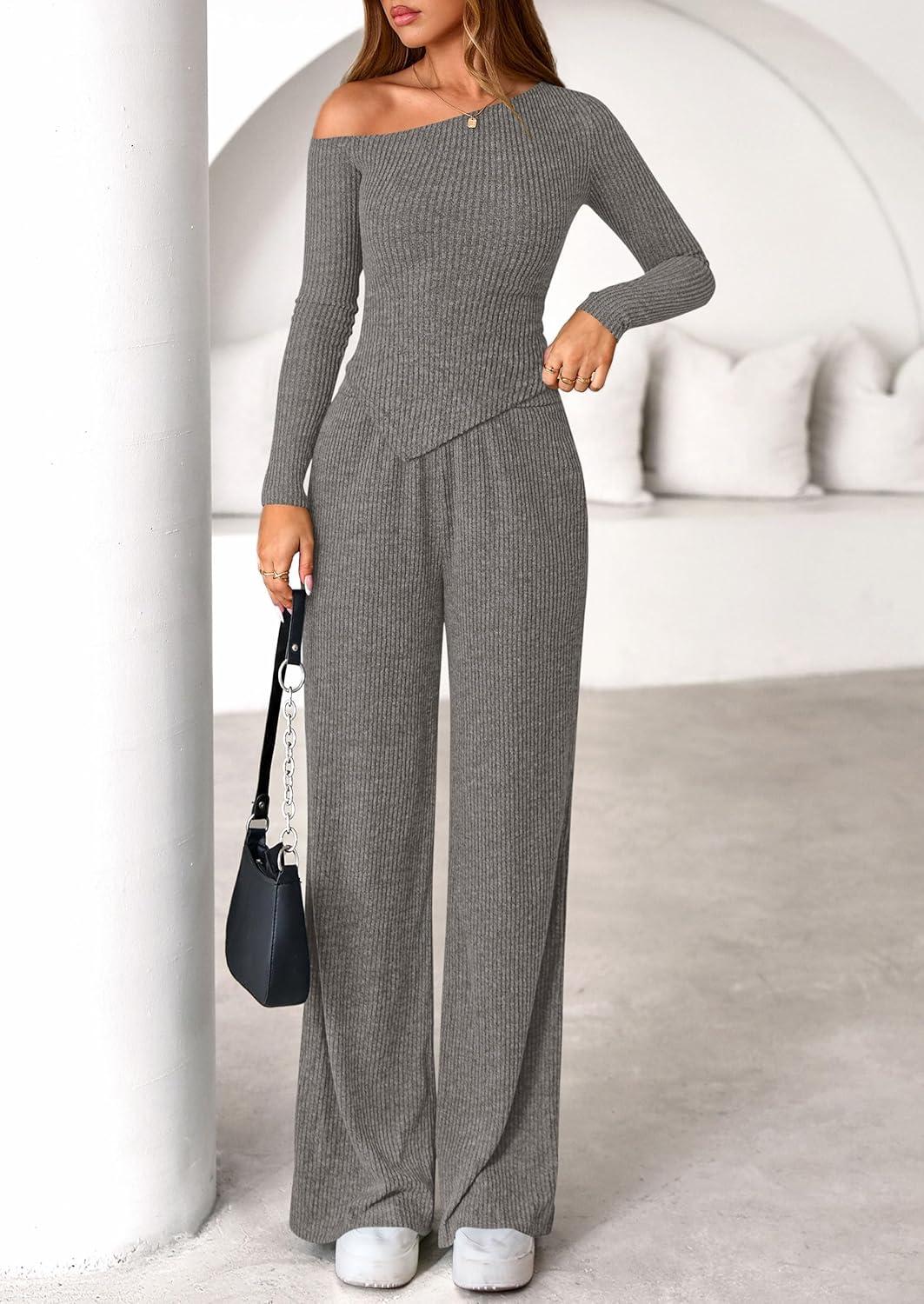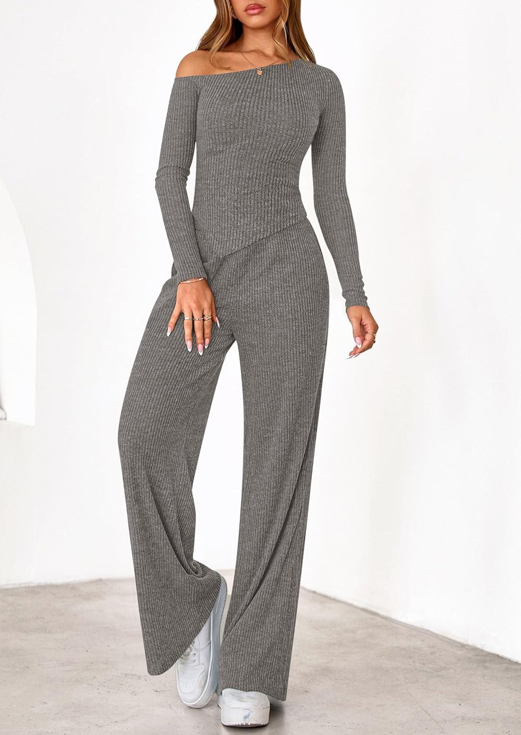 PRETTYGARDEN Fall Two Piece Sets For Women 2025 Off Shoulder Tops Long Pants Knit Matching Lounge Set Airport Travel Outfits(Grey)