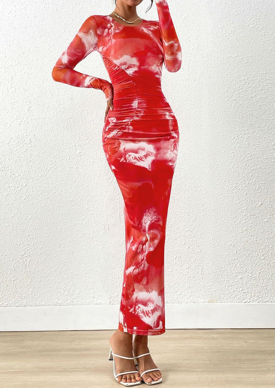PRETTYGARDEN Fall Wedding Guest Dresses for Women 2025 Long Sleeve Ruched Sexy Bodycon Floral Mesh Cocktail Party Maxi Dress(Brick Red Floral)
