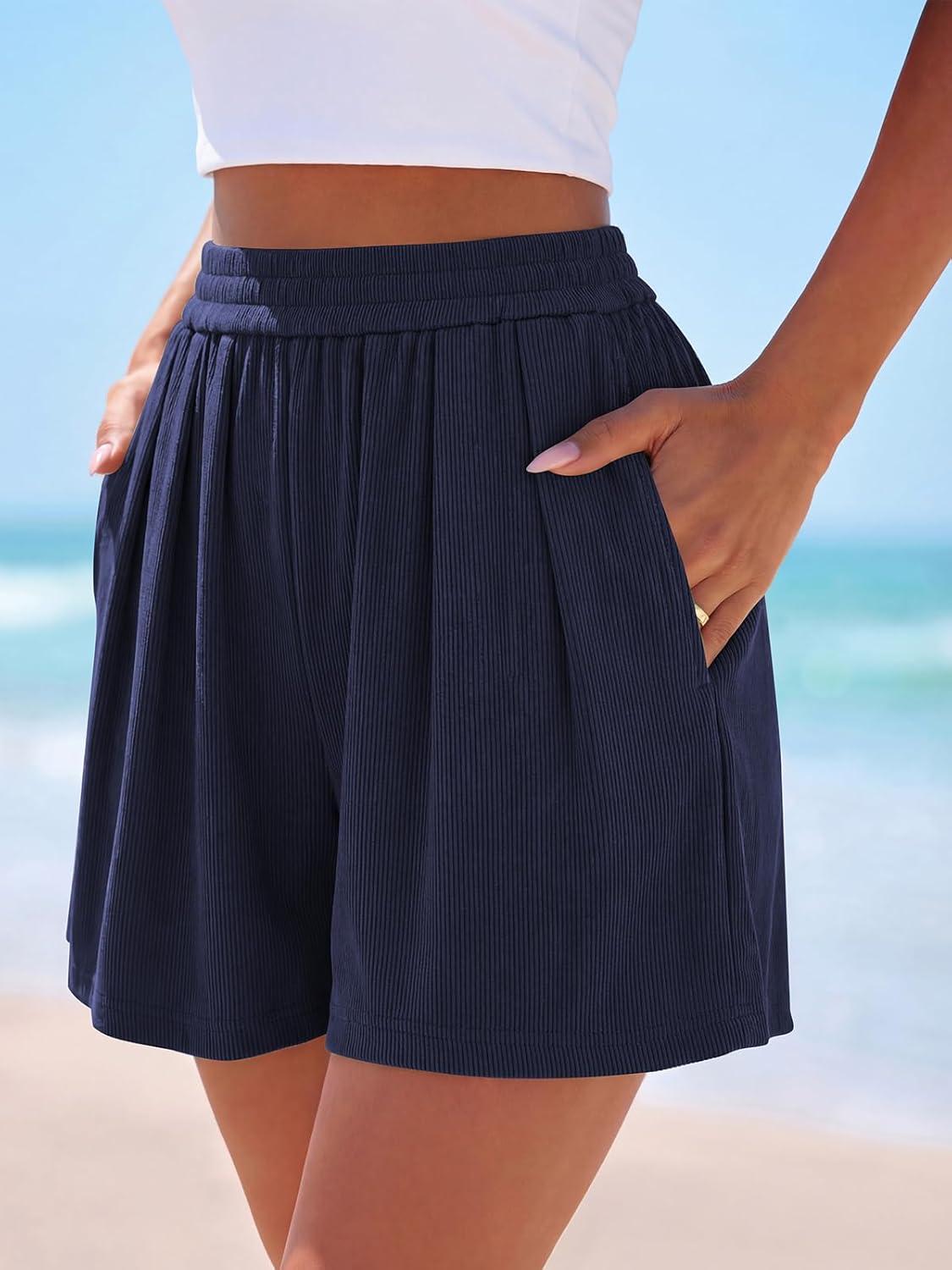 PRETTYGARDEN Flowy Summer Shorts for Women High Waisted Wide Leg Knitted Wide Leg Soft Pajama Shorts Women Vacation Outfits(Navy Blue)
