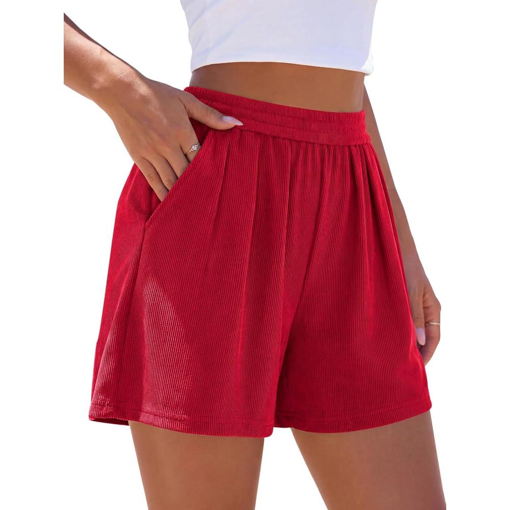PRETTYGARDEN Flowy Summer Shorts for Women High Waisted Wide Leg Knitted Wide Leg Soft Pajama Shorts Women Vacation Outfits(Red)
