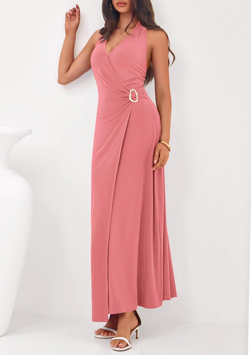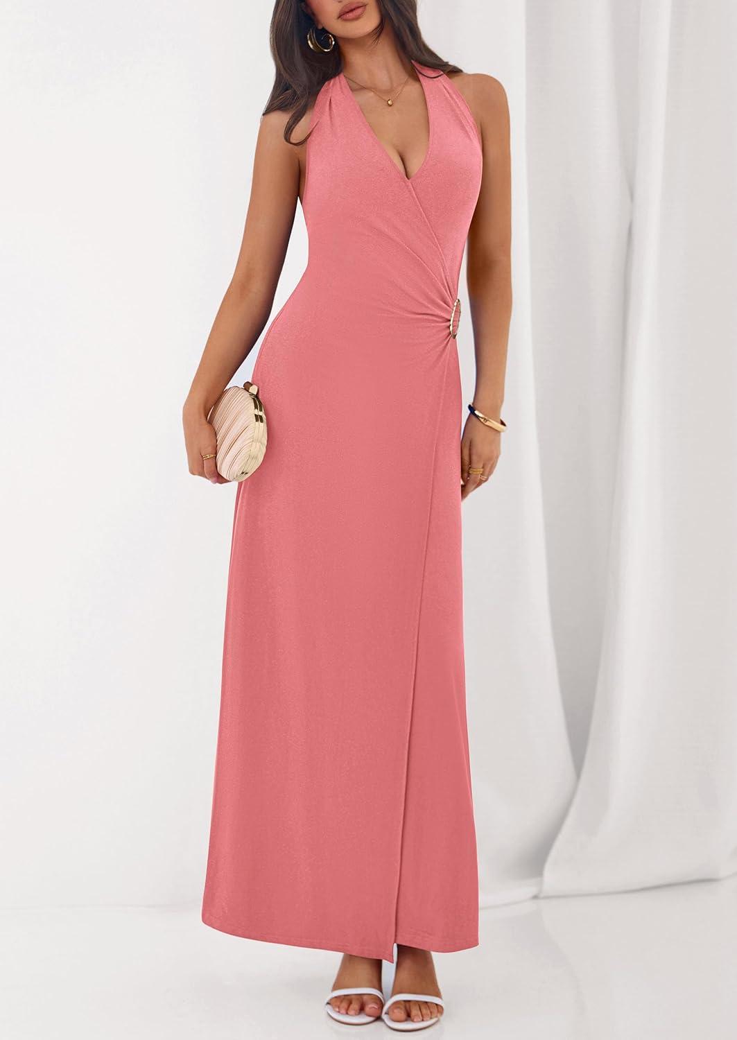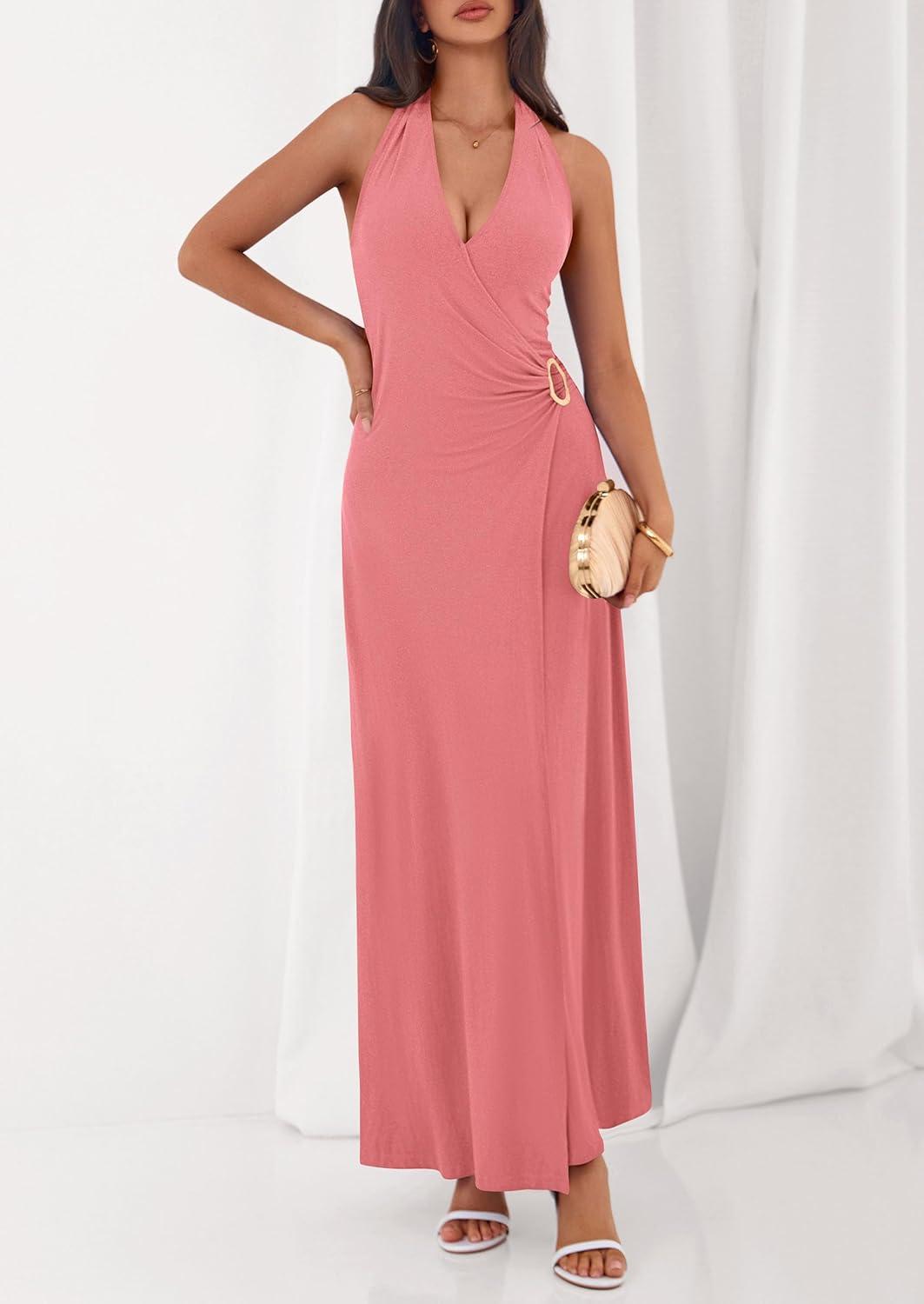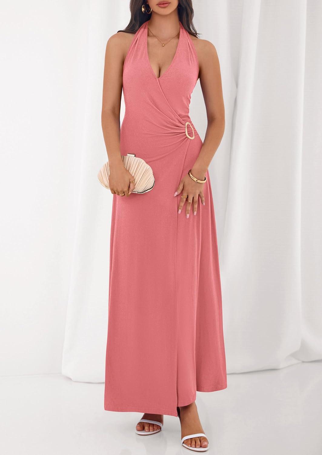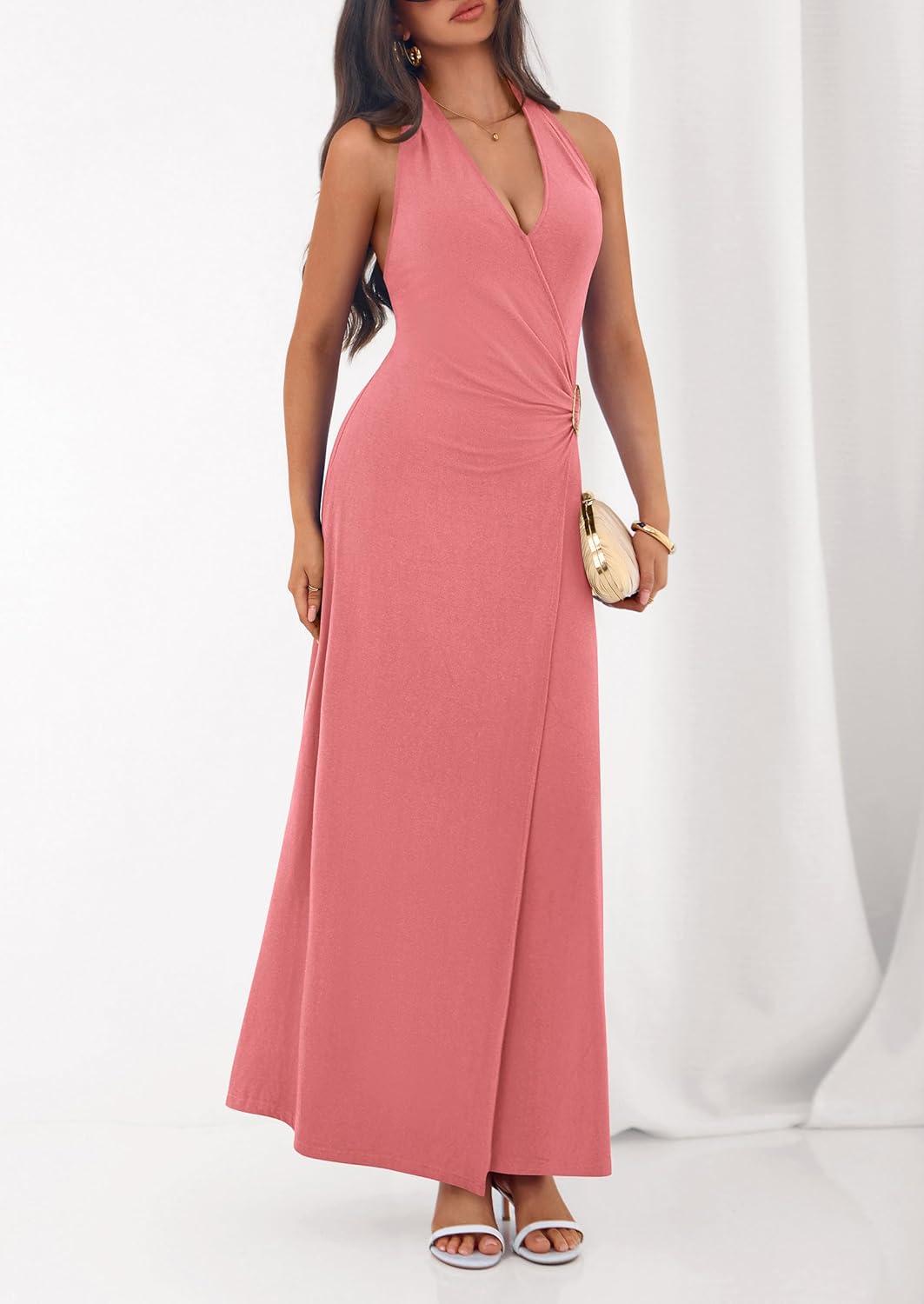 PRETTYGARDEN Holiday Cocktail Dresses for Women 2026 Summer Elegant V Neck Halter Backless Wedding Guest Party Midi Dress(Pink)