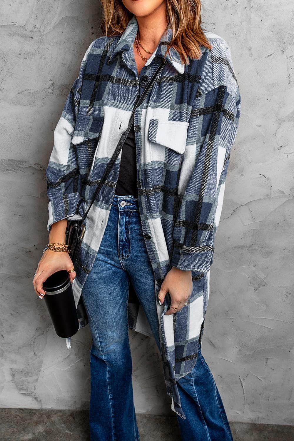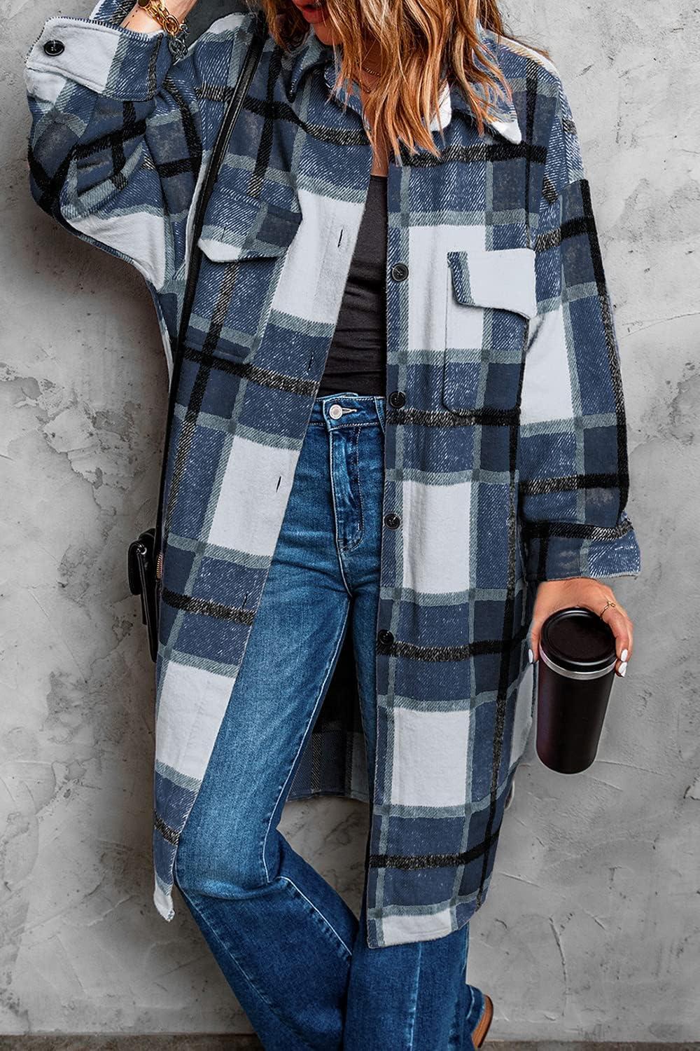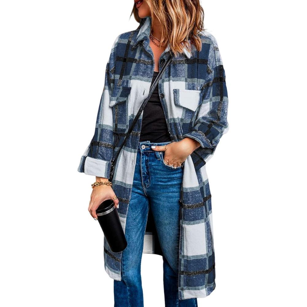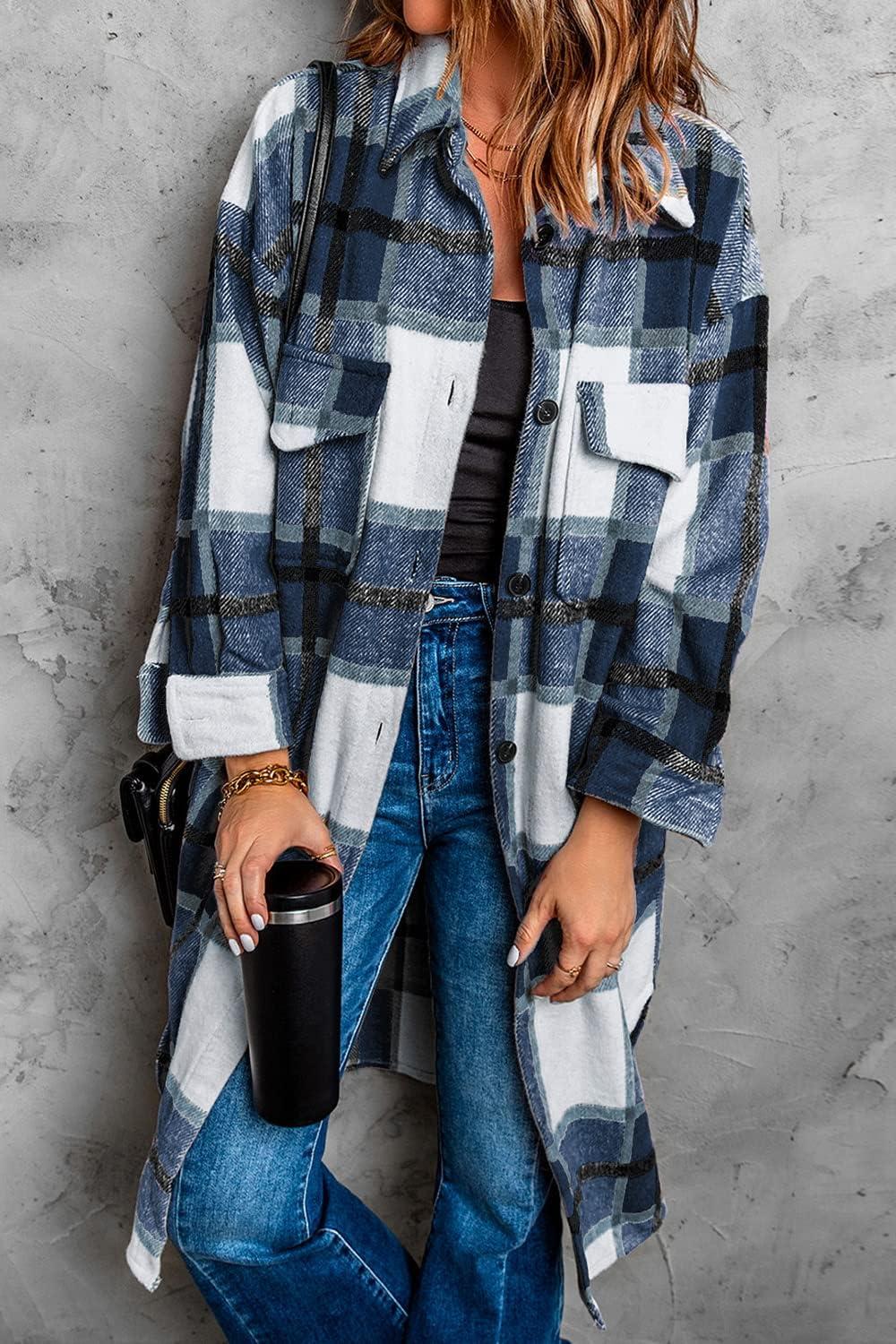 PRETTYGARDEN Jackets for Women 2025 Fall Plaid Shacket Long Sleeve Button Down Flannel Shirts Winter Coats Fashion Clothing(Navy)