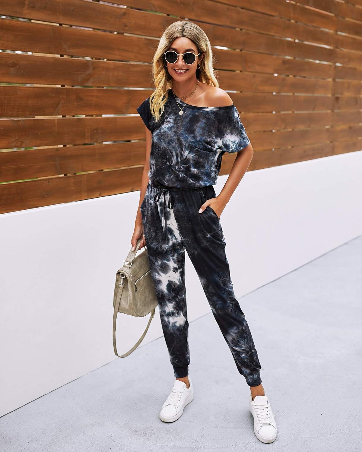 PRETTYGARDEN Jumpsuits for Women 2025 Dressy Casual Off Shoulder Romper Outfits Spring Vacation Travel Summer Lounge Clothes(Tie Dye-black)
