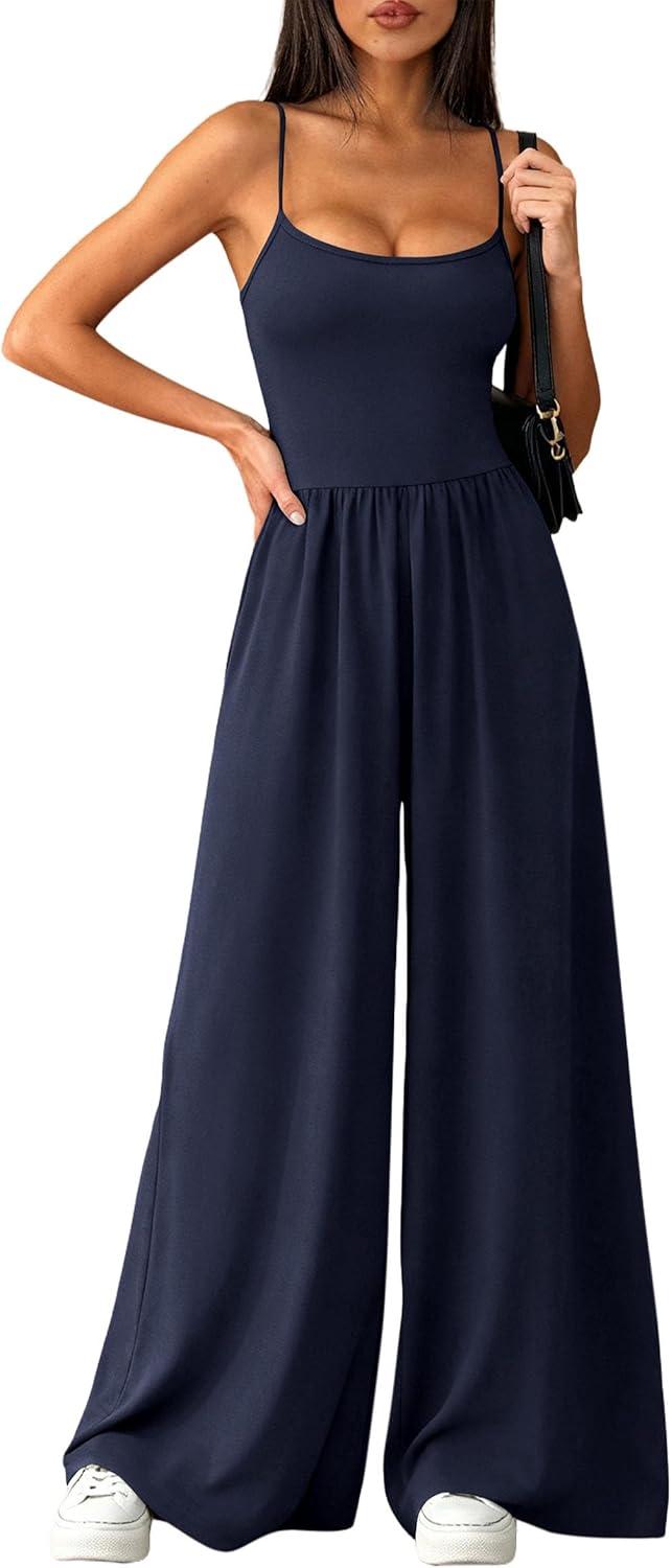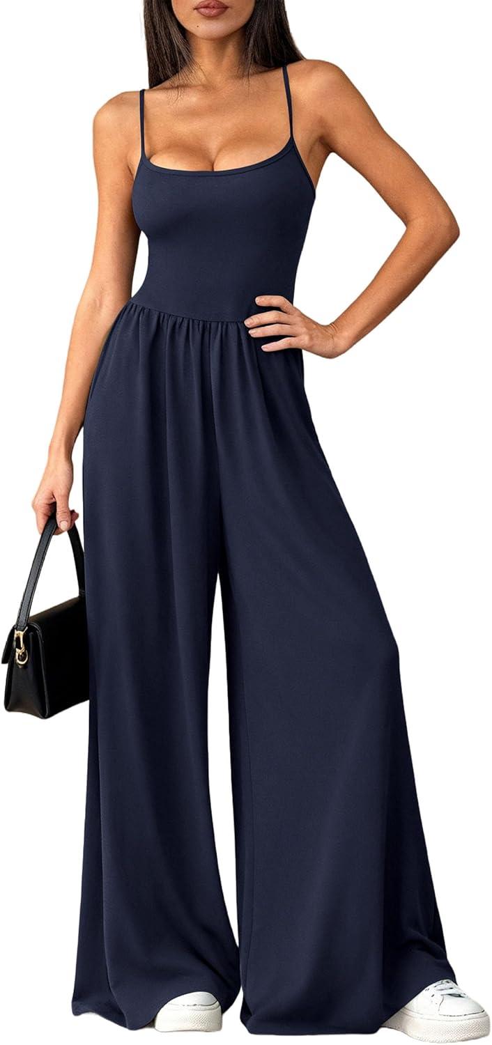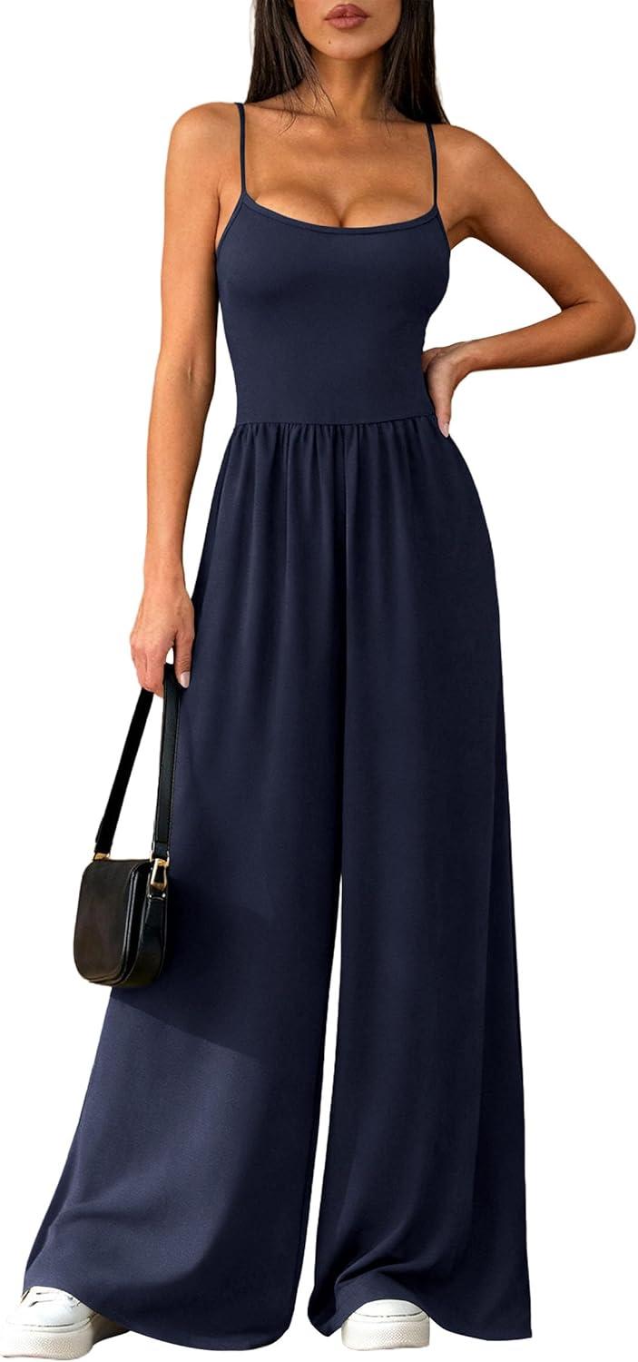 PRETTYGARDEN Jumpsuits for Women 2026 Sleeveless Strap Wide Leg Date Night Rompers Beach Vacation One Piece Summer Outfits(Navy Blue)